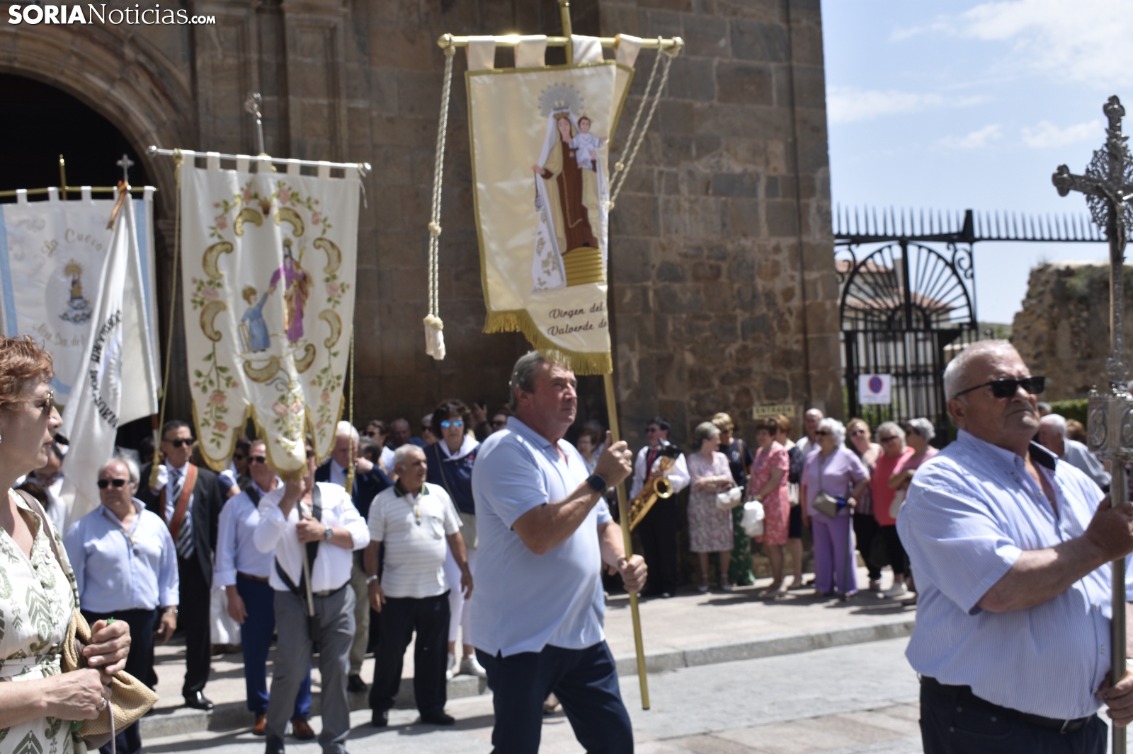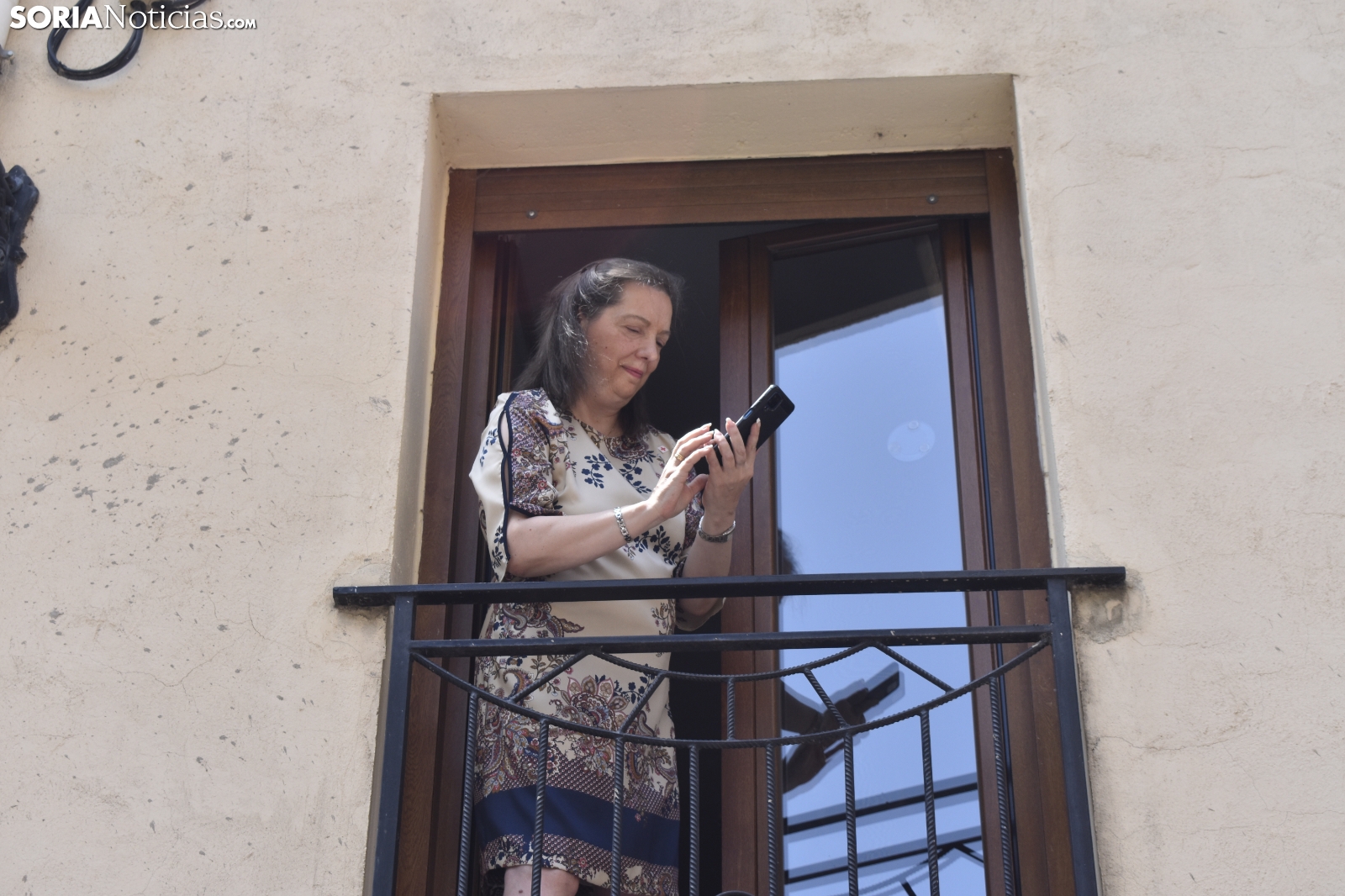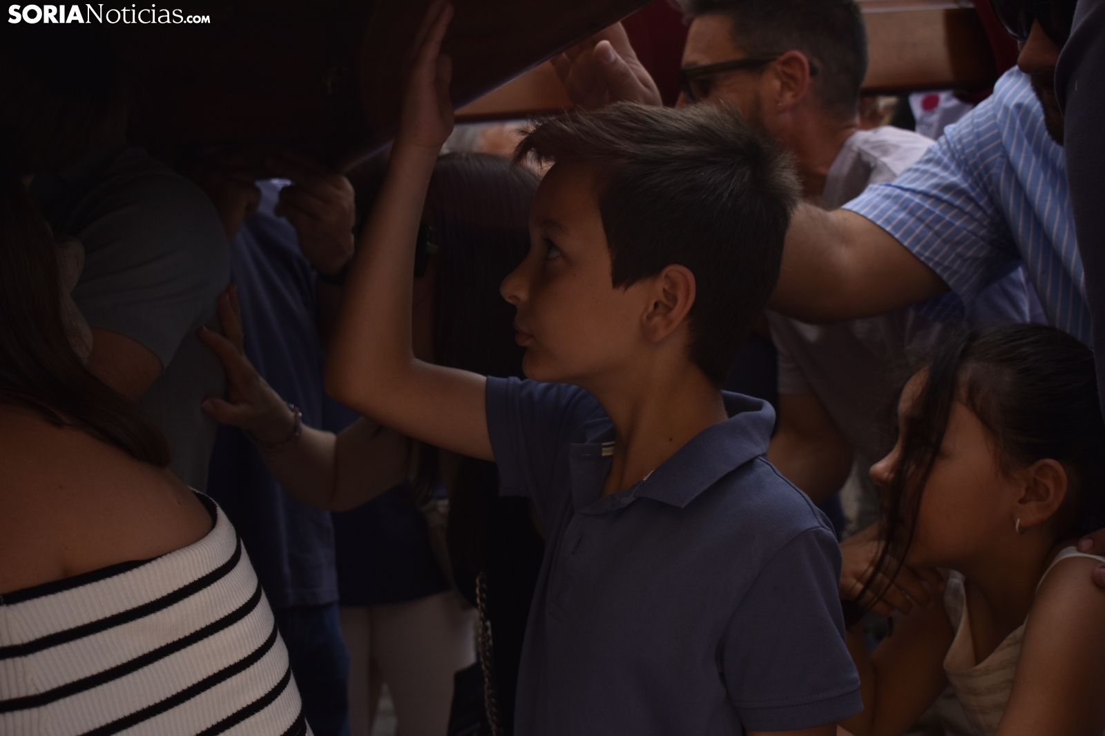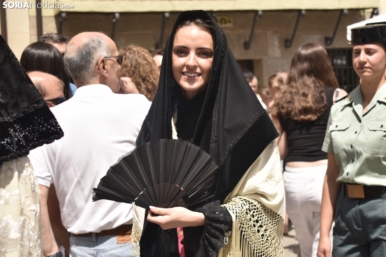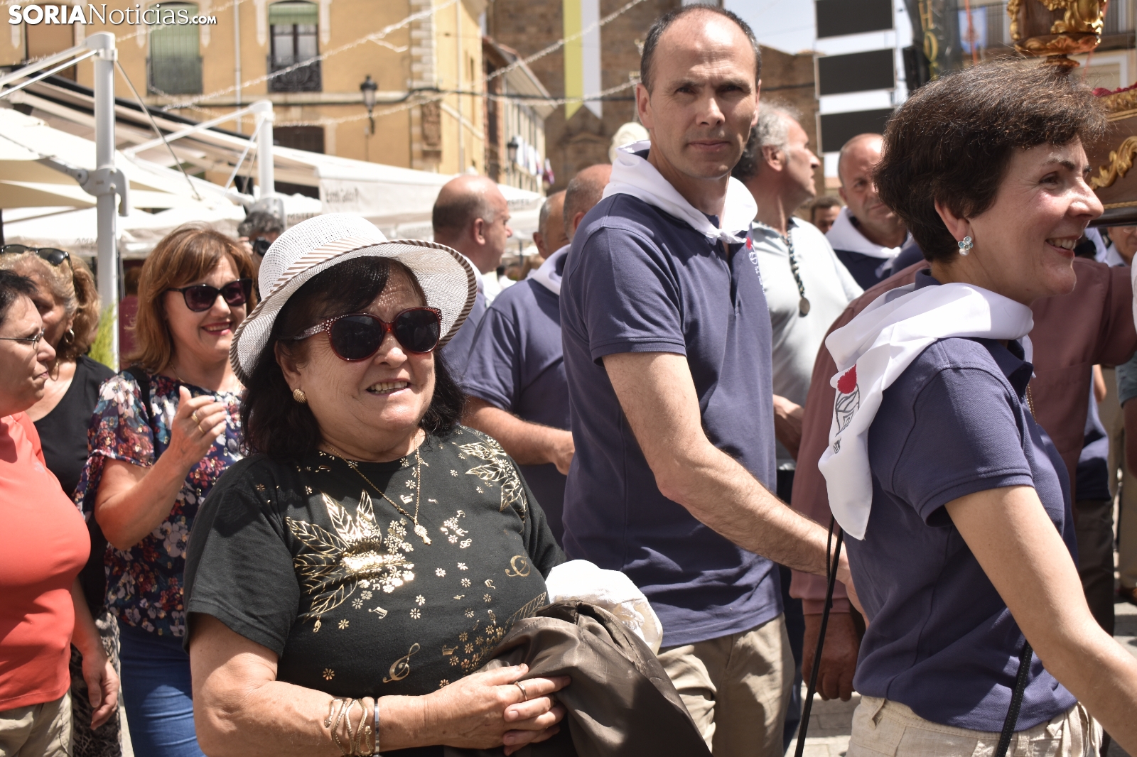 Millares de peregrinos han vuelto a visitar Ágreda en el día grande de sus fiestas patronales, en honor a Nuestra Señora de los Milagros. Si a las siete de la mañana de este sábado la Misa de Peregrinos llenaba el templo santuario de la Patrona, un número mayor de fieles acudían a la eucaristía solemne de las once -oficiada por José Luis Redrado Marchite, obispo titular de Ofena- colmando la iglesia. Concluido el acto litúrgico, daba comienzo la procesión con la imagen de la Virgen de los Remedios, ya que la titular solamente sale de su morada cada 25 años, como así lo hizo en 2023, y salvo casos excepcionales. Los fieles desfilaban bajo las andas que, como es tradición, son cargadas sobre los hombros de miembros de la cofradía de Los Milagros, mientras que los quintos que este año han ido acordonando todo el largo recorrido para ser ellos quienes introducían finalmente la imagen de la procesionada en el templo parroquial.
