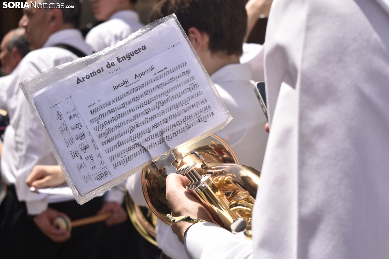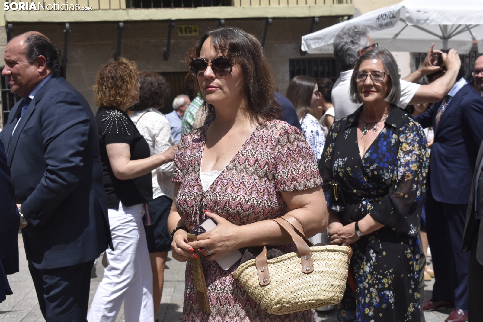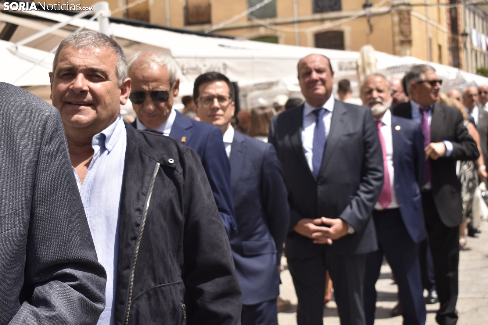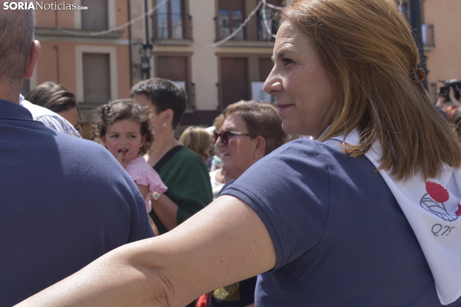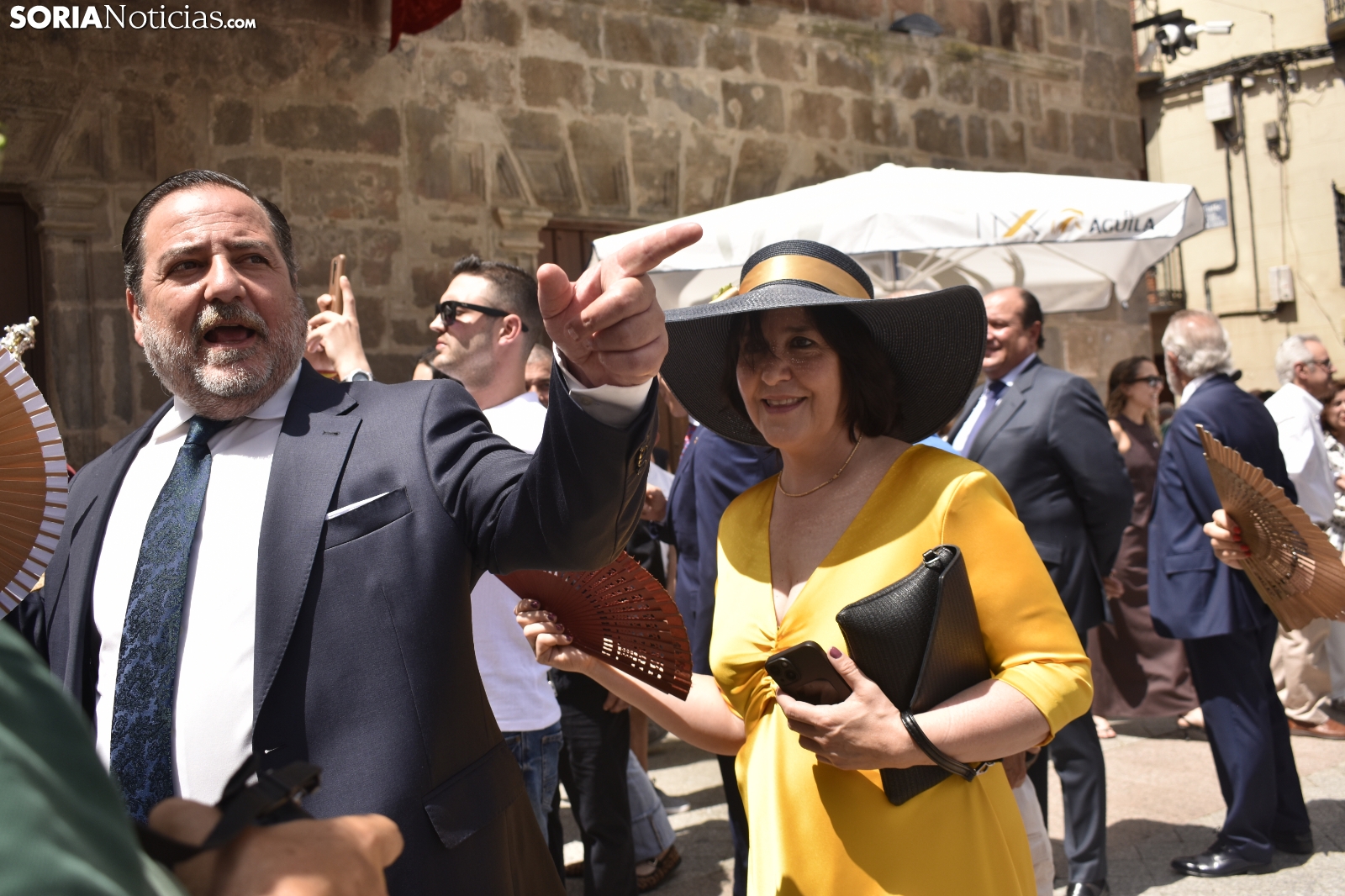 Millares de peregrinos han vuelto a visitar Ágreda en el día grande de sus fiestas patronales, en honor a Nuestra Señora de los Milagros. Si a las siete de la mañana de este sábado la Misa de Peregrinos llenaba el templo santuario de la Patrona, un número mayor de fieles acudían a la eucaristía solemne de las once -oficiada por José Luis Redrado Marchite, obispo titular de Ofena- colmando la iglesia. Concluido el acto litúrgico, daba comienzo la procesión con la imagen de la Virgen de los Remedios, ya que la titular solamente sale de su morada cada 25 años, como así lo hizo en 2023, y salvo casos excepcionales. Los fieles desfilaban bajo las andas que, como es tradición, son cargadas sobre los hombros de miembros de la cofradía de Los Milagros, mientras que los quintos que este año han ido acordonando todo el largo recorrido para ser ellos quienes introducían finalmente la imagen de la procesionada en el templo parroquial.