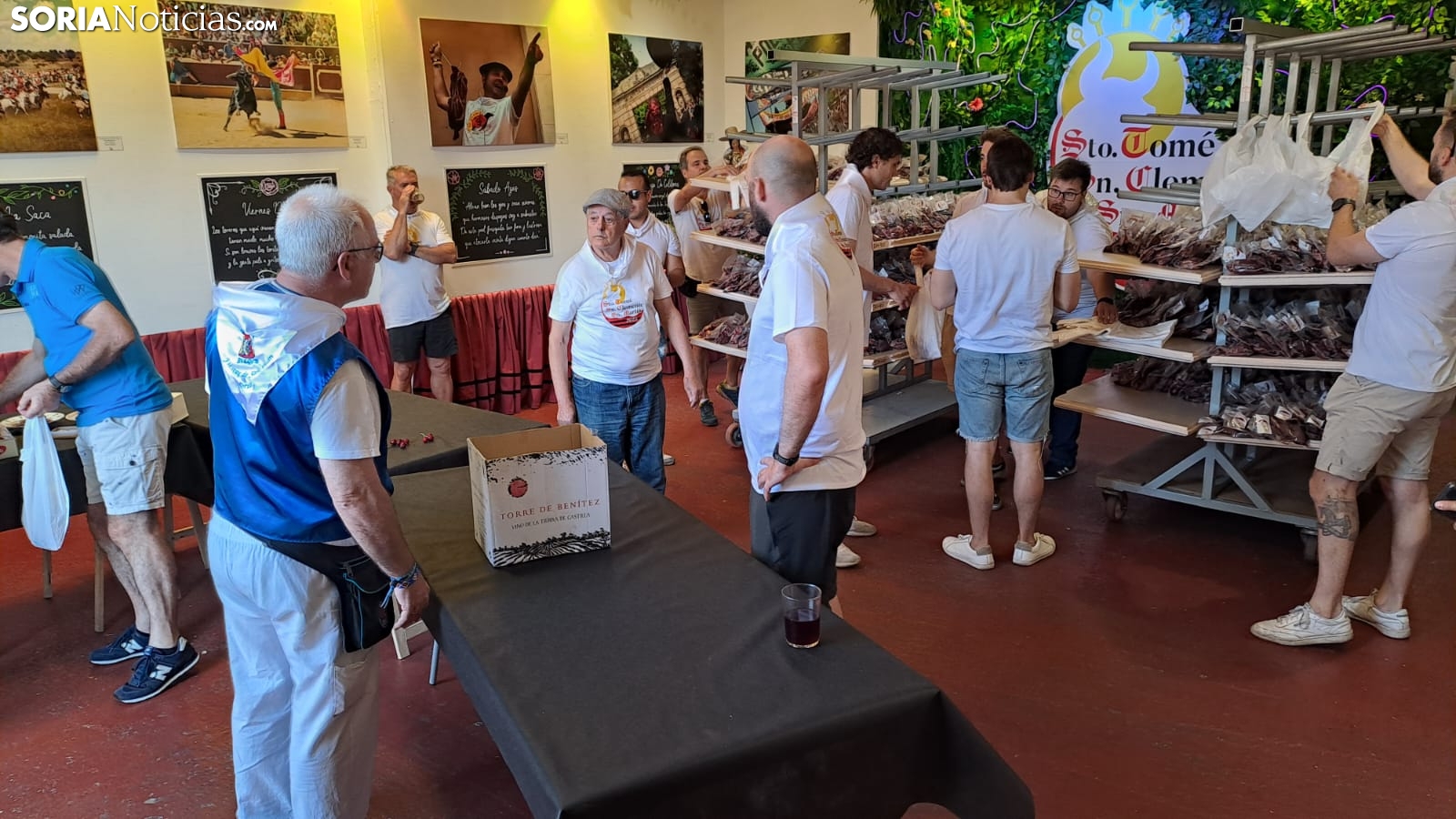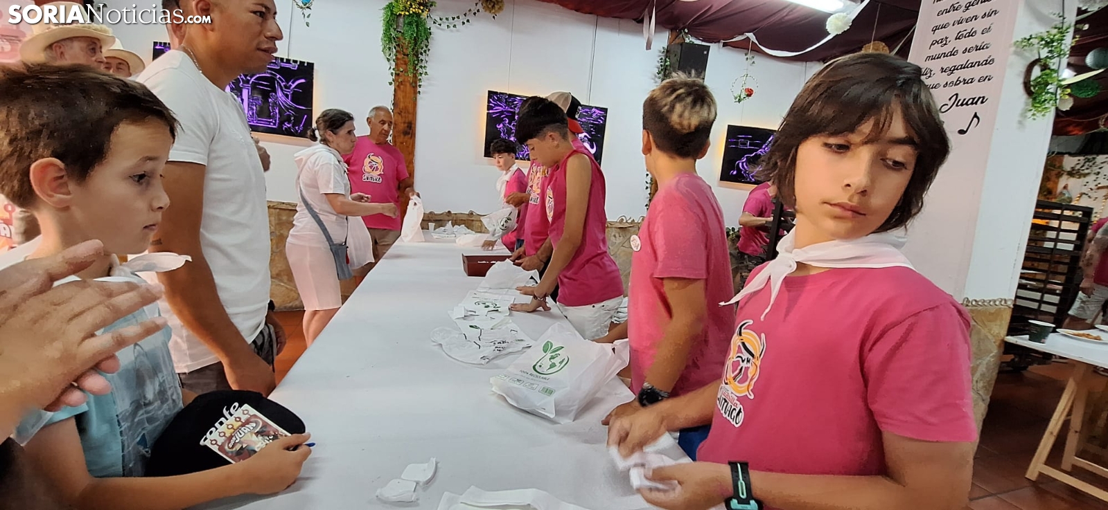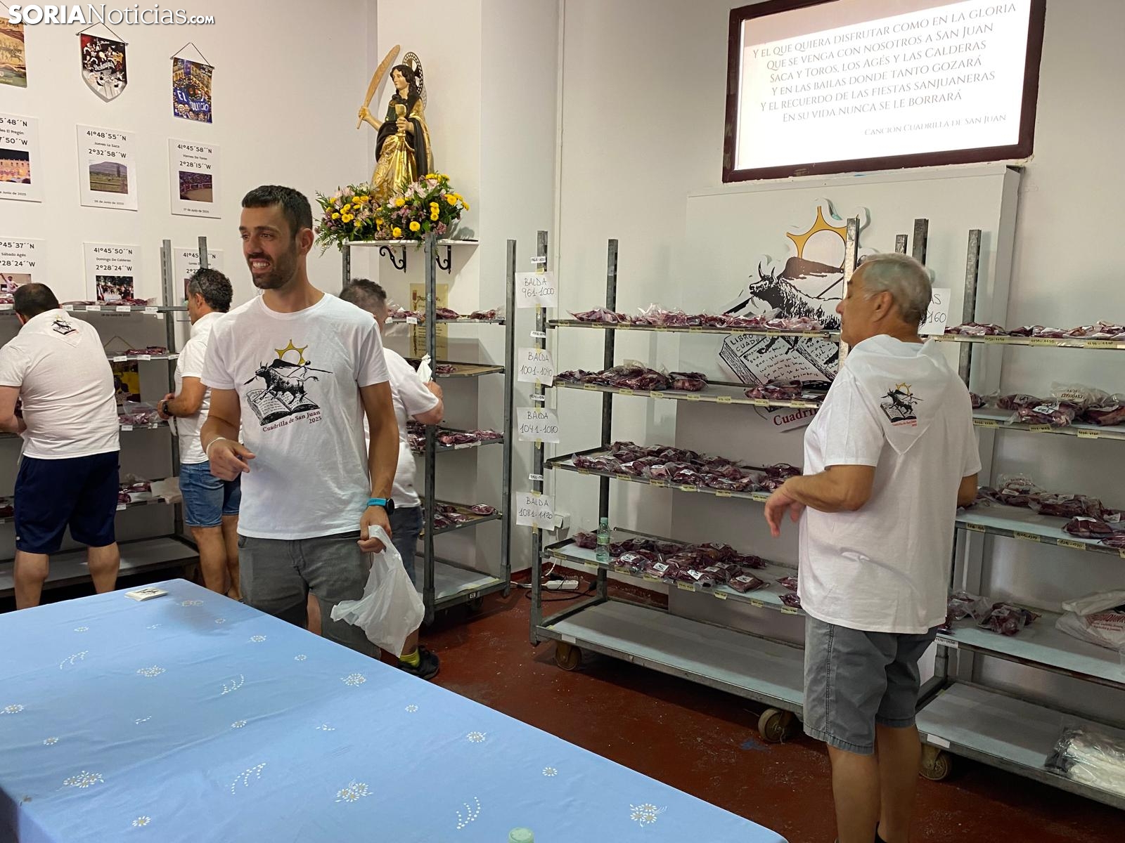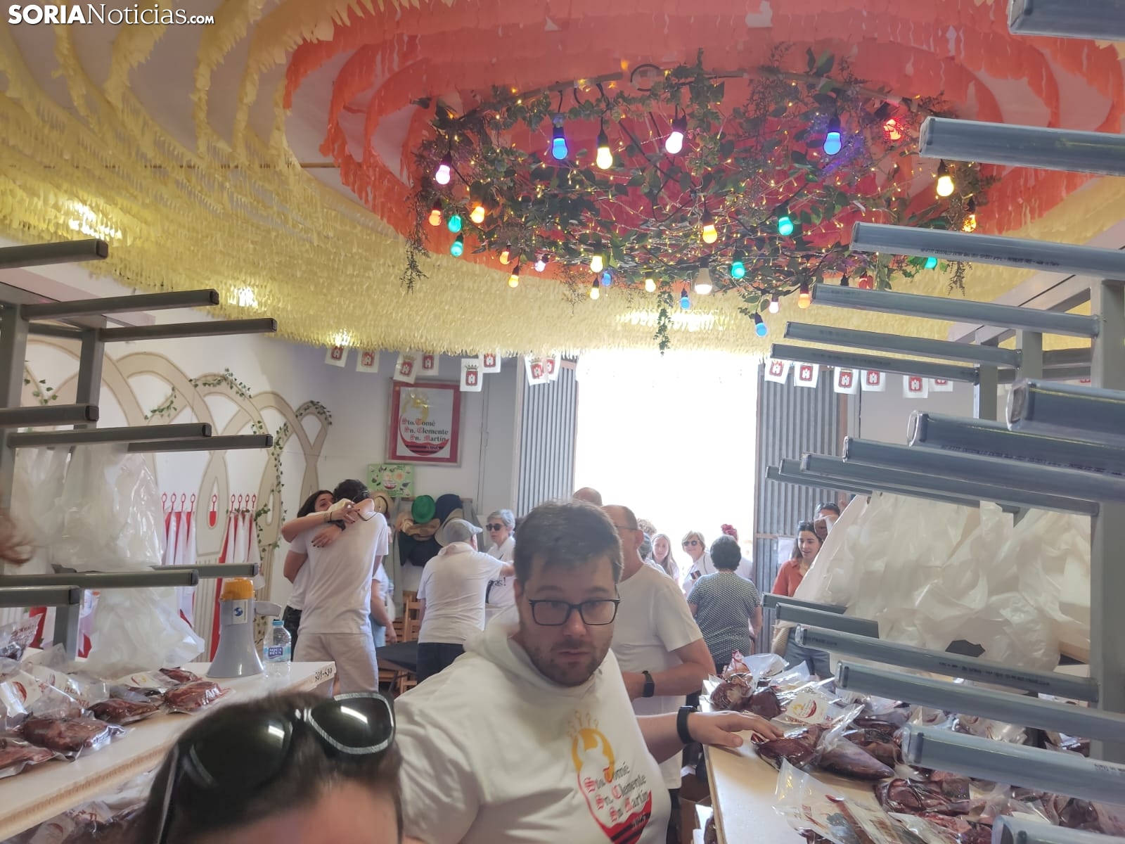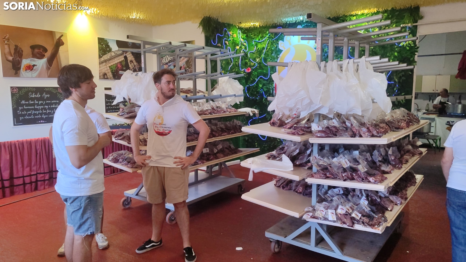 Un sinvivir esta mañana de Sábado agés en las cuadrillas. Miles de sorianos se han acercado a las sedes para recoger la tajada, en fresco, de la carne tras el Agés de toros, ayer. Los locales de las alcaldías de barrio han vivido un tiempo frenético para atender al vecindario y entregar la ración, tras ser presentada la tarjeta habilitada para la ocasión y tomar, al azar, el número que corresponde a cada unidad. Colaboradores, jurados y simpatizantes han recibido al paisanaje, obsequiando con moscatel, pastas y también estofado a la concurrencia. Los niños, protagonistas y voluntariosos al otro lado del mostrador, como en El Calaverón, en una tarea que se ha prolongado ya de madrugada hasta las 13:00 h. Por la tarde, nueva cita en estos lugares con la subasta de las piezas de los novillos lidiados un día antes.