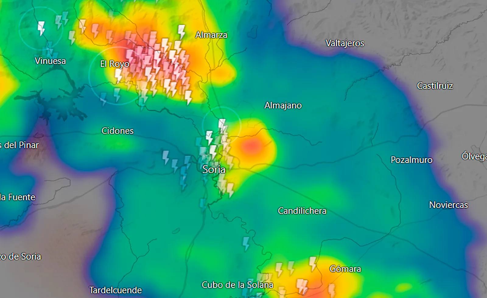 Ya en torno a las 16:30 los rayos descargaban con intensidad en la capital soriana con estruendos notorios, lo que indicaba que el aparato eléctrico se había cernido en el casco urbano y alrededores, en un radio que tenía su vértice en torno a un kilómetro del centro de Soria, según indicaban portales de internet especializados que informan en tiempo real sobre este tipo de fenómenos, al igual que la AEMET.