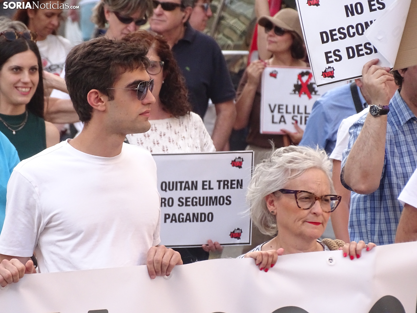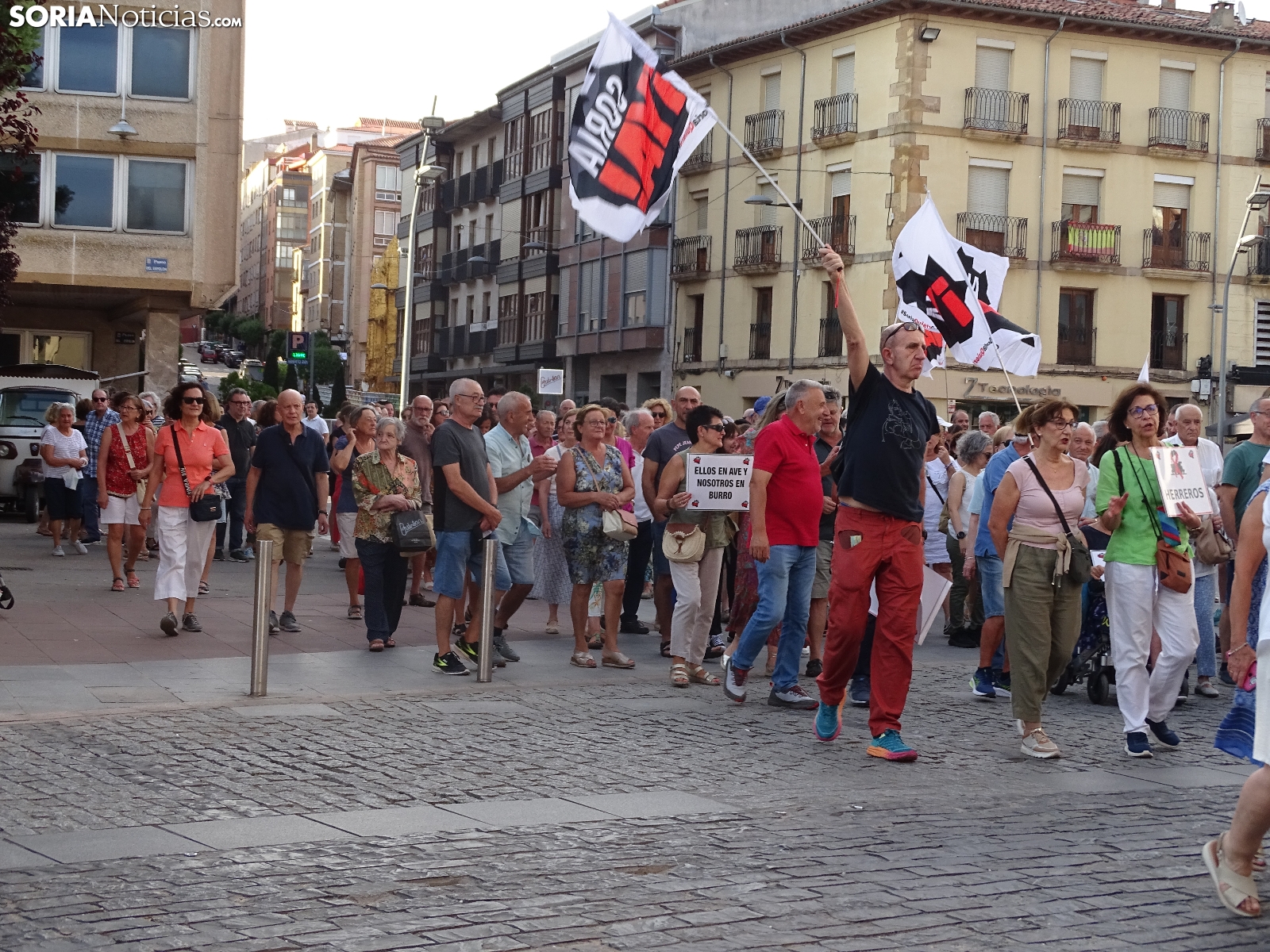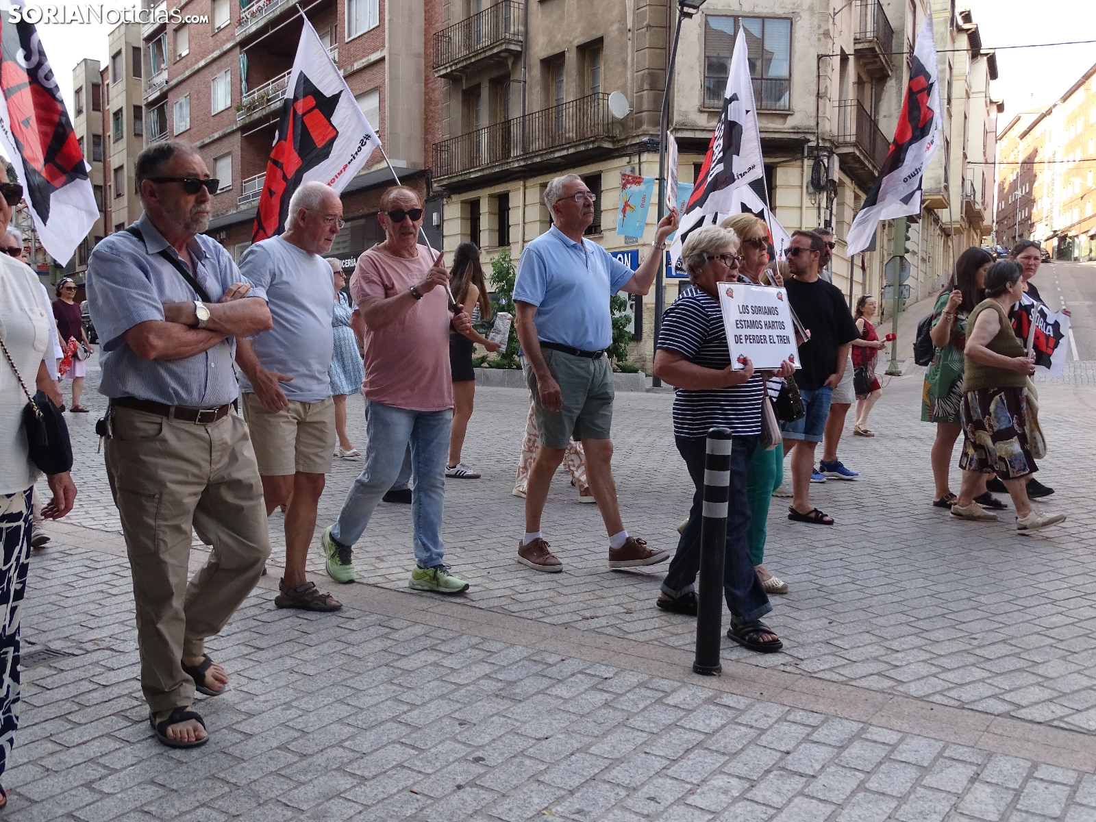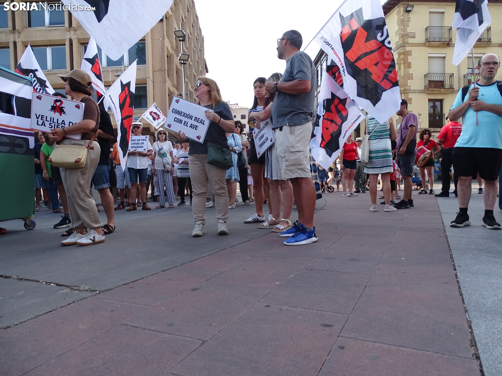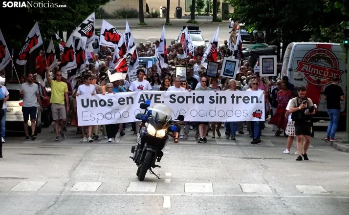 "En breves instantes saldrá el tren con destino El Cañuelo". De este modo, pasadas las ocho de la tarde de este viernes, era anunciado el inicio, en la plaza de Mariano Granados, de la manifestación convocada por Soria Ya que bajo el lema 'El único tren que pasa por Soria es el de las excusas' ha reivindicado reivindicado un ferrocarril digno para la provincia después de que en 40 años la red de esta infraestructura pública se ha ido viendo desmantelada.