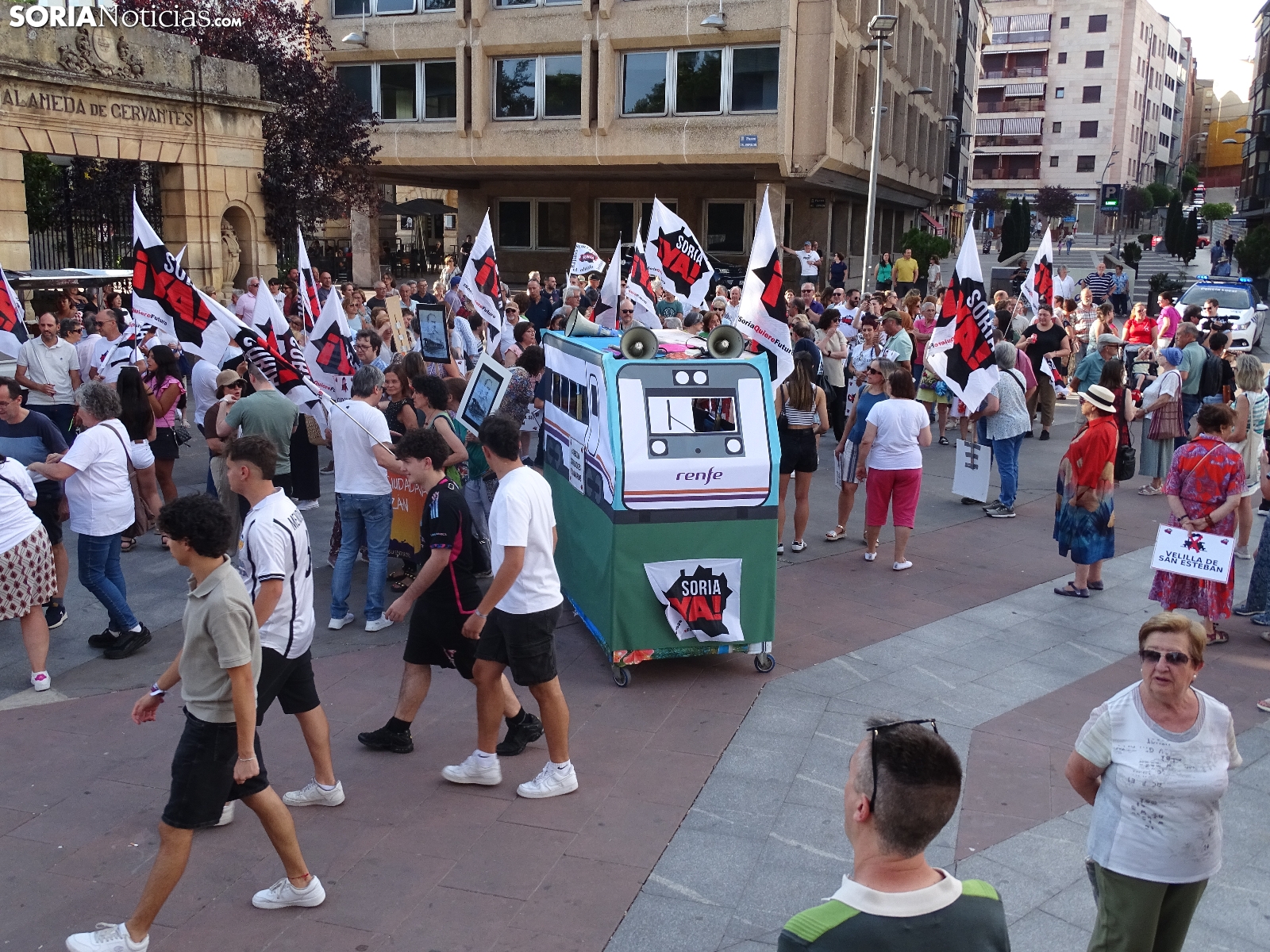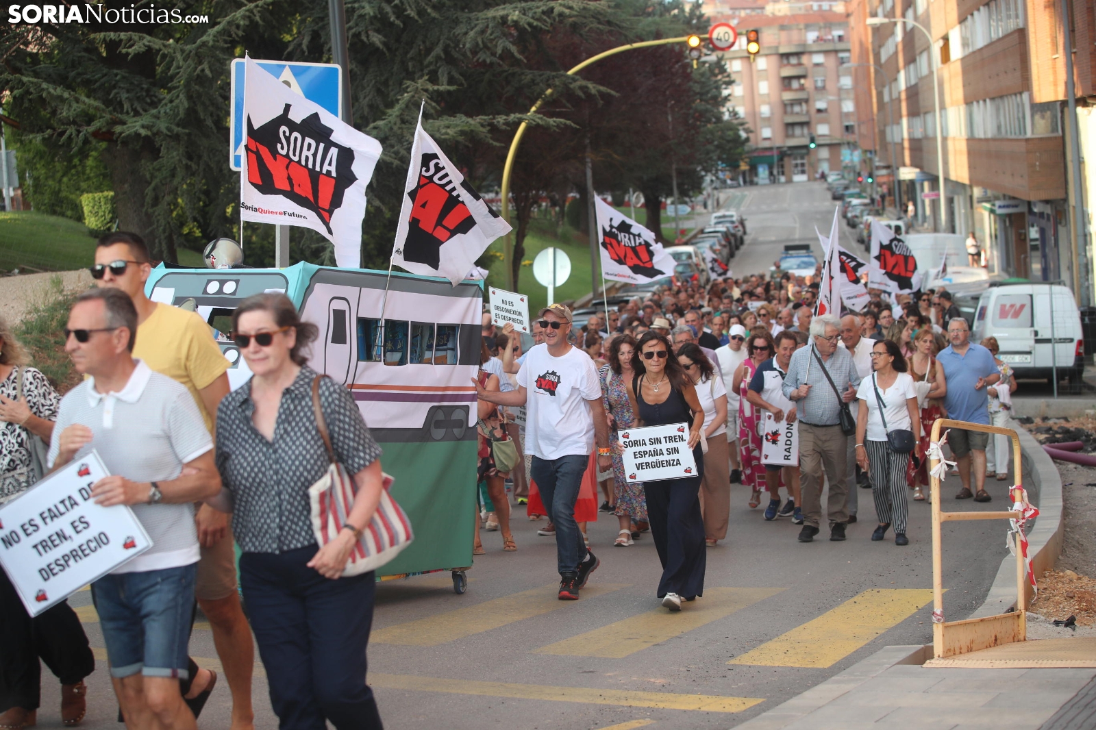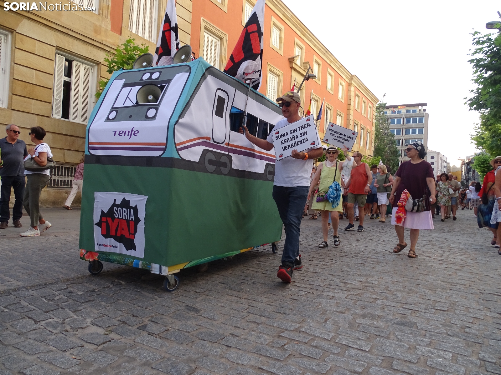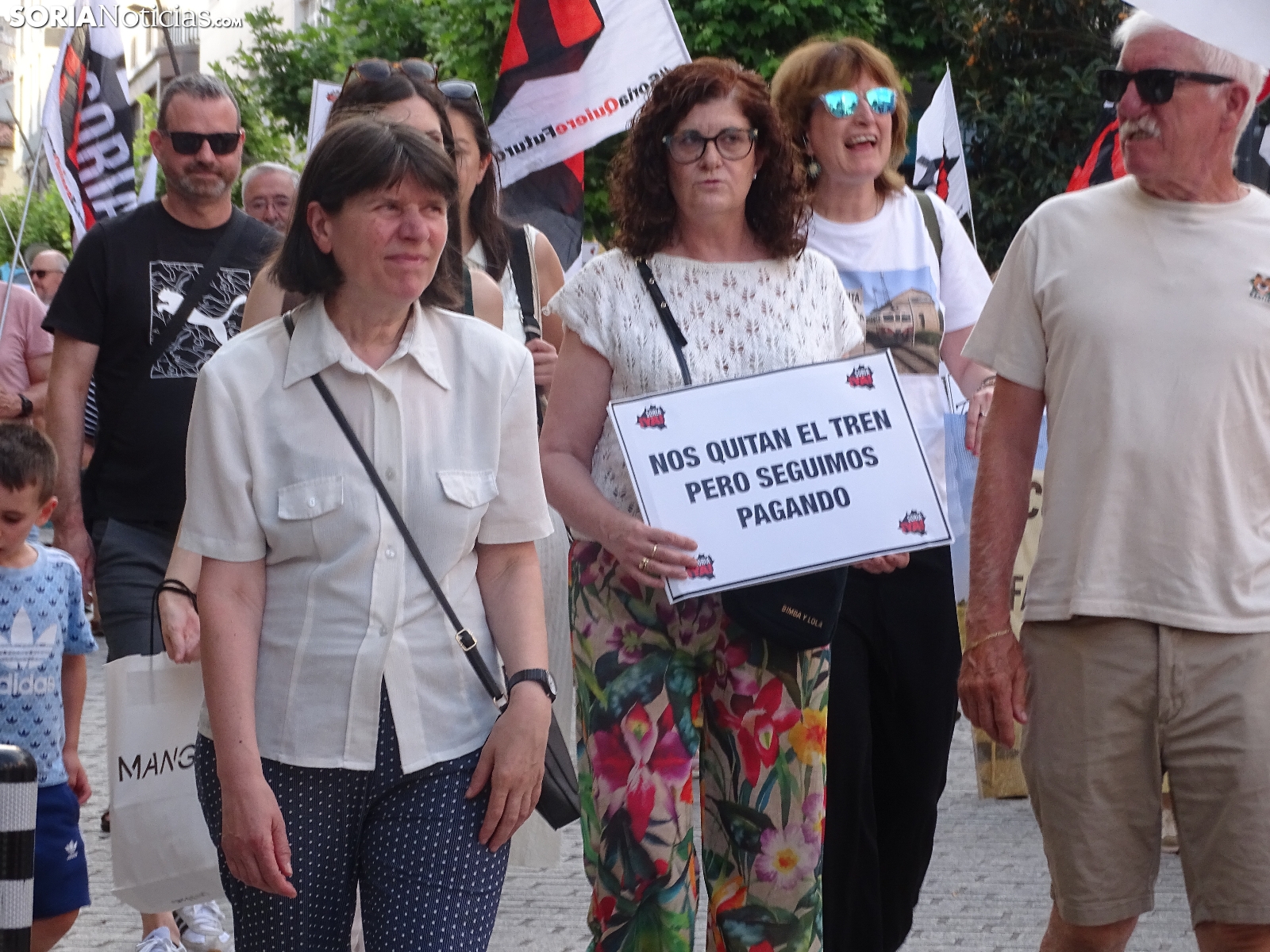 "En breves instantes saldrá el tren con destino El Cañuelo". De este modo, pasadas las ocho de la tarde de este viernes, era anunciado el inicio, en la plaza de Mariano Granados, de la manifestación convocada por Soria Ya que bajo el lema 'El único tren que pasa por Soria es el de las excusas' ha reivindicado reivindicado un ferrocarril digno para la provincia después de que en 40 años la red de esta infraestructura pública se ha ido viendo desmantelada.