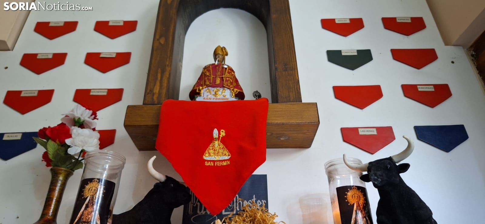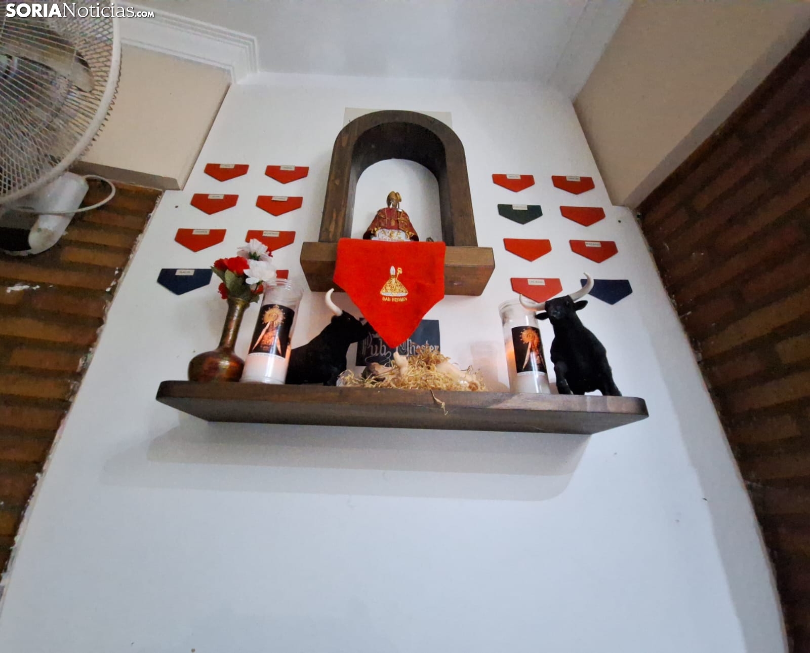 Antes de comenzar el encierro, se levantan de sus sillas, doblan periódicos y entonan 'A San Fermín pedimos'. Acaparando todas las miradas del bar, reconocen que la versión vasca no se la conocen, “aunque la llevamos escuchando muchos años”. Seguidamente, se sientan con su café en una de las mesas del establecimiento para no perderse nada de lo que ocurre. Los detalles navarros no faltan en este local. En una de sus paredes, se puede contemplar un altar al patrón con un pañuelo rojo.
