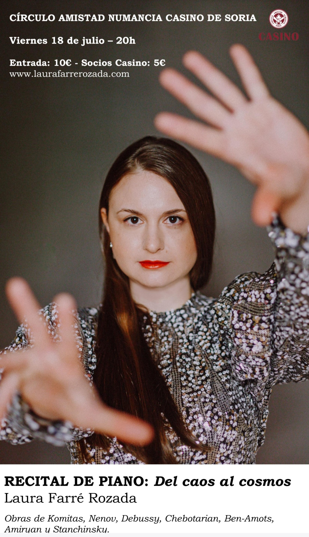 El Círculo Amistad Numancia se prepara para acoger un evento musical de primer nivel este próximo viernes, 18 de julio. La reconocida pianista Laura Farré Rozada ofrecerá un concierto a partir de las 20:00 h en el emblemático salón Gerardo Diego, presentando su recital titulado 'Del caos al cosmos'.