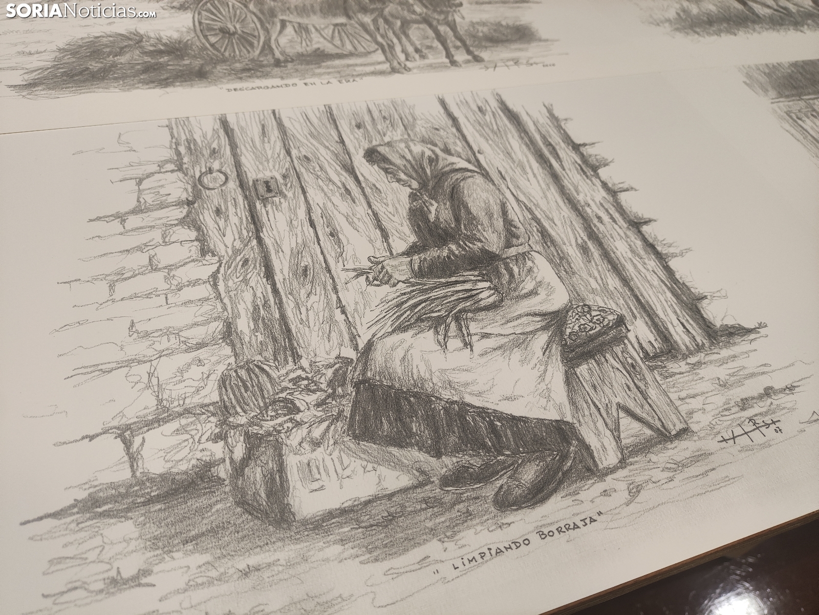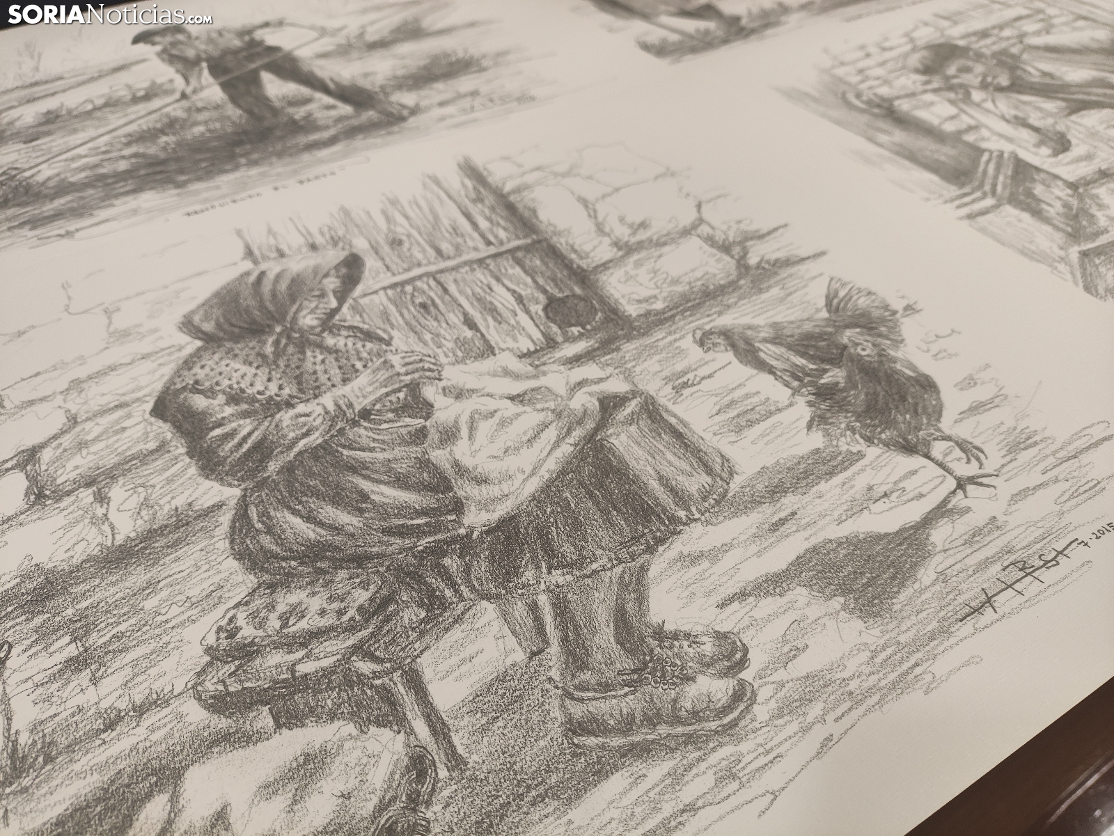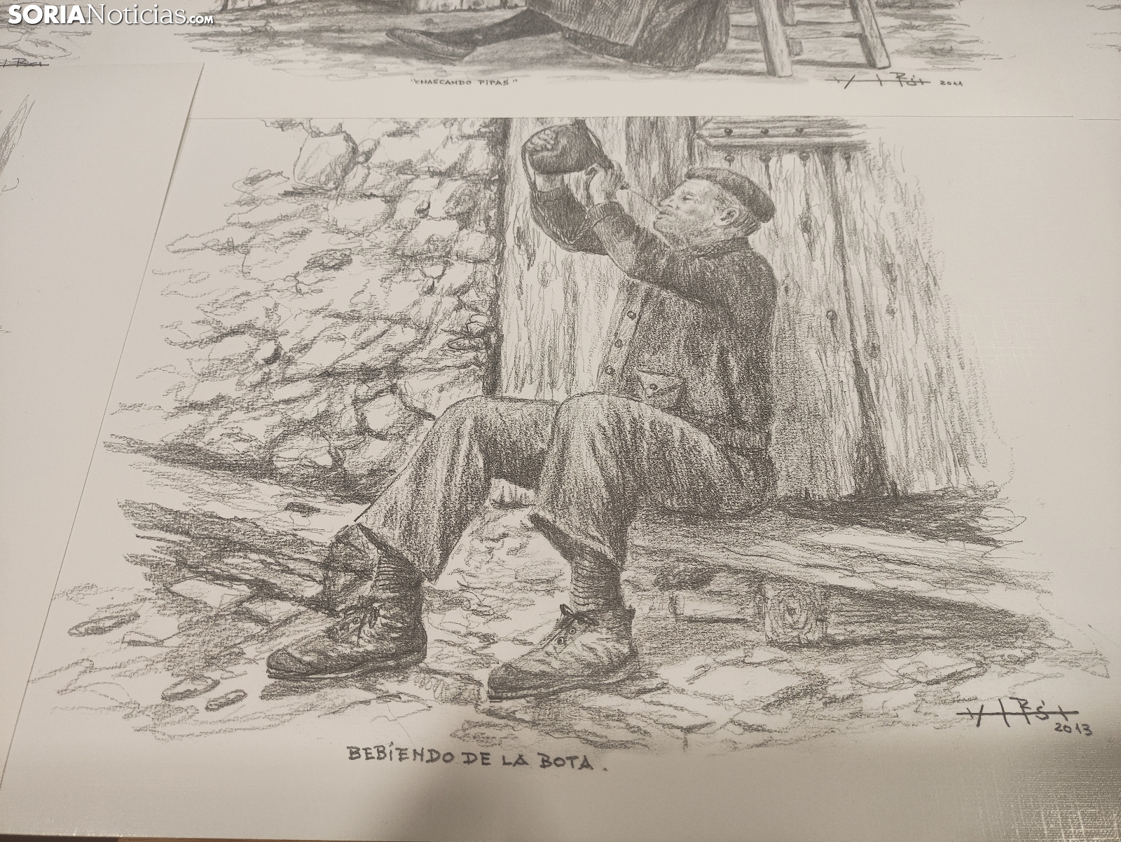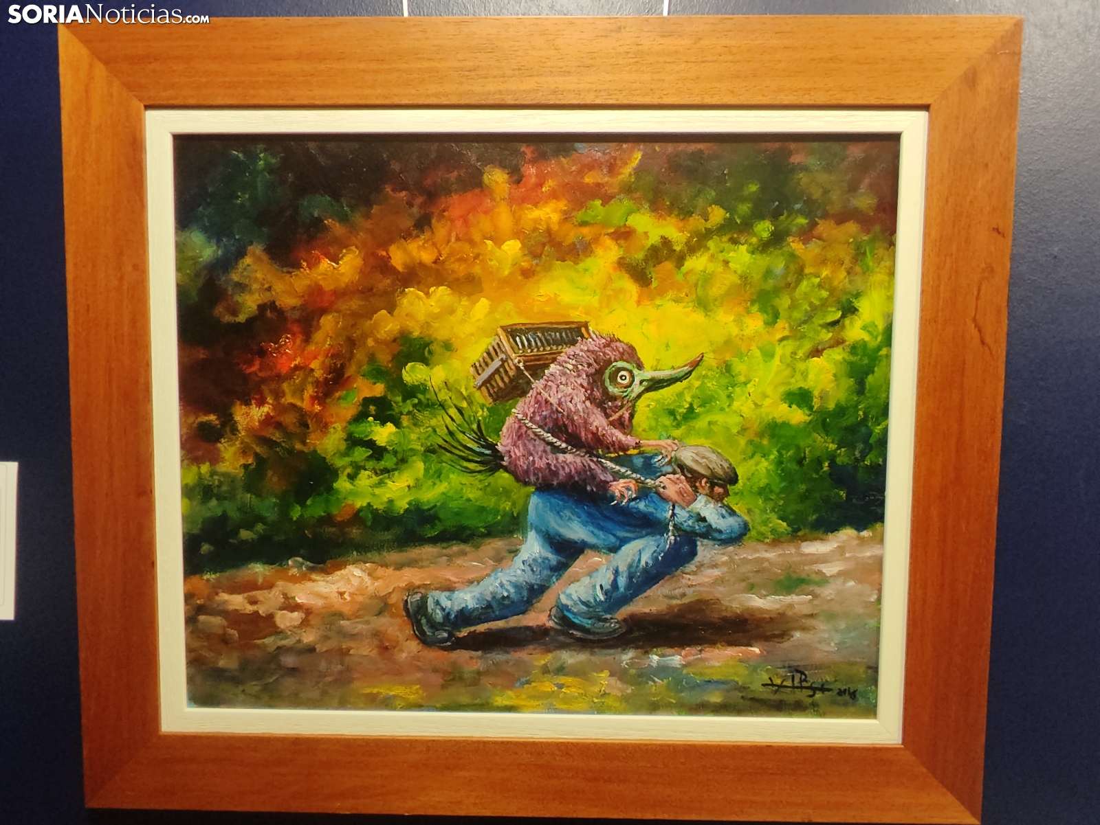 La muestra da buena cuenta de sus diferentes etapas y formatos. Desde los dibujos machadianos a su primer dibujo pintado a mano con un lápiz. «Hace 100 años», bromea. Otra gran parte de las dos salas las ocupan sus dibujos de personas y momentos de la Soria más rural, la Soria de los años 70 y 80 que guardaba toda su esencia. Personas, estampas e imaginación como el gamusino al que dio forma primero como escultura y luego como cuadro.