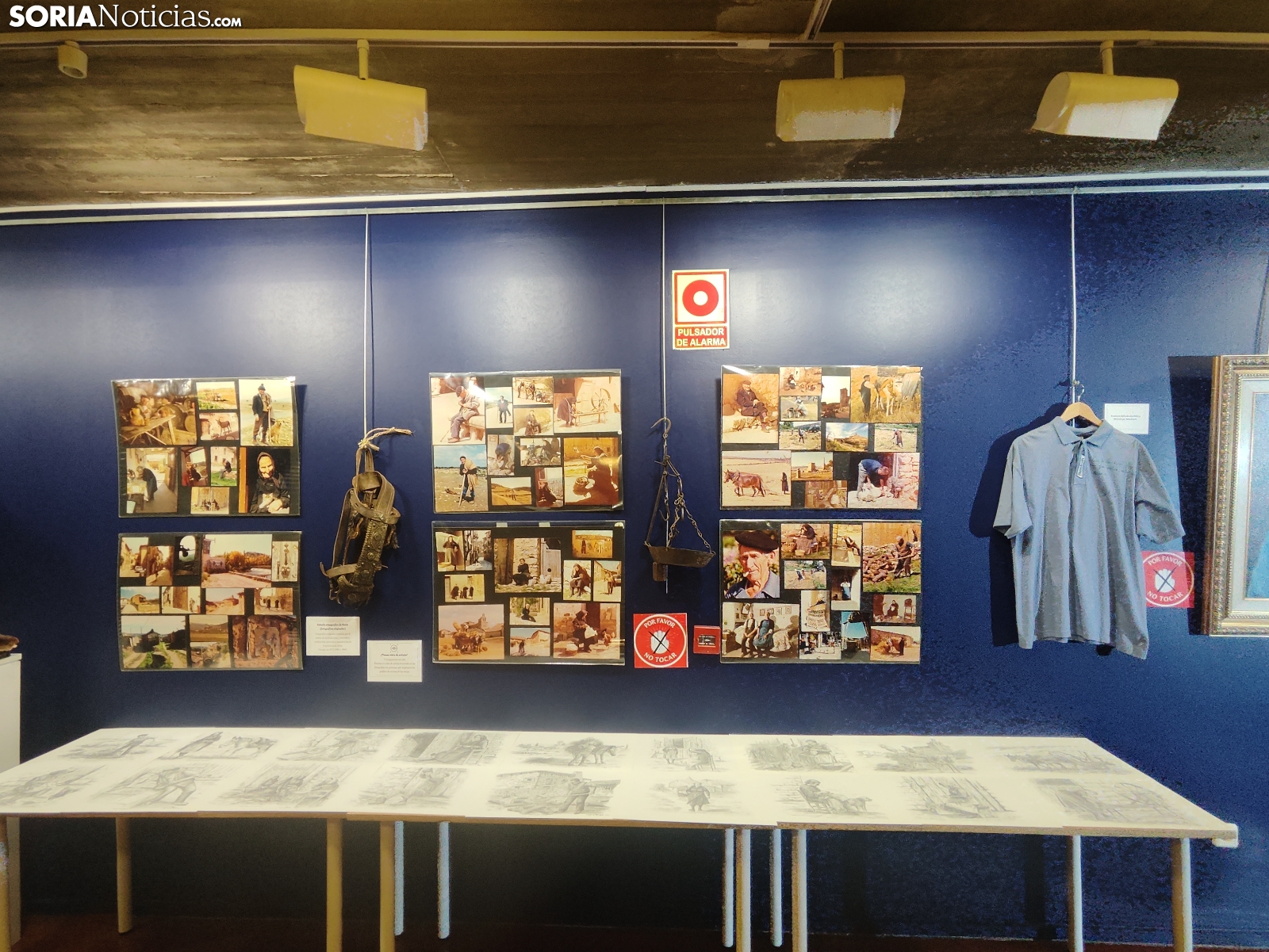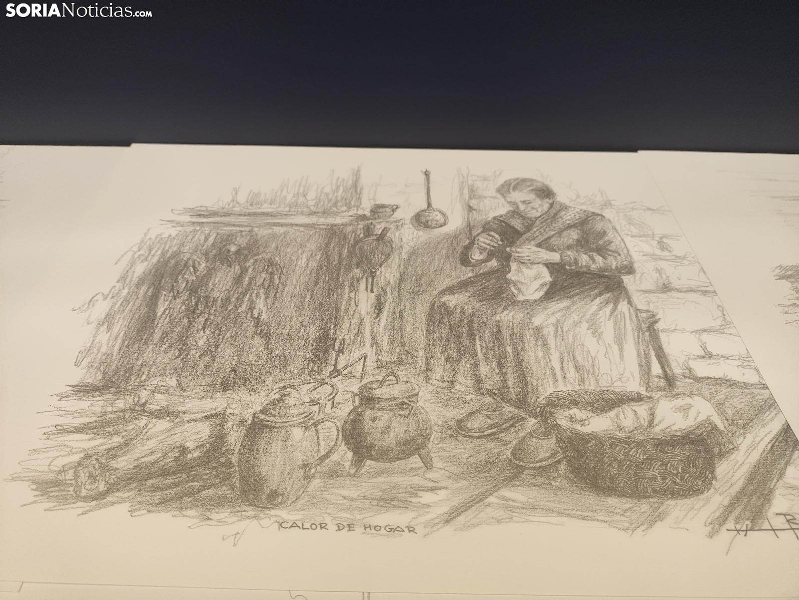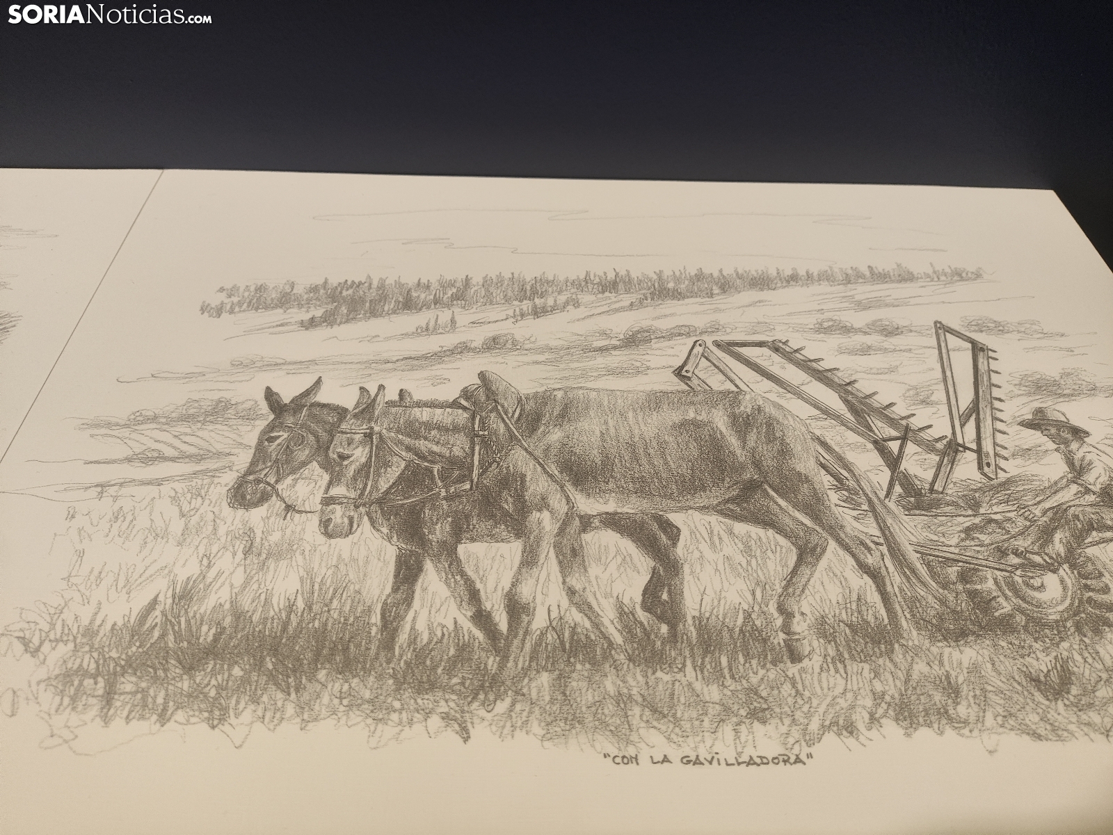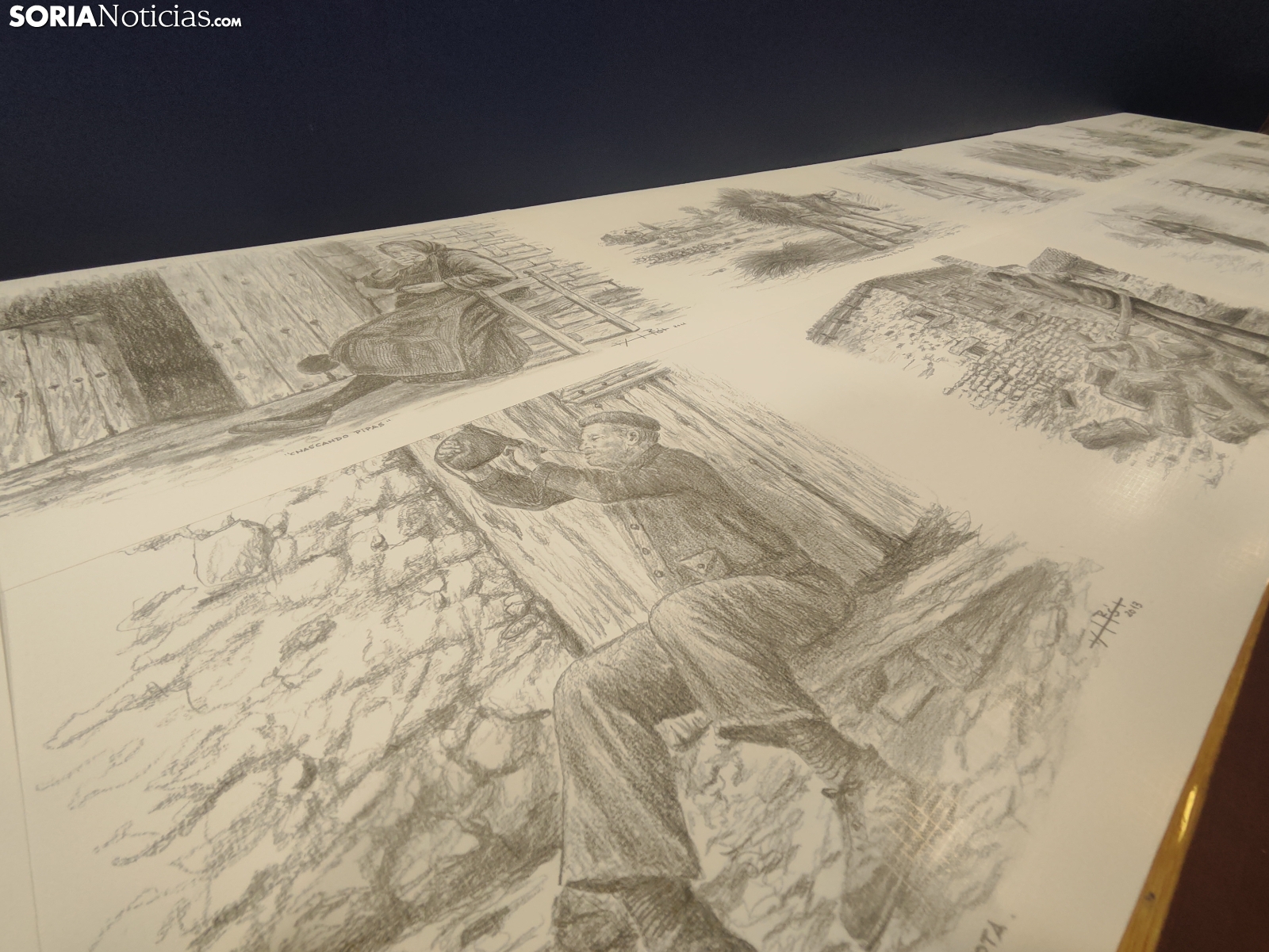 La muestra da buena cuenta de sus diferentes etapas y formatos. Desde los dibujos machadianos a su primer dibujo pintado a mano con un lápiz. «Hace 100 años», bromea. Otra gran parte de las dos salas las ocupan sus dibujos de personas y momentos de la Soria más rural, la Soria de los años 70 y 80 que guardaba toda su esencia. Personas, estampas e imaginación como el gamusino al que dio forma primero como escultura y luego como cuadro.