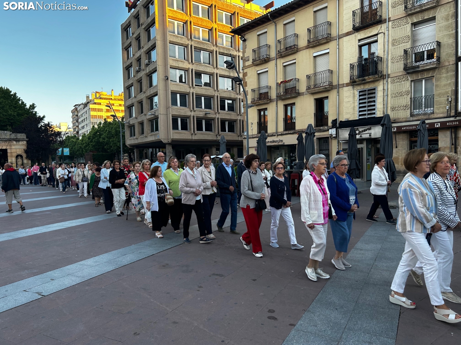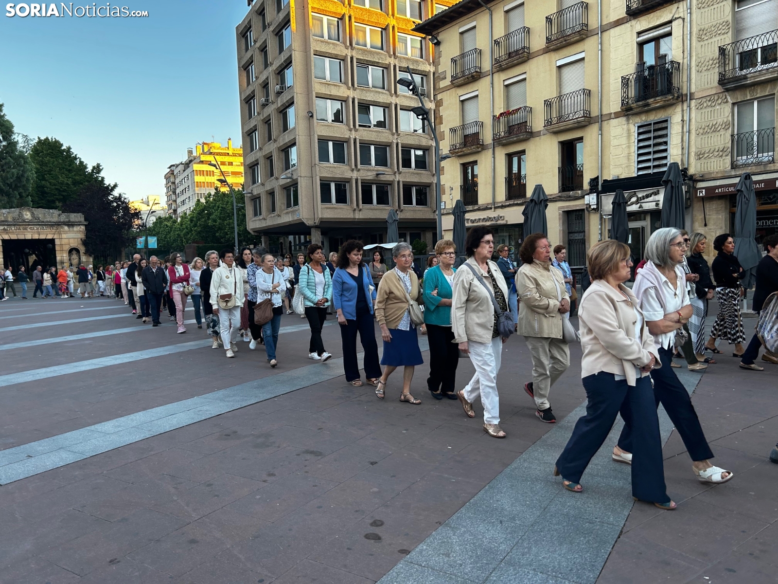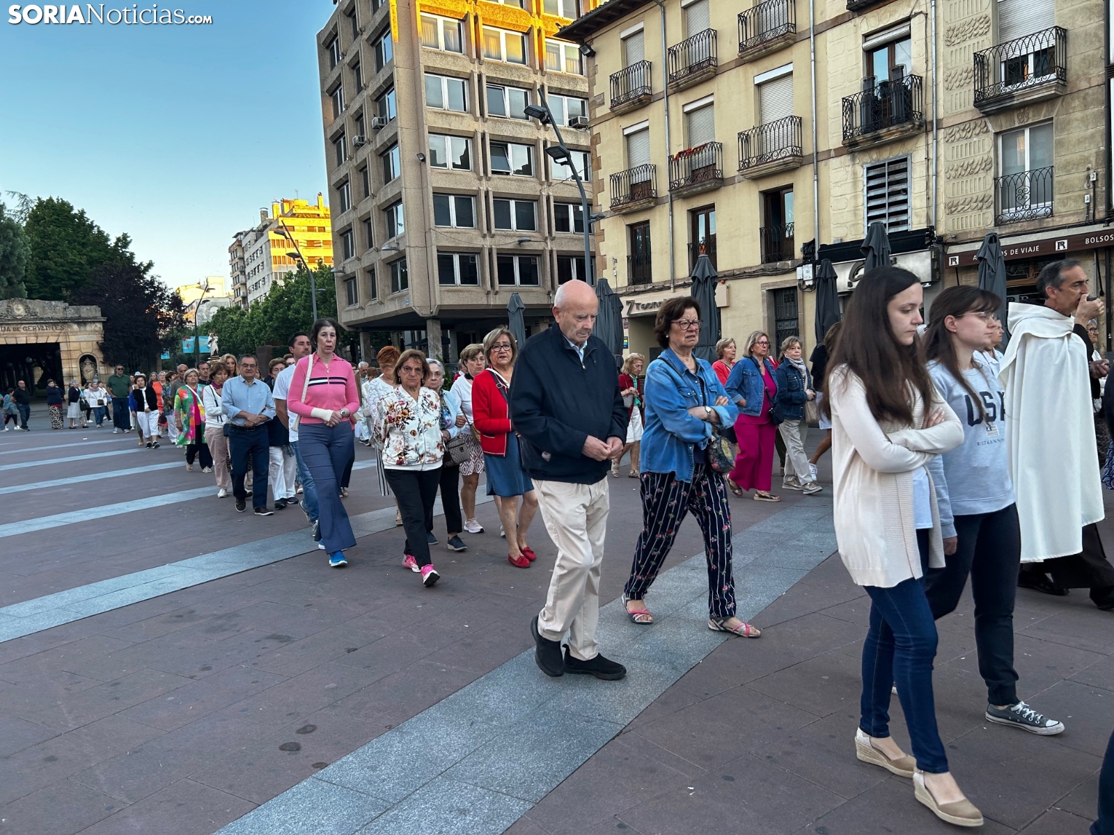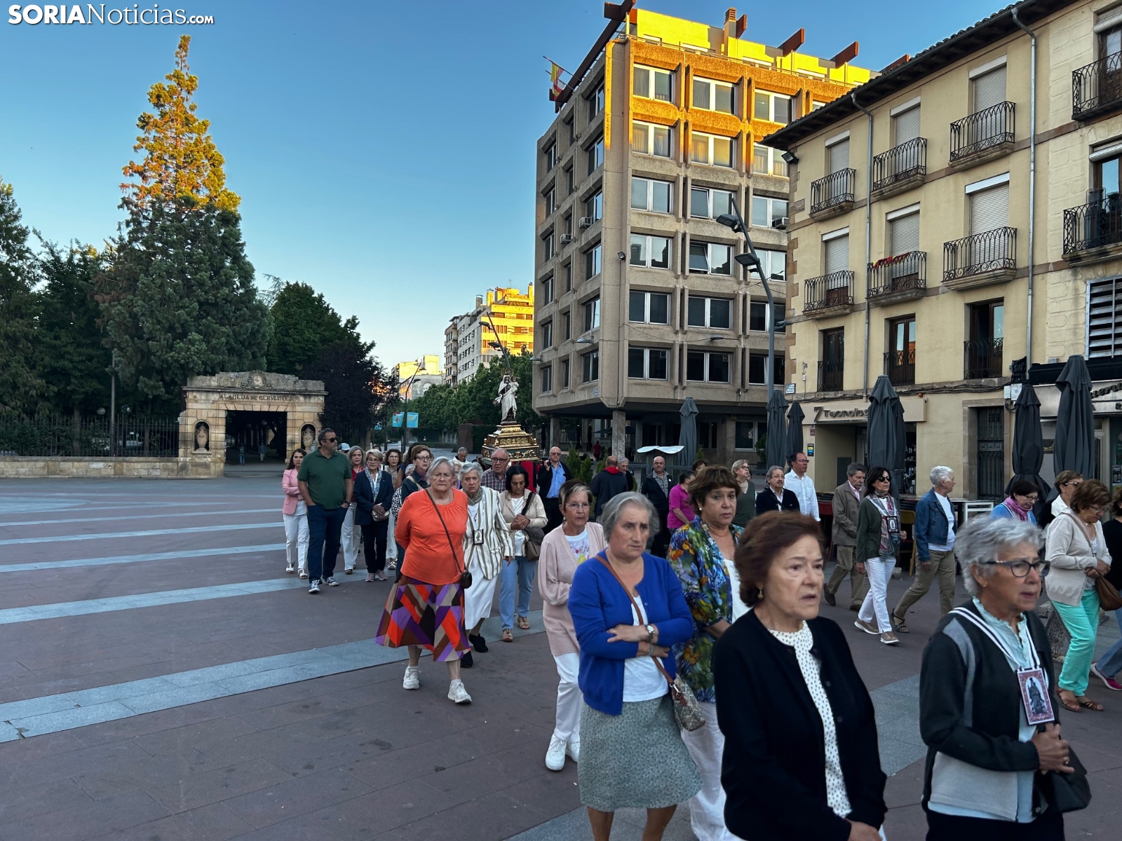 Con la imagen de la Virgen, en una comitiva encabezada por la cruz parroquial, centenares de devotos han recorrido las calles céntricas de la ciudad de Soria pronunciando y cantando esta oración, a la espera de la eucaristía en la iglesia del convento y la posterior procesión, que está consagrado a esta advocación de la Madre de Dios.