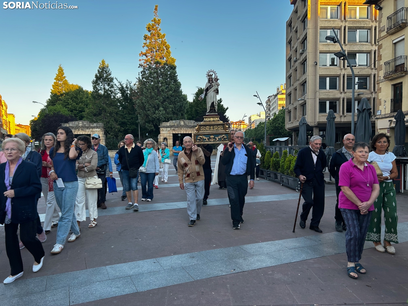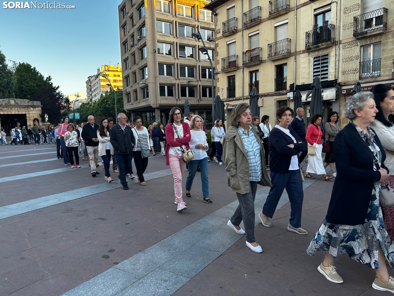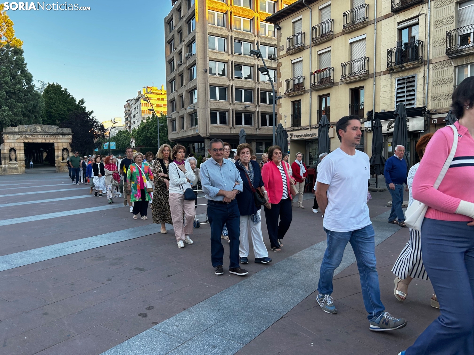 Con la imagen de la Virgen, en una comitiva encabezada por la cruz parroquial, centenares de devotos han recorrido las calles céntricas de la ciudad de Soria pronunciando y cantando esta oración, a la espera de la eucaristía en la iglesia del convento y la posterior procesión, que está consagrado a esta advocación de la Madre de Dios.