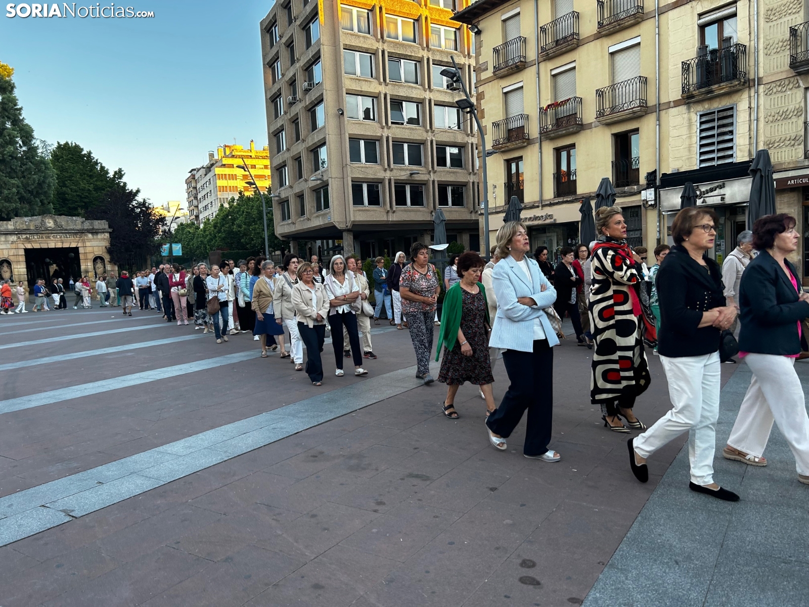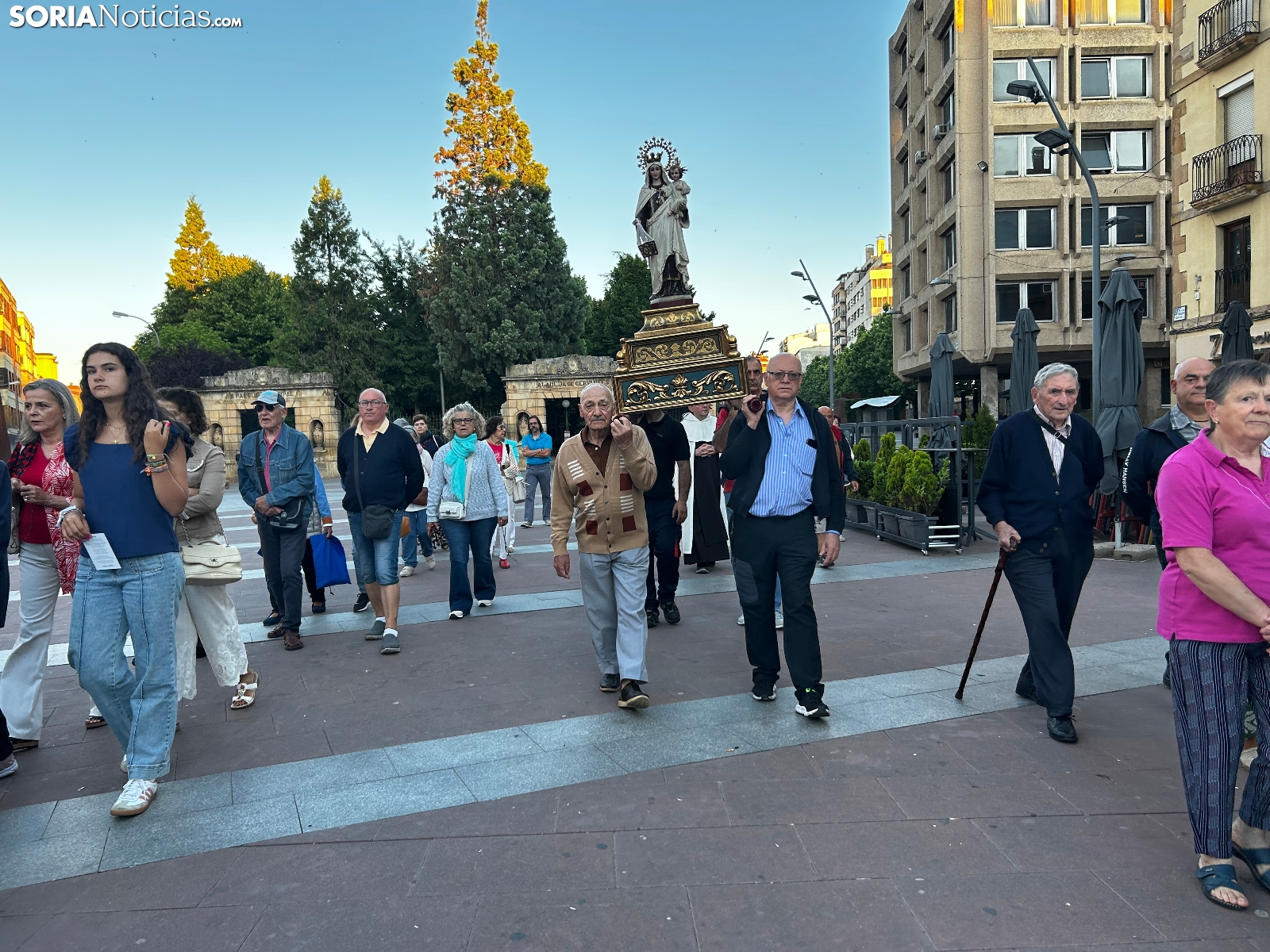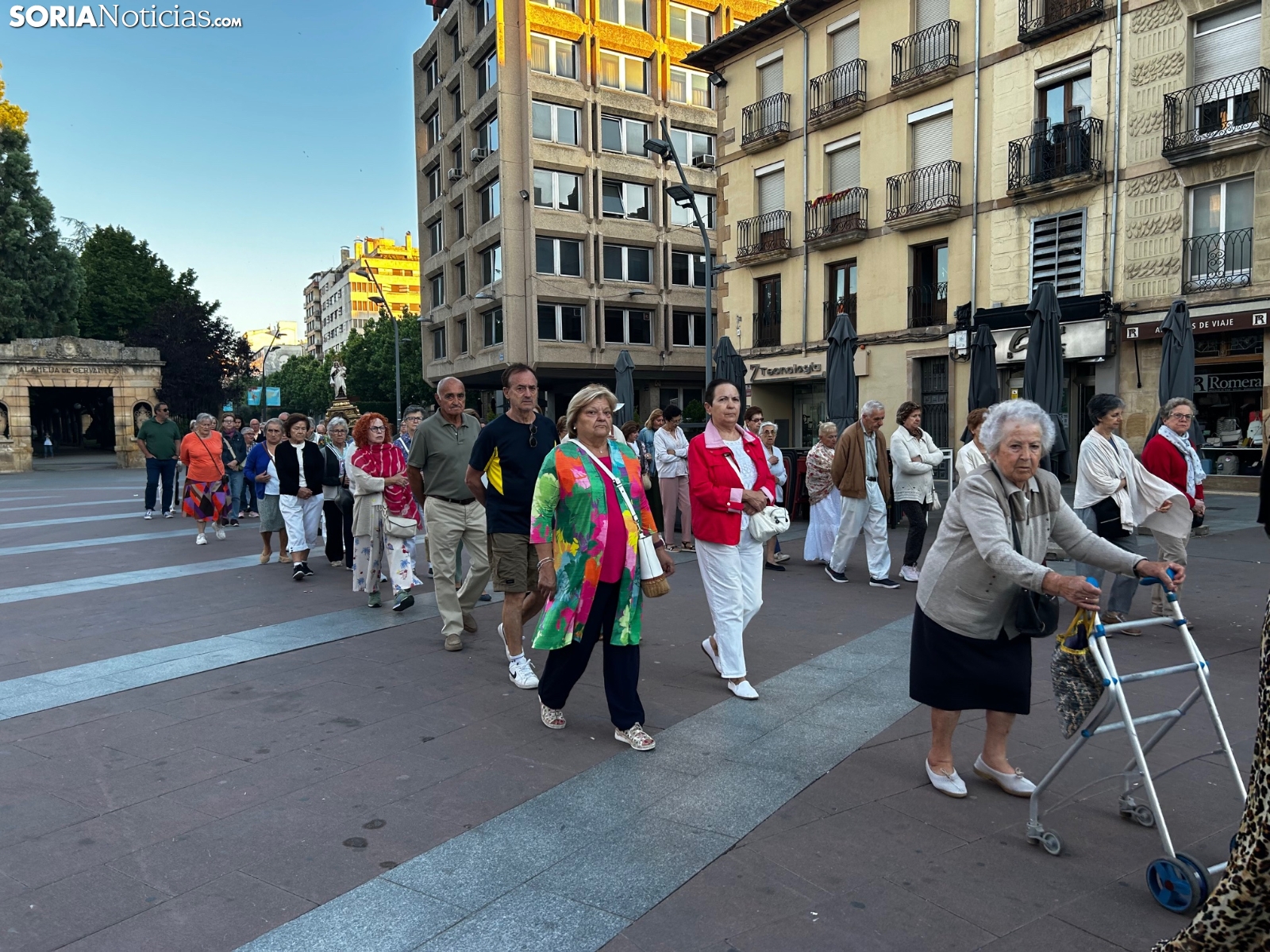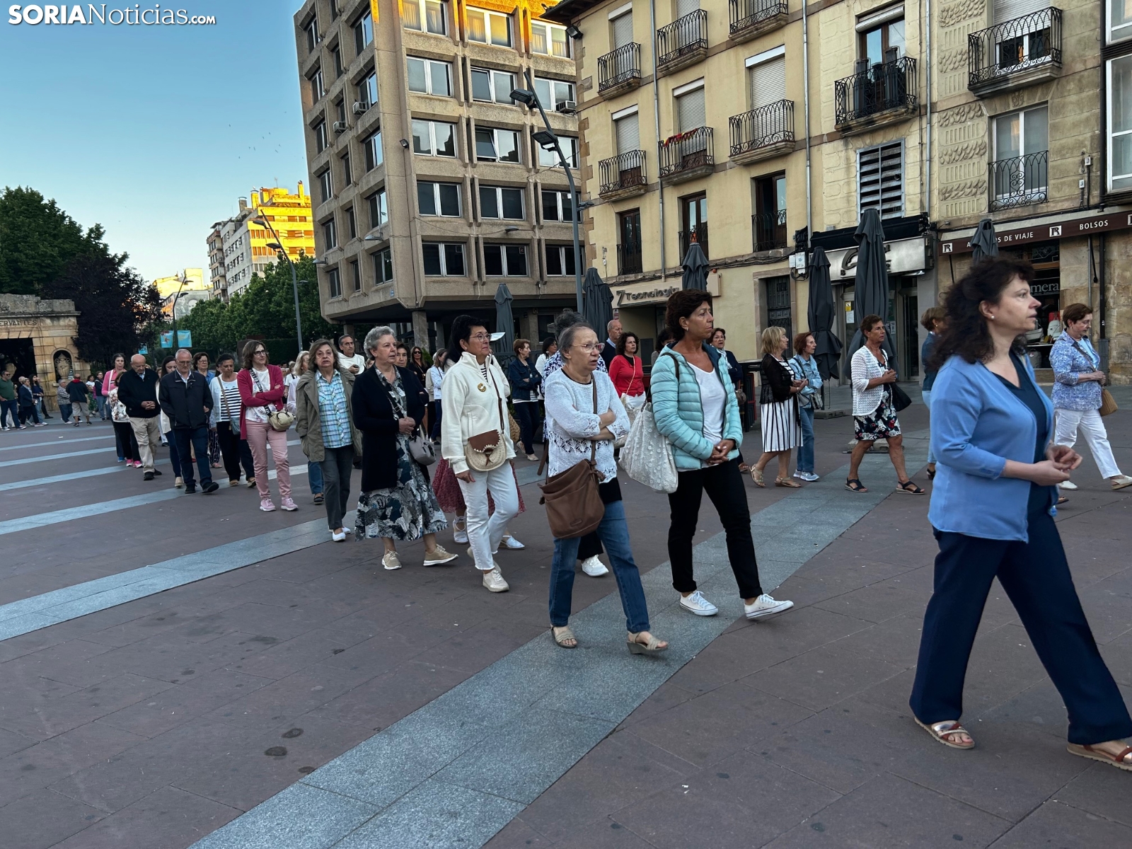 Con la imagen de la Virgen, en una comitiva encabezada por la cruz parroquial, centenares de devotos han recorrido las calles céntricas de la ciudad de Soria pronunciando y cantando esta oración, a la espera de la eucaristía en la iglesia del convento y la posterior procesión, que está consagrado a esta advocación de la Madre de Dios.