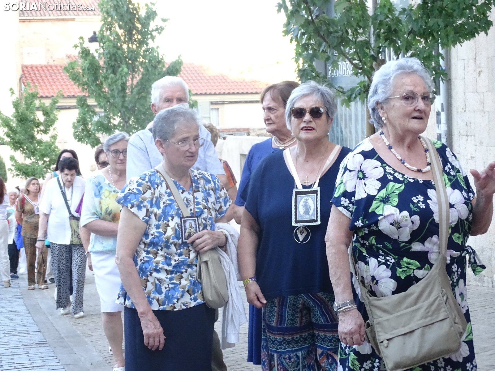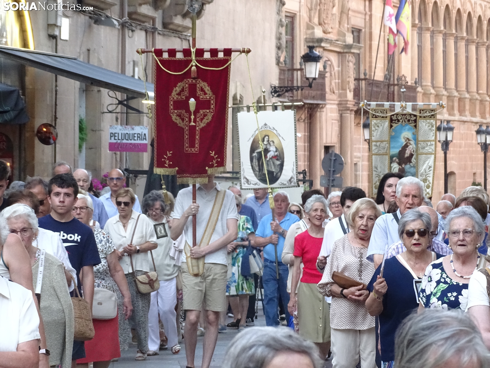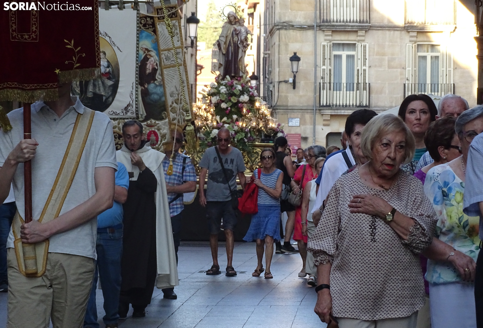 Después de la eucaristía vespertina de este miércoles, era iniciada la procesión en honor a la Virgen del Carmen en Soria, con la acostumbrada afluencia de fieles, quienes han mostrado su devoción hacia esta advocación mariana, por el centro de la ciudad. La imagen ha salido del templo de Los Carmelitas en torno a las 20:30 y durante el recorrido han sido entonadas alabanzas y oraciones hacia la Madre de Dios. Devoción para una tradición que se repite cada 16 de julio en la ciudad, que ya era celebrada por la mañana durante el Rosario de la Aurora, dejando constancia del respeto y del cariño de los sorianos a este acto de manifestación de fe, hoy celebrado en una tarde calurosa.