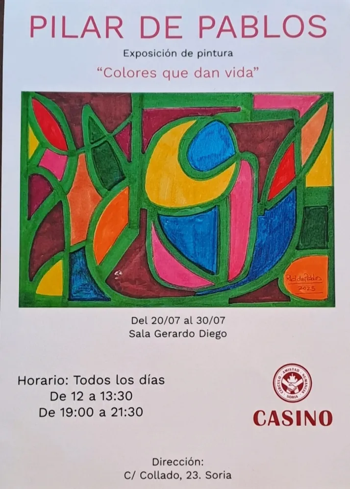 El panorama cultural de Soria se enriquece este mes de julio con una nueva propuesta artística. Desde este domingo, 20 de julio, el salón Gerardo Diego del Círculo Amistad Numancia acogerá la exposición de pintura 'Colores que dan vida', de la artista Pilar de Pablos. Una oportunidad para que sorianos y visitantes se sumerjan en una muestra que, como su propio nombre indica, promete una experiencia visual vibrante y llena de energía.