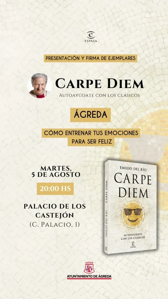 El Salón de Actos del Palacio de los Castejones de Ágreda se prepara para acoger la presentación del libro 'Carpe Diem'. Su autor, el reconocido divulgador Emilio Del Río, comparte las claves de la obra este martes, 5 de agosto, en un acto que busca conectar la sabiduría clásica con el presente.