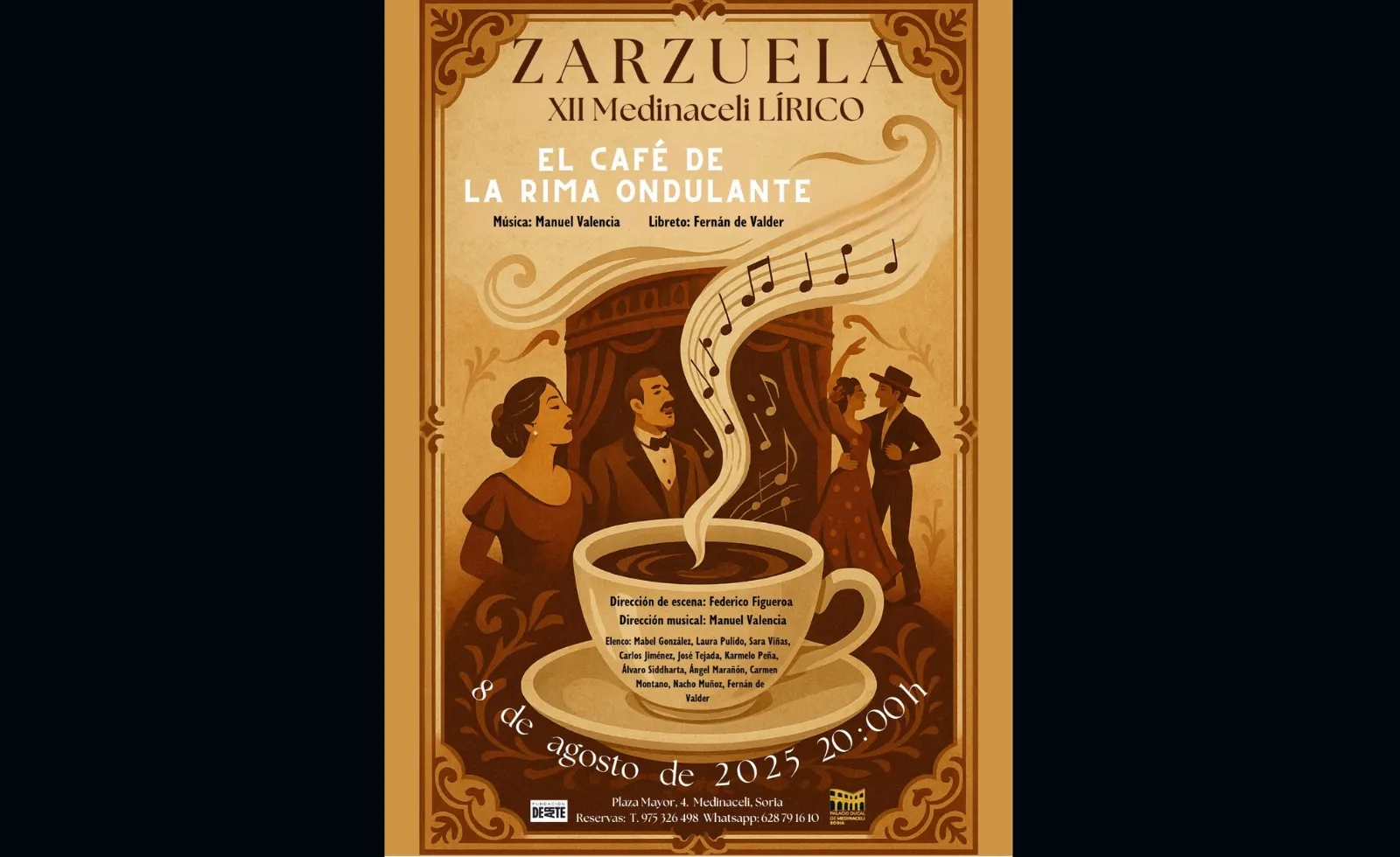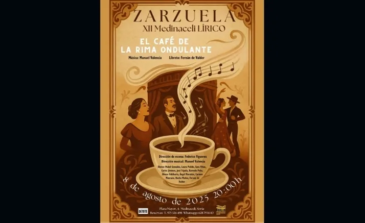 Se trata de ‘El café de la rima ondulante’, una comedia lírica con música del compositor Manuel Valencia y libreto de Fernán de Valder. Aunque la obra tuvo su estreno absoluto el 9 de diciembre de 2023 en Alcobendas, aquella versión fue acompañada únicamente por piano. La función en Medinaceli supone, por tanto, un reestreno en toda regla, ya que por primera vez se interpretará con una formación de orquesta de cámara, lo que refuerza su vocación lírica y amplía notablemente su alcance sonoro y dramático.