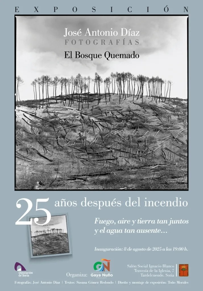 La localidad de Tardelcuende tiene todo preparado para inaugurar una nueva exposición fotográfica que busca mantener viva la memoria de uno de los sucesos más trágicos de su historia reciente. La muestra, 'El Bosque Quemado. 25 años después', presenta la obra del fotógrafo José Antonio Díaz y se centra en el estado actual del paisaje afectado por el gran incendio que devastó la demarcación del Izana hace un cuarto de siglo.