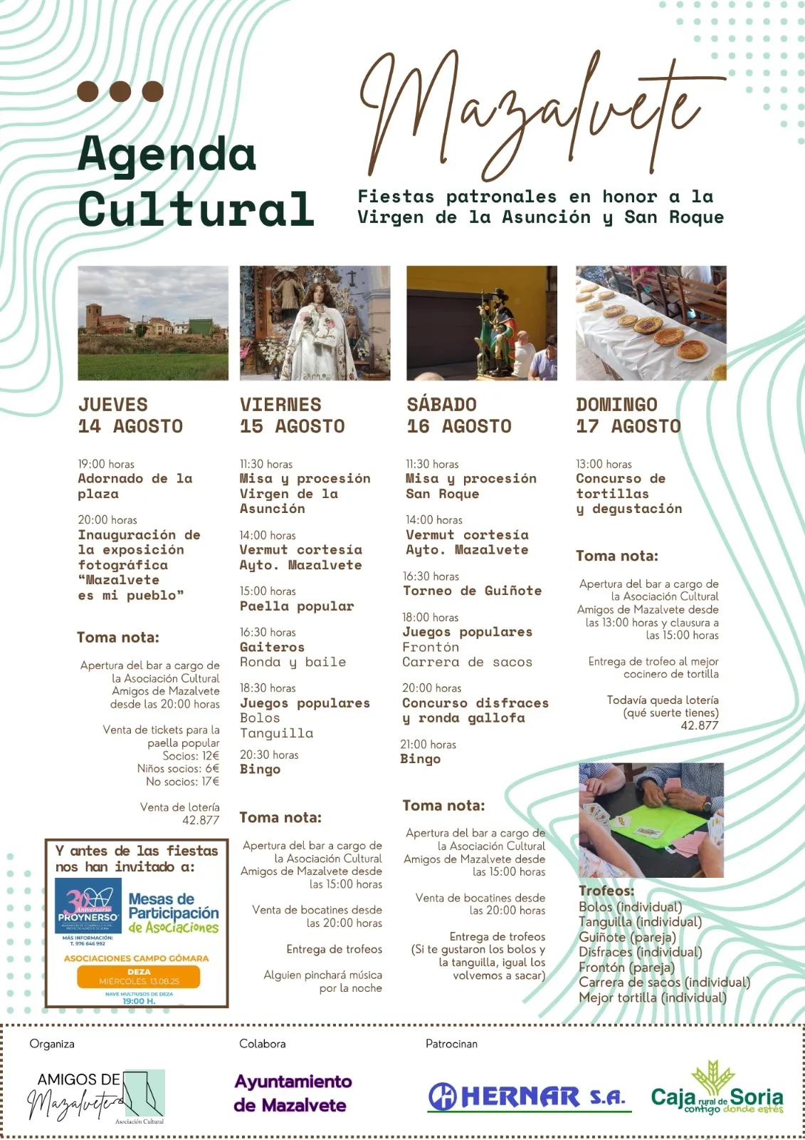 La localidad soriana de Mazalvete ultima los preparativos para sus fiestas patronales en honor a la Virgen de la Asunción y San Roque. Desde este jueves, 14 de agosto, y hasta el próximo domingo 17, vecinos y visitantes disfrutarán de un completo programa que combina devoción, cultura, gastronomía y la recuperación de antiguas tradiciones.