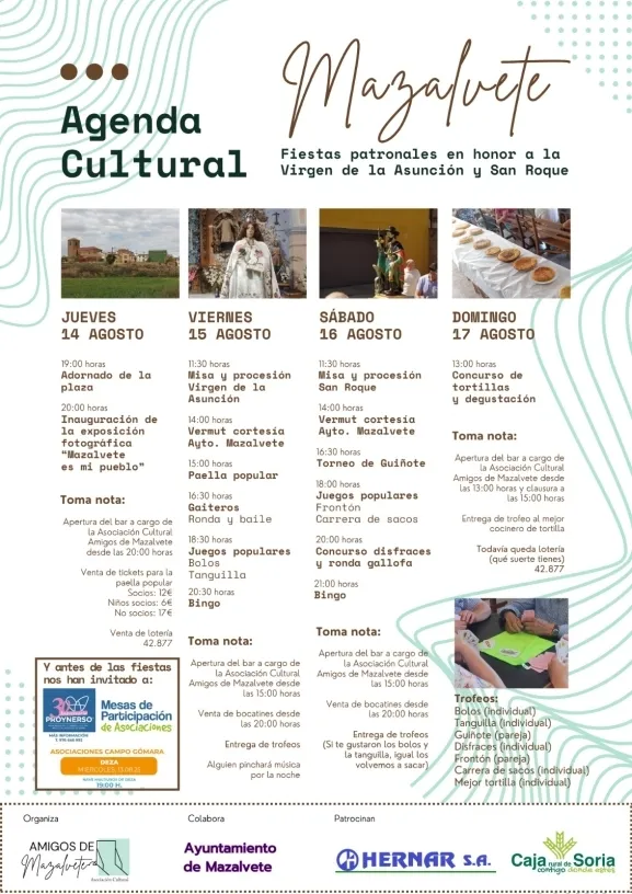 Las fiestas concluirán el domingo con la entrega de trofeos de las distintas competiciones. Desde la organización agradecen el patrocinio de la Caja Rural de Soria y Hernar SA, así como la indispensable colaboración del Ayuntamiento de Mazalvete para hacer posible esta completa agenda de actividades.