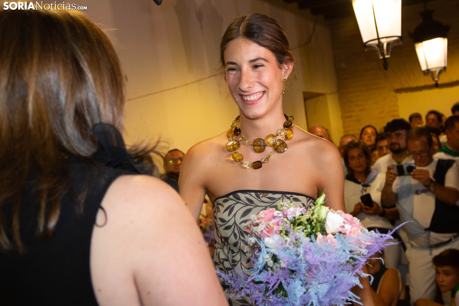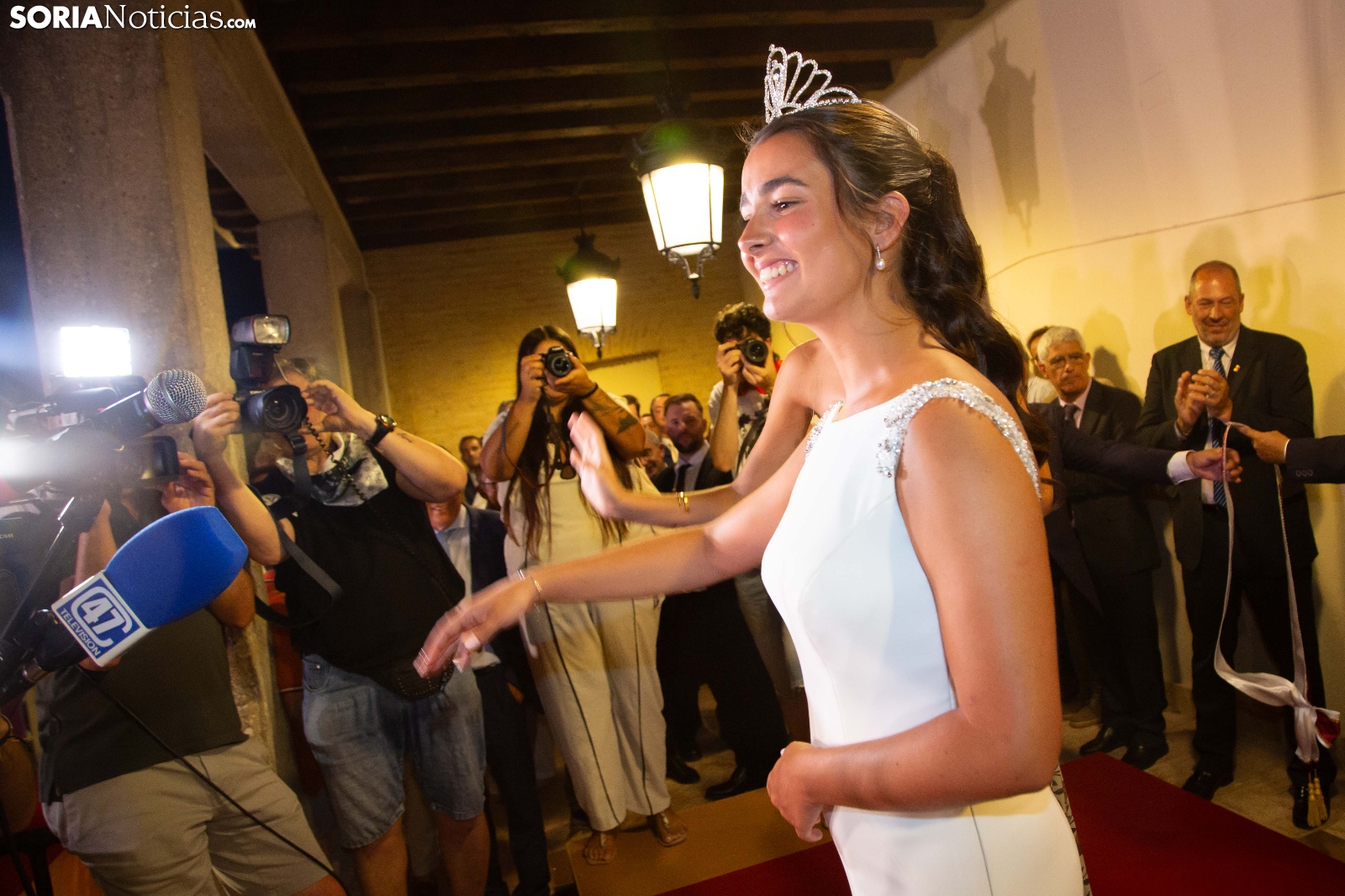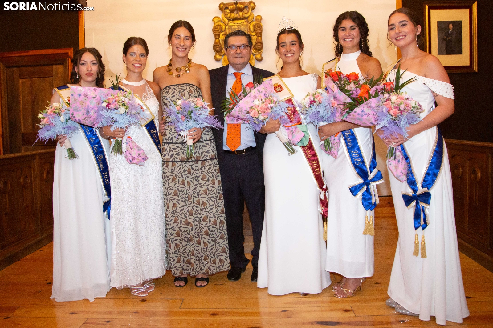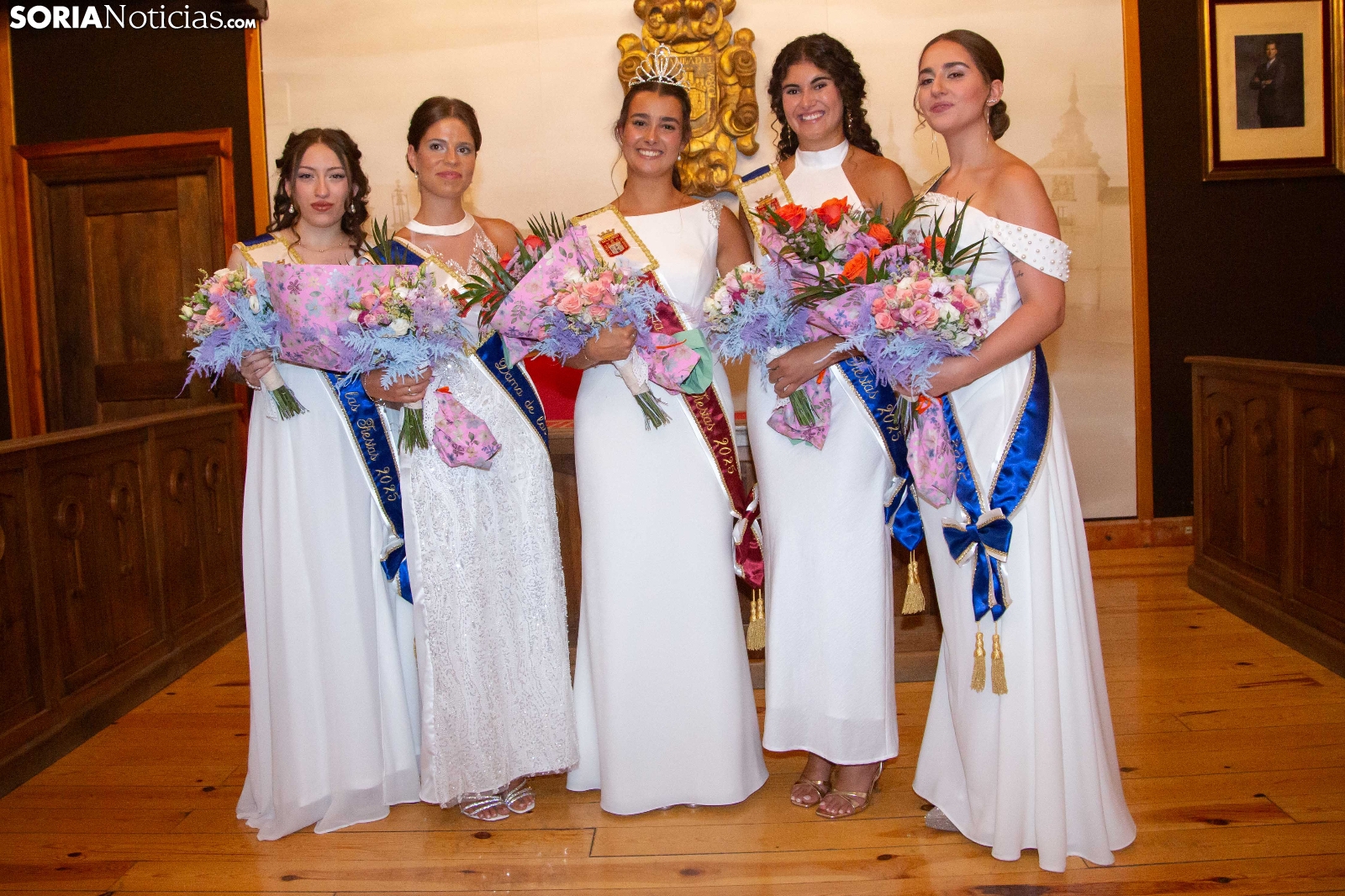 A reventar. El Burgo de Osma ha dado la bienvenida a sus fiestas patronales en honor a la Virgen del Espino y San Roque con un acto más que multitudinario en la plaza Mayor, cuando ha sido pronunciado el pregón por parte de miembros de las peñas Amistad y Contraste que conmemoran los cincuenta años de su fundación. La balconada de la casa consistorial ha sido el centro de todas las miradas y oídos que han presenciado la apertura de unos días que se esperan calurosos, no solo en el ambiente, sino también en los corazones de vecinos y llegados. Previamente a la arenga, fueron presentadas la reina y damas que serán la imagen que proyecte al municipio: Lucía Izquierdo del Pino ostenta el honor de estar acompañada por Amalia Gonzalo, Ainara Carro, Jovana del Val y Carlota de Pablo. Ellas sirven, a partir de hoy, de ejemplo de tradición y relevo generacional hasta el 19 de agosto en un programa pleno que une solemnidad y fiesta.