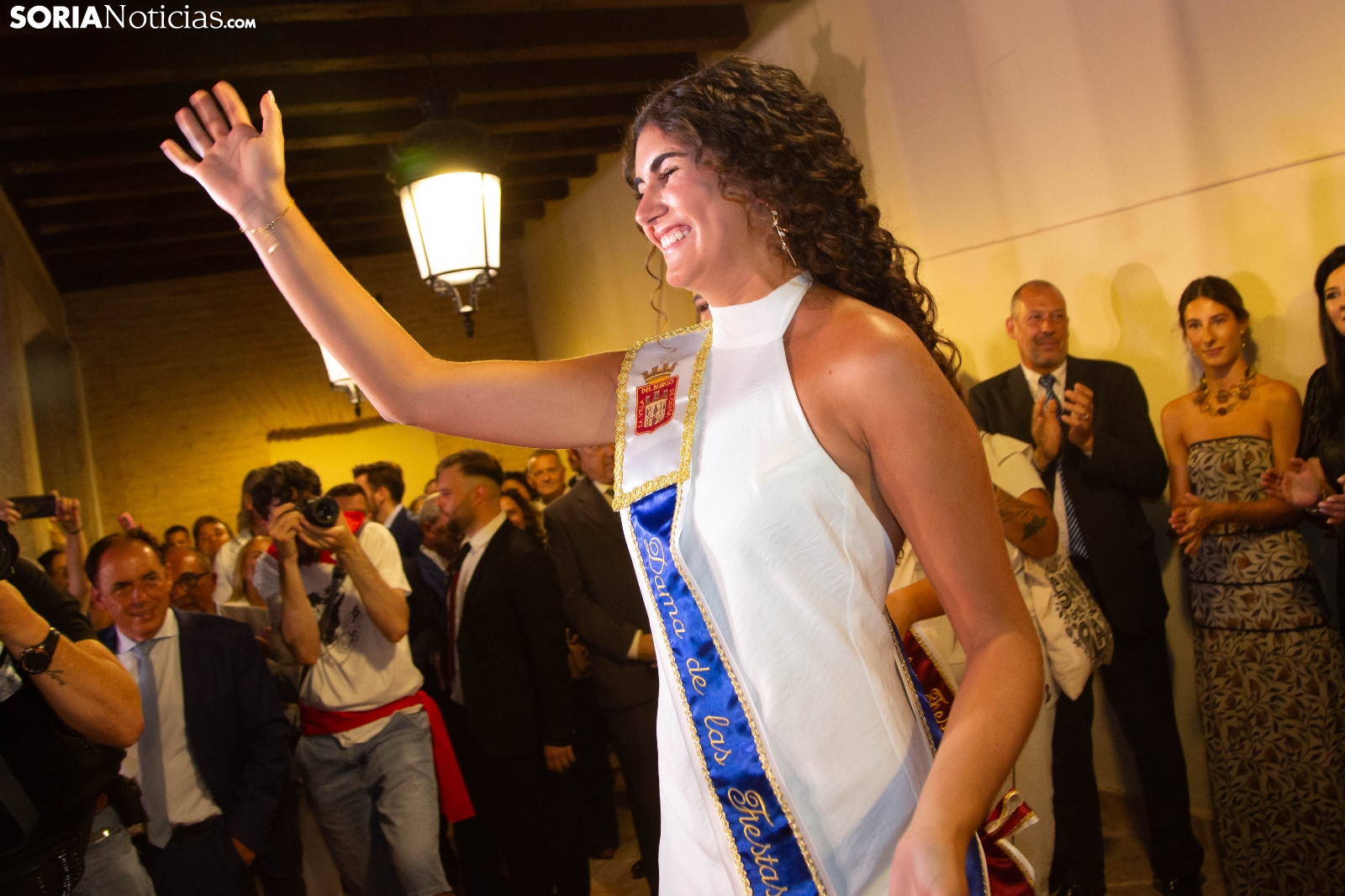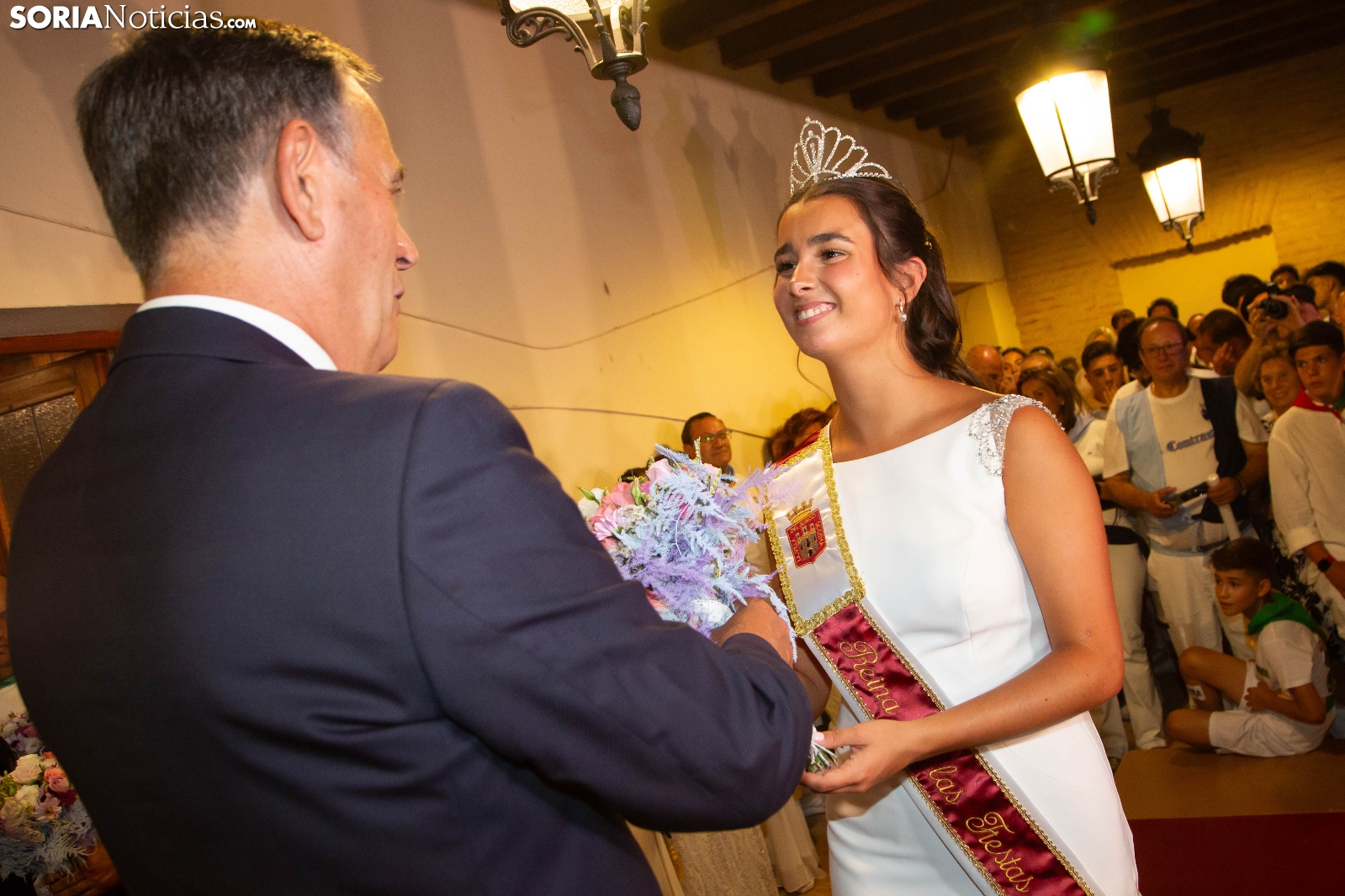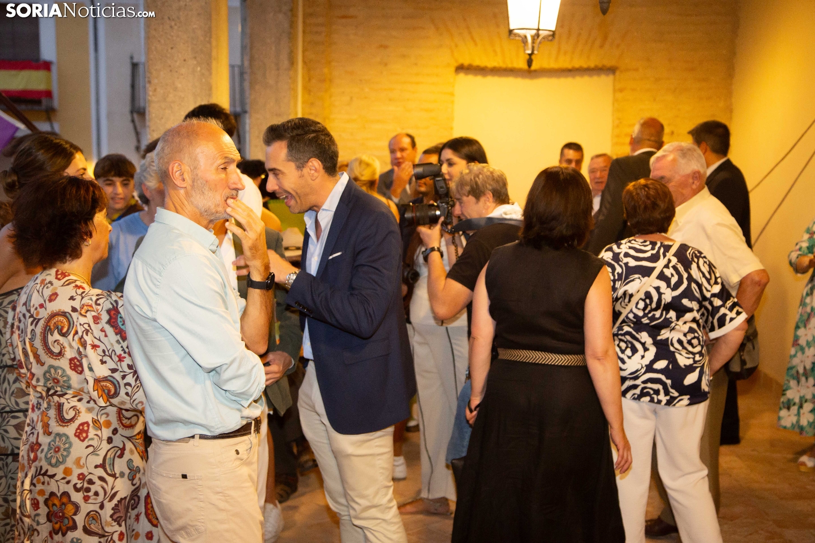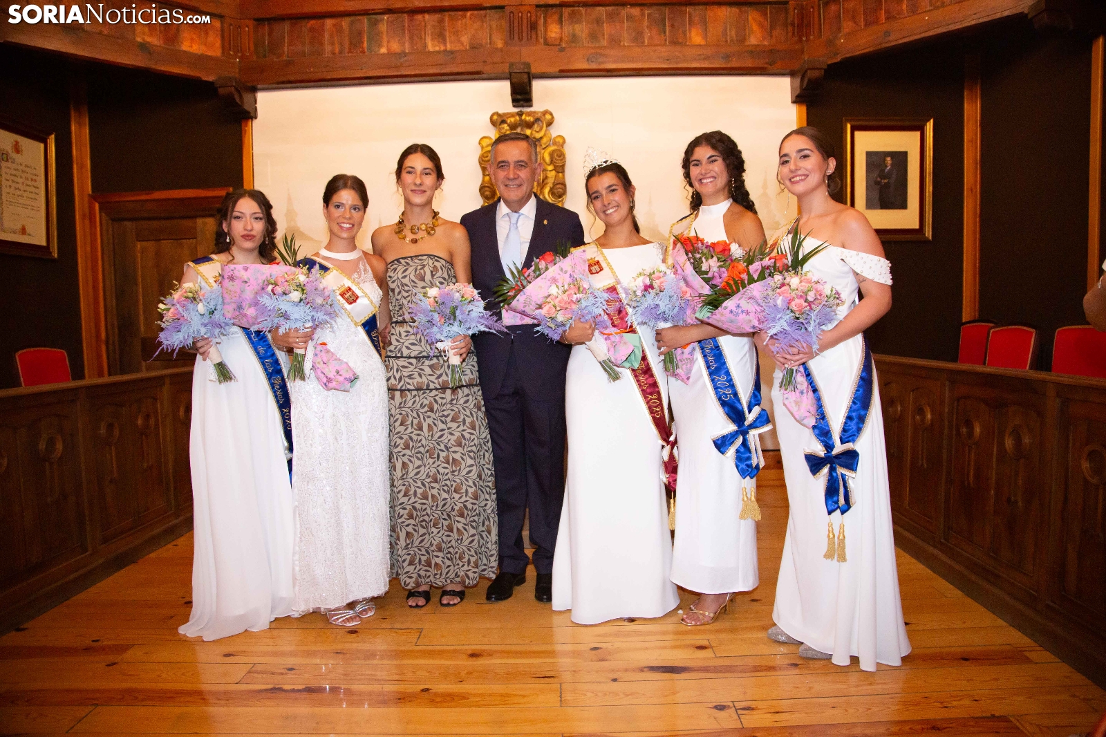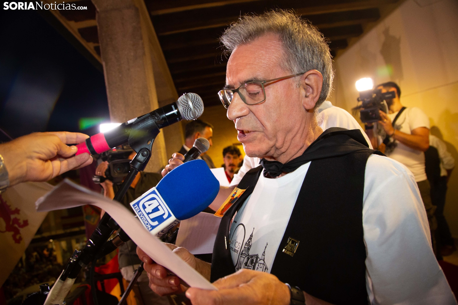 A reventar. El Burgo de Osma ha dado la bienvenida a sus fiestas patronales en honor a la Virgen del Espino y San Roque con un acto más que multitudinario en la plaza Mayor, cuando ha sido pronunciado el pregón por parte de miembros de las peñas Amistad y Contraste que conmemoran los cincuenta años de su fundación. La balconada de la casa consistorial ha sido el centro de todas las miradas y oídos que han presenciado la apertura de unos días que se esperan calurosos, no solo en el ambiente, sino también en los corazones de vecinos y llegados. Previamente a la arenga, fueron presentadas la reina y damas que serán la imagen que proyecte al municipio: Lucía Izquierdo del Pino ostenta el honor de estar acompañada por Amalia Gonzalo, Ainara Carro, Jovana del Val y Carlota de Pablo. Ellas sirven, a partir de hoy, de ejemplo de tradición y relevo generacional hasta el 19 de agosto en un programa pleno que une solemnidad y fiesta.