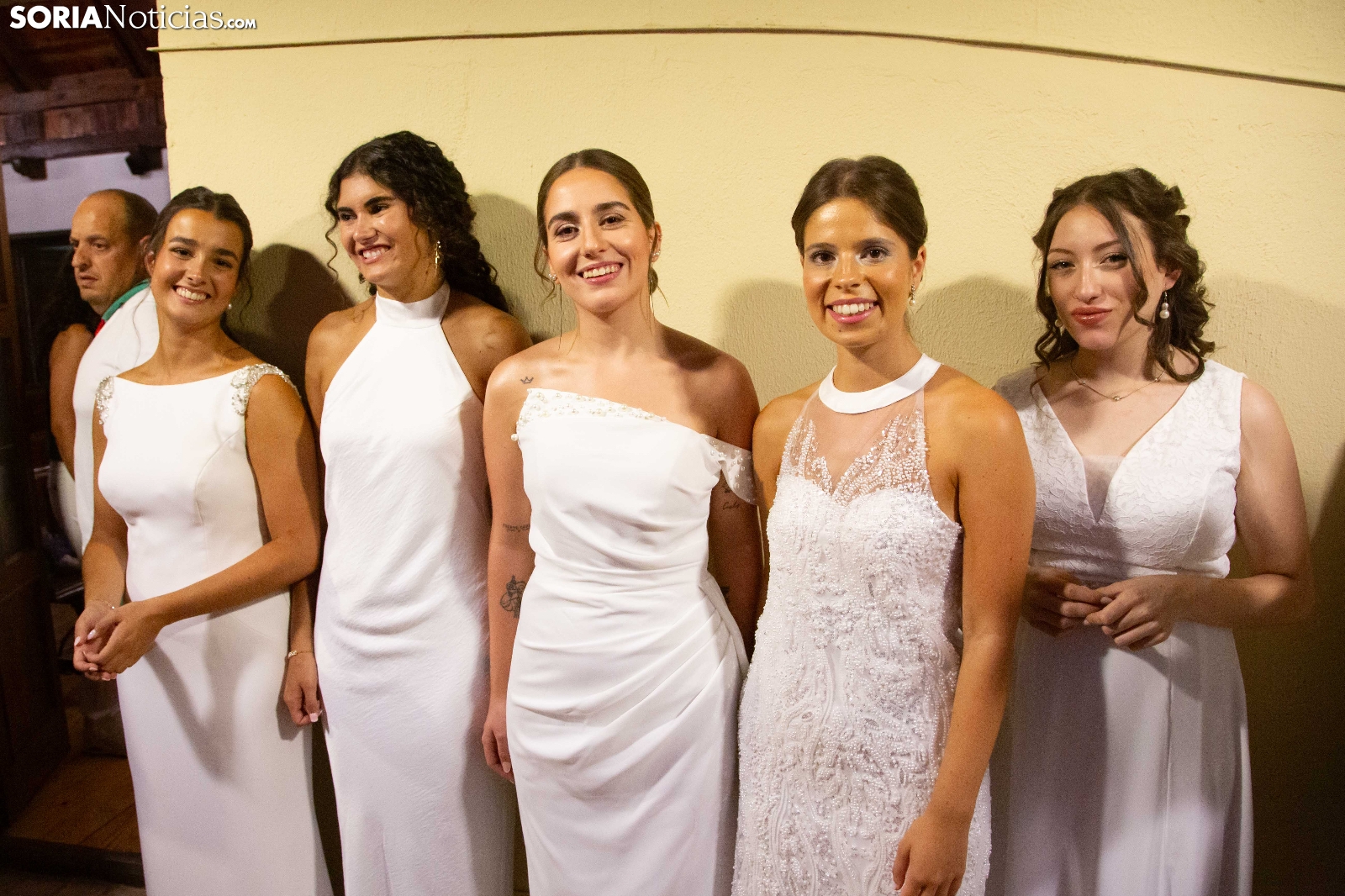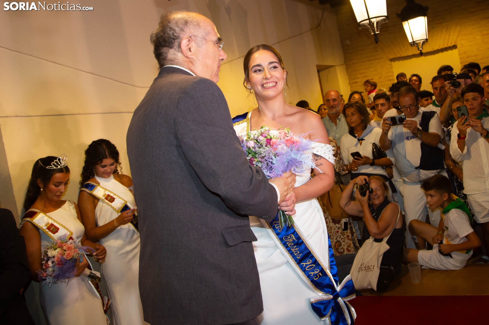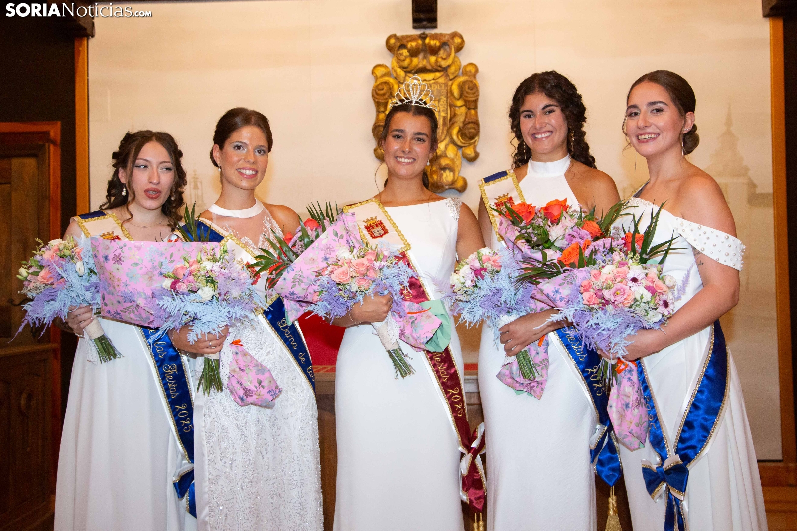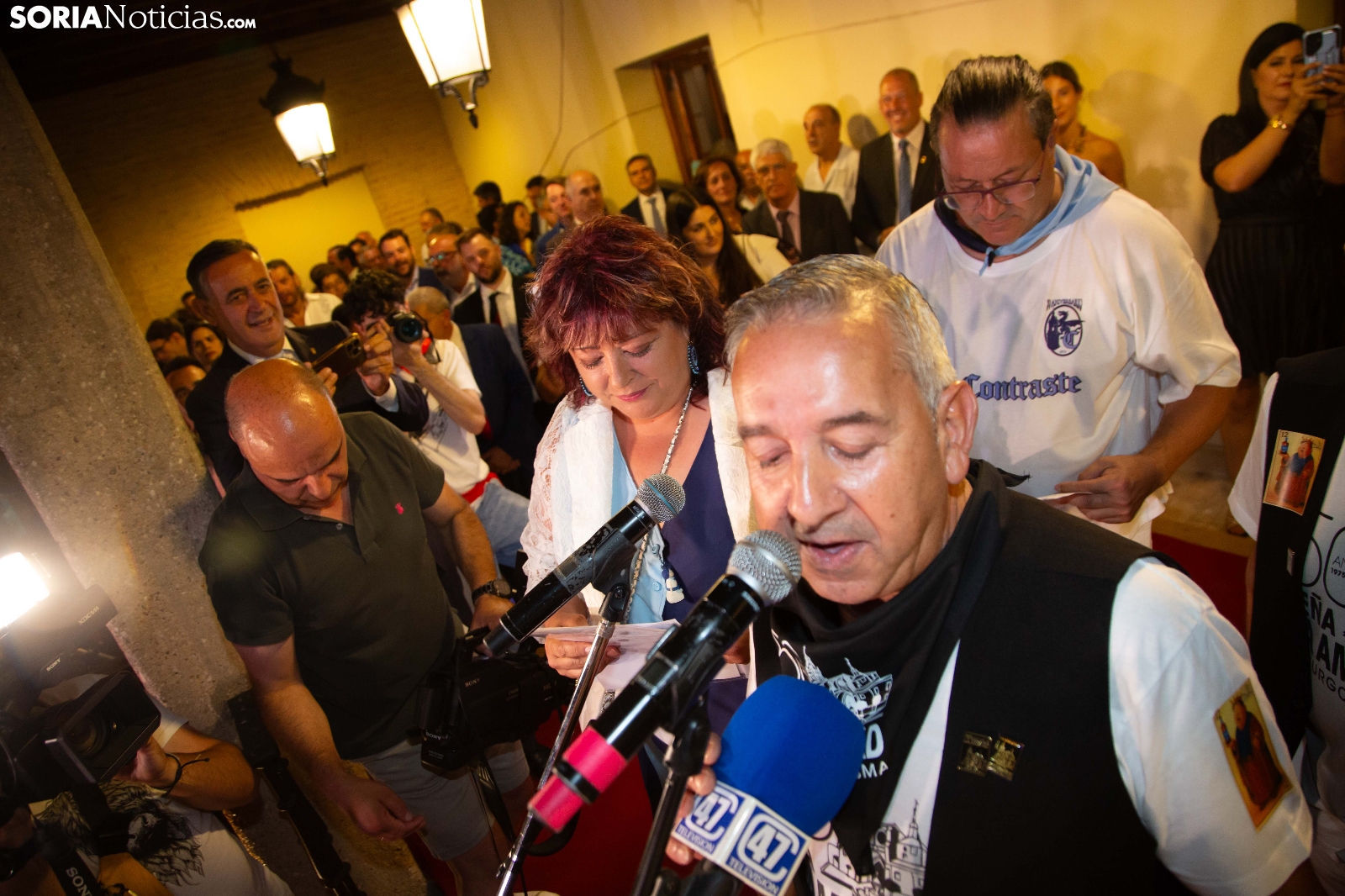 A reventar. El Burgo de Osma ha dado la bienvenida a sus fiestas patronales en honor a la Virgen del Espino y San Roque con un acto más que multitudinario en la plaza Mayor, cuando ha sido pronunciado el pregón por parte de miembros de las peñas Amistad y Contraste que conmemoran los cincuenta años de su fundación. La balconada de la casa consistorial ha sido el centro de todas las miradas y oídos que han presenciado la apertura de unos días que se esperan calurosos, no solo en el ambiente, sino también en los corazones de vecinos y llegados. Previamente a la arenga, fueron presentadas la reina y damas que serán la imagen que proyecte al municipio: Lucía Izquierdo del Pino ostenta el honor de estar acompañada por Amalia Gonzalo, Ainara Carro, Jovana del Val y Carlota de Pablo. Ellas sirven, a partir de hoy, de ejemplo de tradición y relevo generacional hasta el 19 de agosto en un programa pleno que une solemnidad y fiesta.
