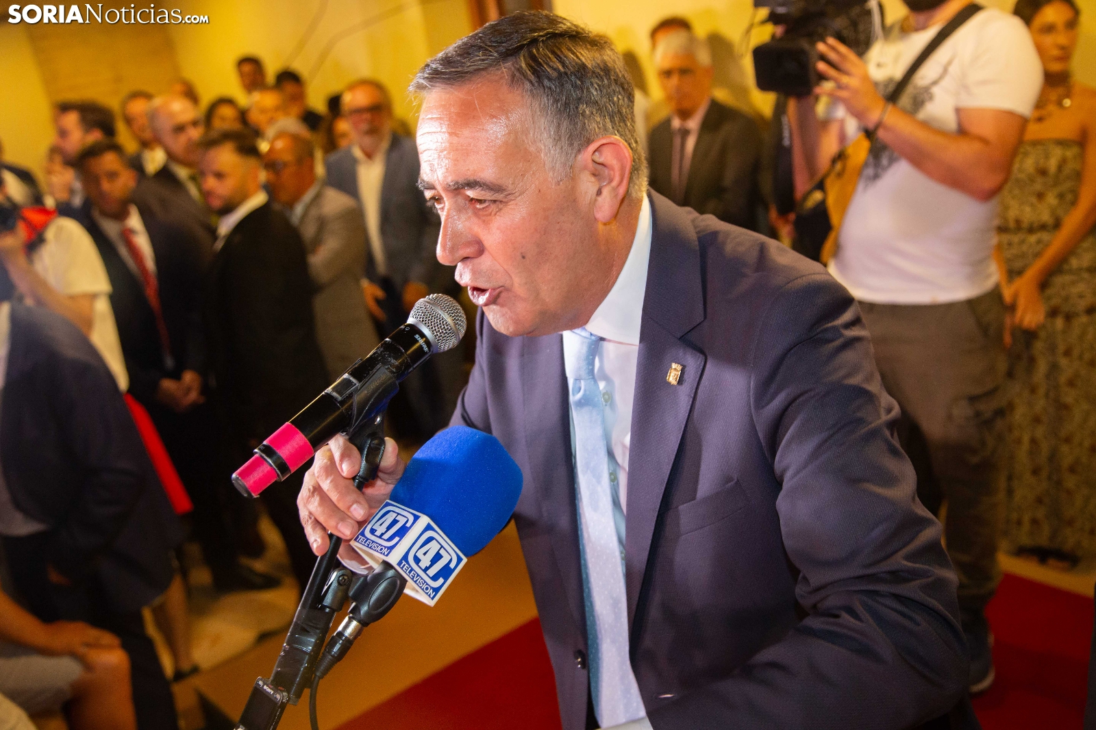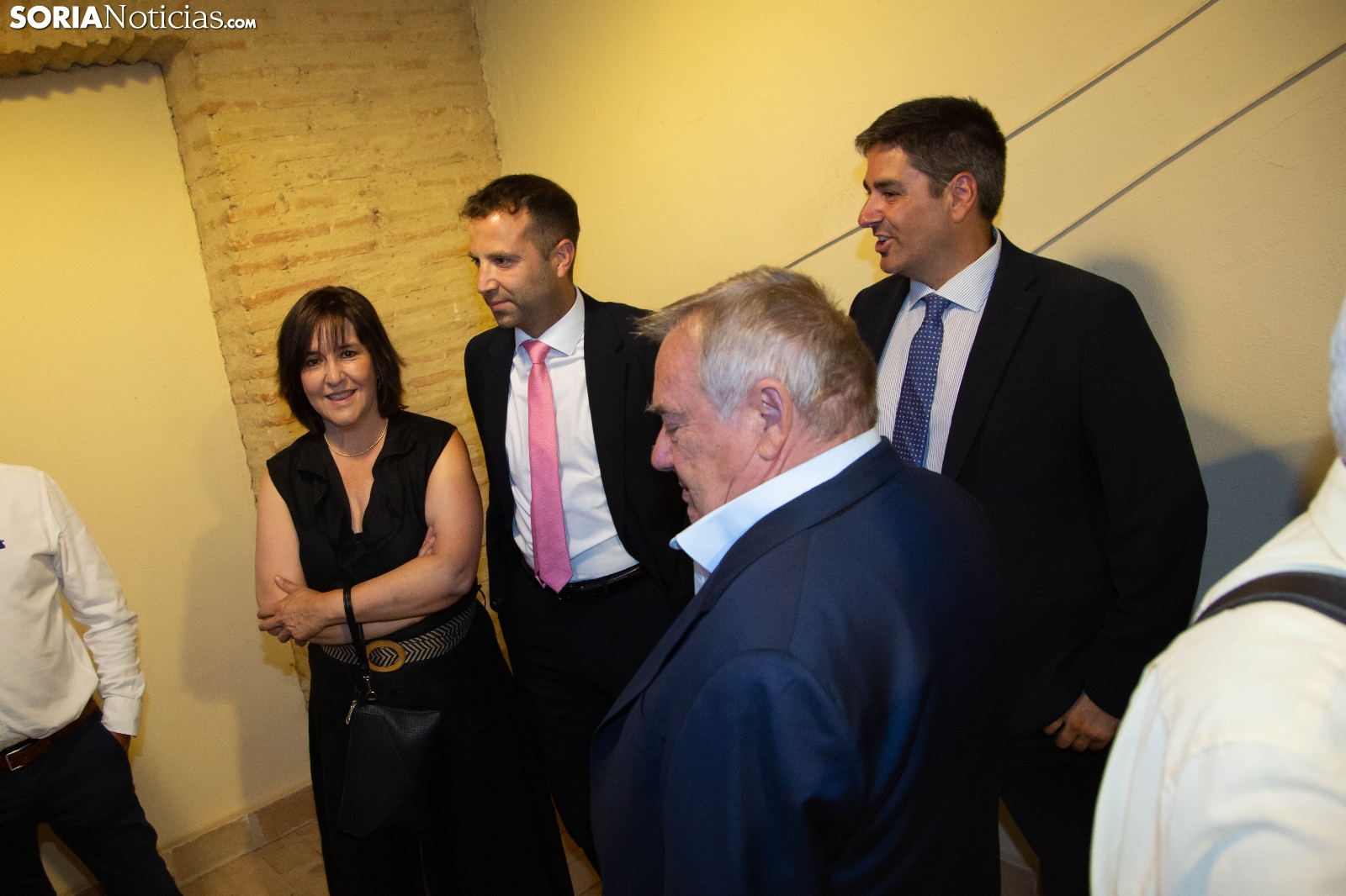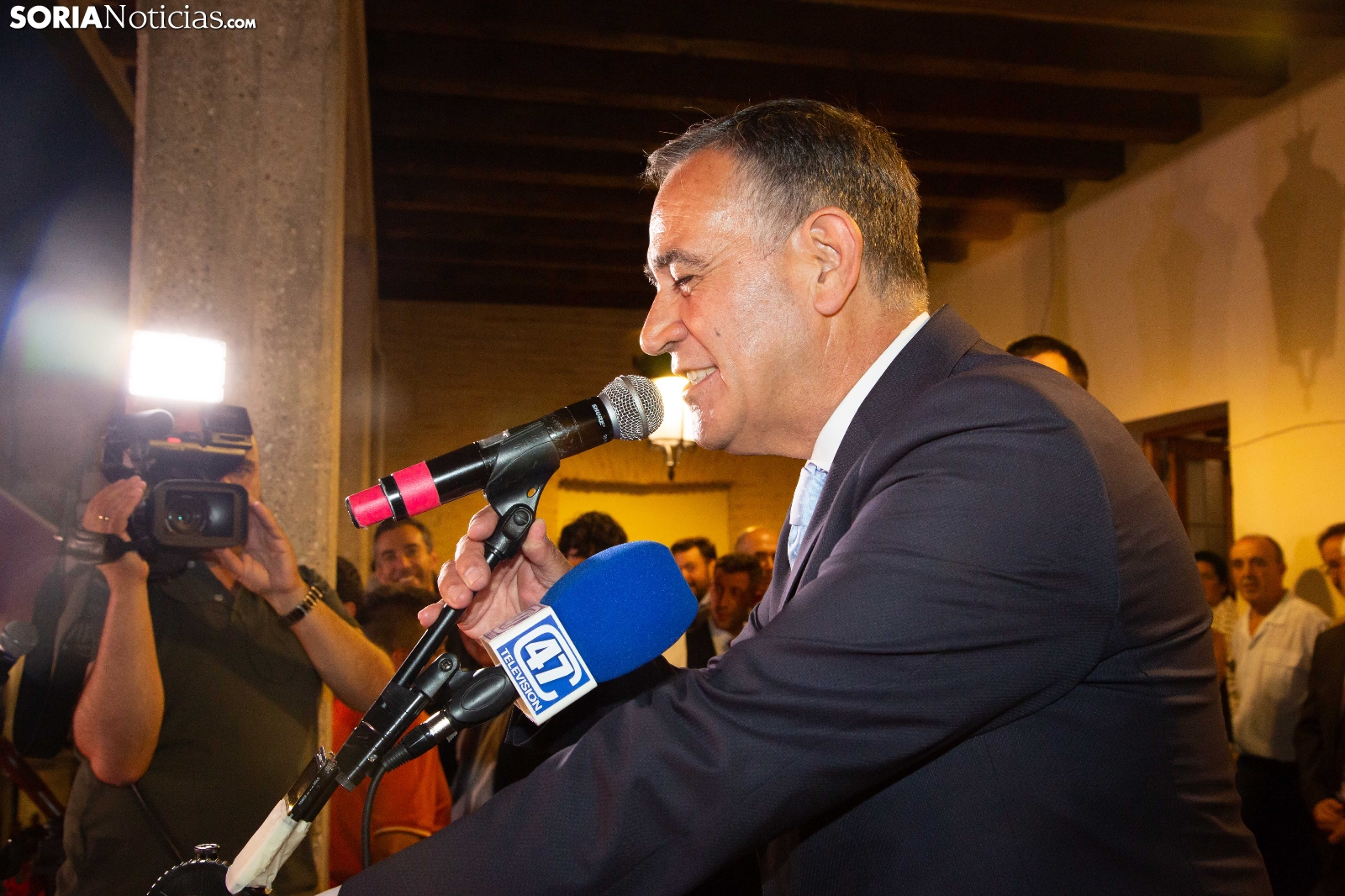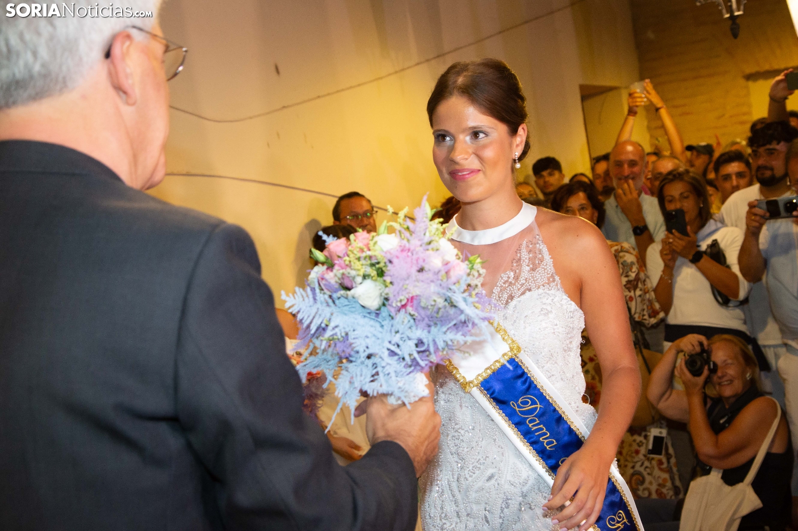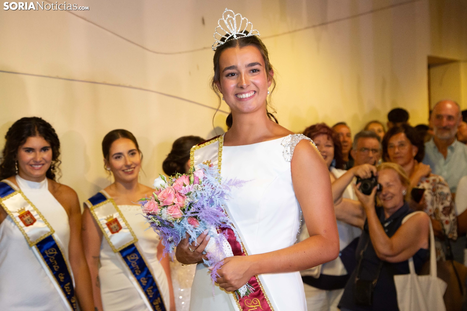 A reventar. El Burgo de Osma ha dado la bienvenida a sus fiestas patronales en honor a la Virgen del Espino y San Roque con un acto más que multitudinario en la plaza Mayor, cuando ha sido pronunciado el pregón por parte de miembros de las peñas Amistad y Contraste que conmemoran los cincuenta años de su fundación. La balconada de la casa consistorial ha sido el centro de todas las miradas y oídos que han presenciado la apertura de unos días que se esperan calurosos, no solo en el ambiente, sino también en los corazones de vecinos y llegados. Previamente a la arenga, fueron presentadas la reina y damas que serán la imagen que proyecte al municipio: Lucía Izquierdo del Pino ostenta el honor de estar acompañada por Amalia Gonzalo, Ainara Carro, Jovana del Val y Carlota de Pablo. Ellas sirven, a partir de hoy, de ejemplo de tradición y relevo generacional hasta el 19 de agosto en un programa pleno que une solemnidad y fiesta.