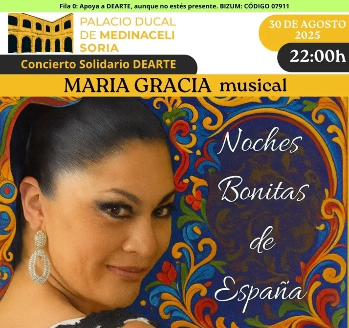 El Palacio Ducal de Medinaceli se prepara para acoger una velada dedicada a la copla el próximo 30 de agosto. La cantante y actriz María Gracia presenta su espectáculo 'Noches Bonitas de España', una propuesta que fusiona música, poesía y recuerdos personales en un formato que busca la interacción con el público.