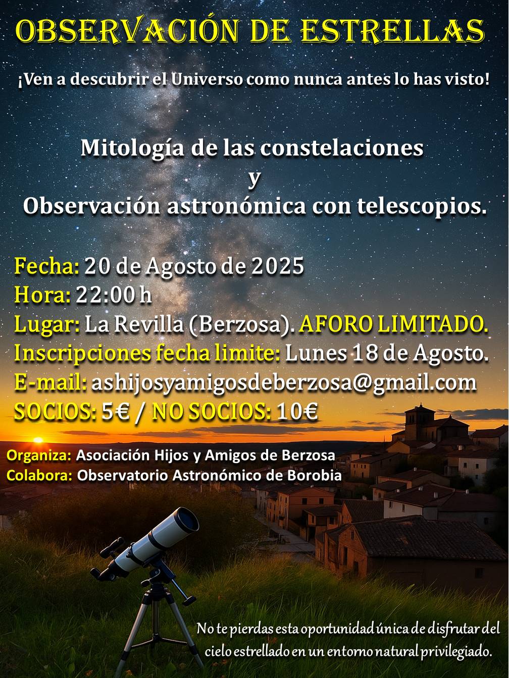 La primera jornada de las fiestas, el miércoles 20 de agosto, contará con una actividad singular: una observación de estrellas. Esta propuesta astronómica busca aprovechar la calidad del cielo nocturno de la zona para ofrecer una experiencia diferente a los asistentes. Según detallan desde la organización, la actividad permitirá a los participantes conocer más sobre las constelaciones y los cuerpos celestes.