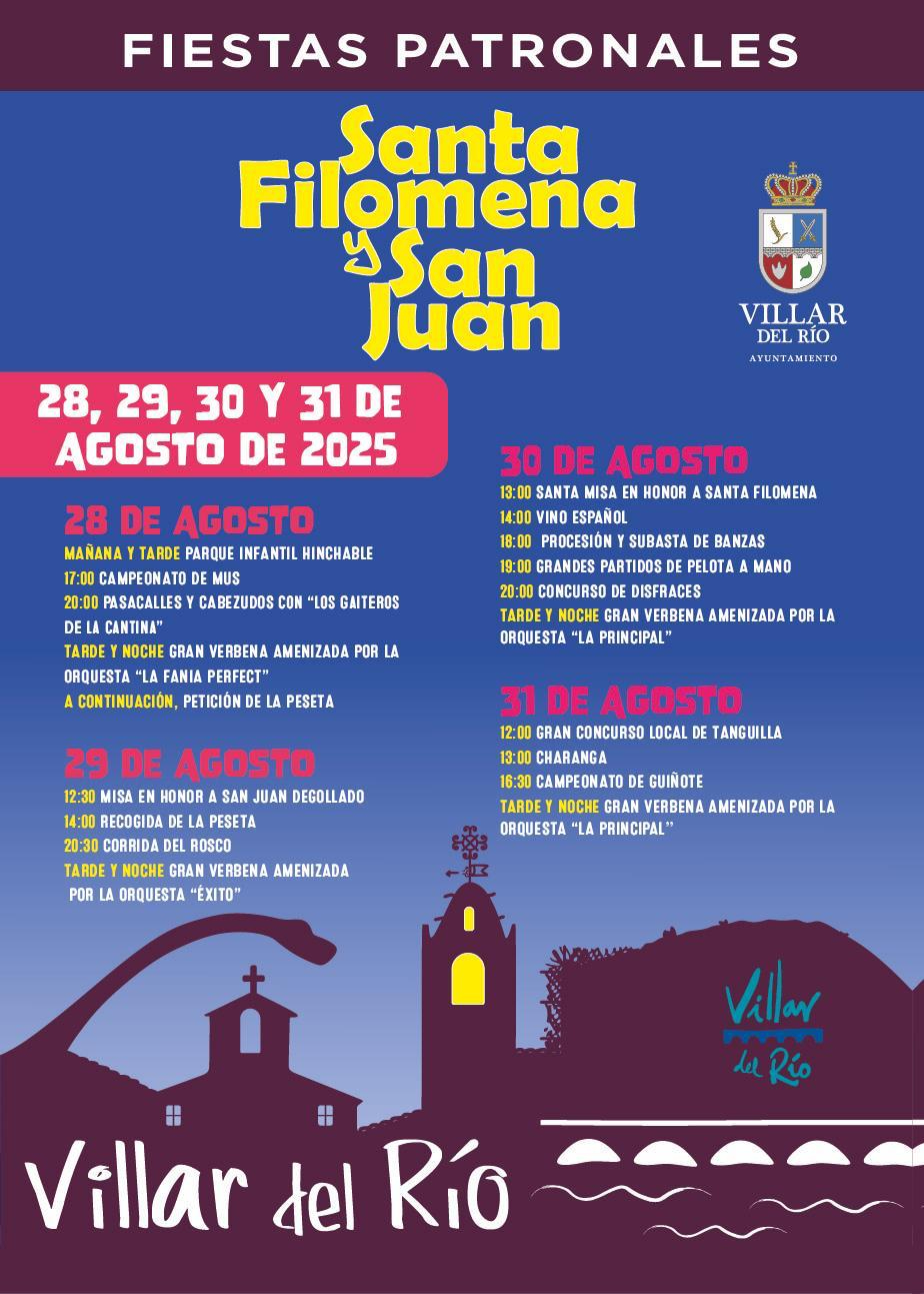 La localidad de Villar del Río, en Tierras Altas, ha presentado el programa oficial de sus fiestas patronales en honor a Santa Filomena y San Juan. Las celebraciones se desarrollarán del 28 al 31 de agosto de 2025, con cuatro jornadas que combinan actos religiosos, verbenas populares con tres orquestas, juegos tradicionales como mus o tanguilla y actividades para todos los públicos. El Ayuntamiento ha detallado un completo calendario de eventos que incluye misas, procesiones, campeonatos y un parque infantil.