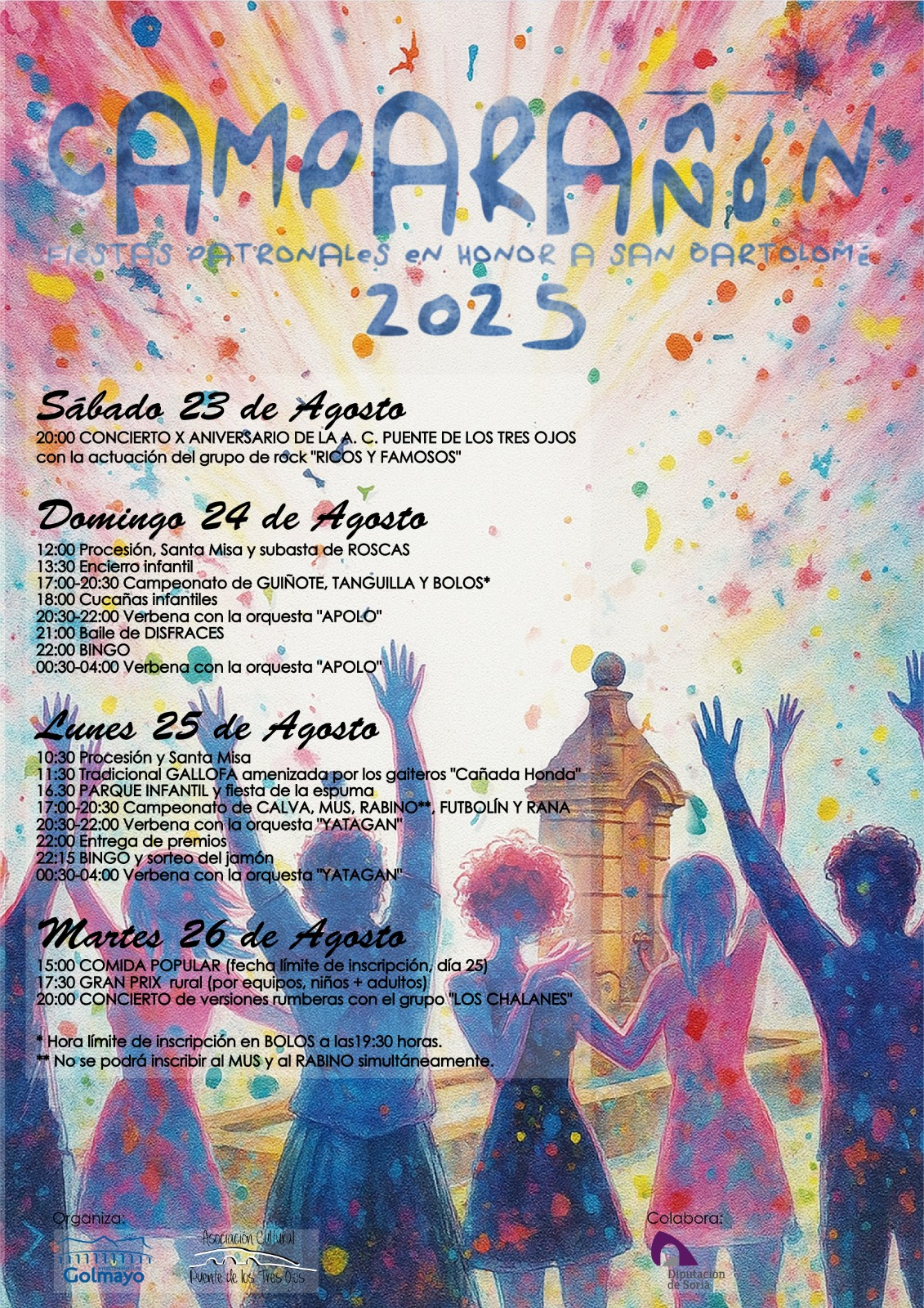La localidad soriana de Camparañón se prepara para vivir sus días grandes con la celebración de sus fiestas patronales. A partir de este sábado, 23 de agosto, y hasta el martes día 26, la localidad perteneciente a Golmayo acoge un completo programa de actividades pensado para todos los públicos, que combina tradición, música y hermandad.