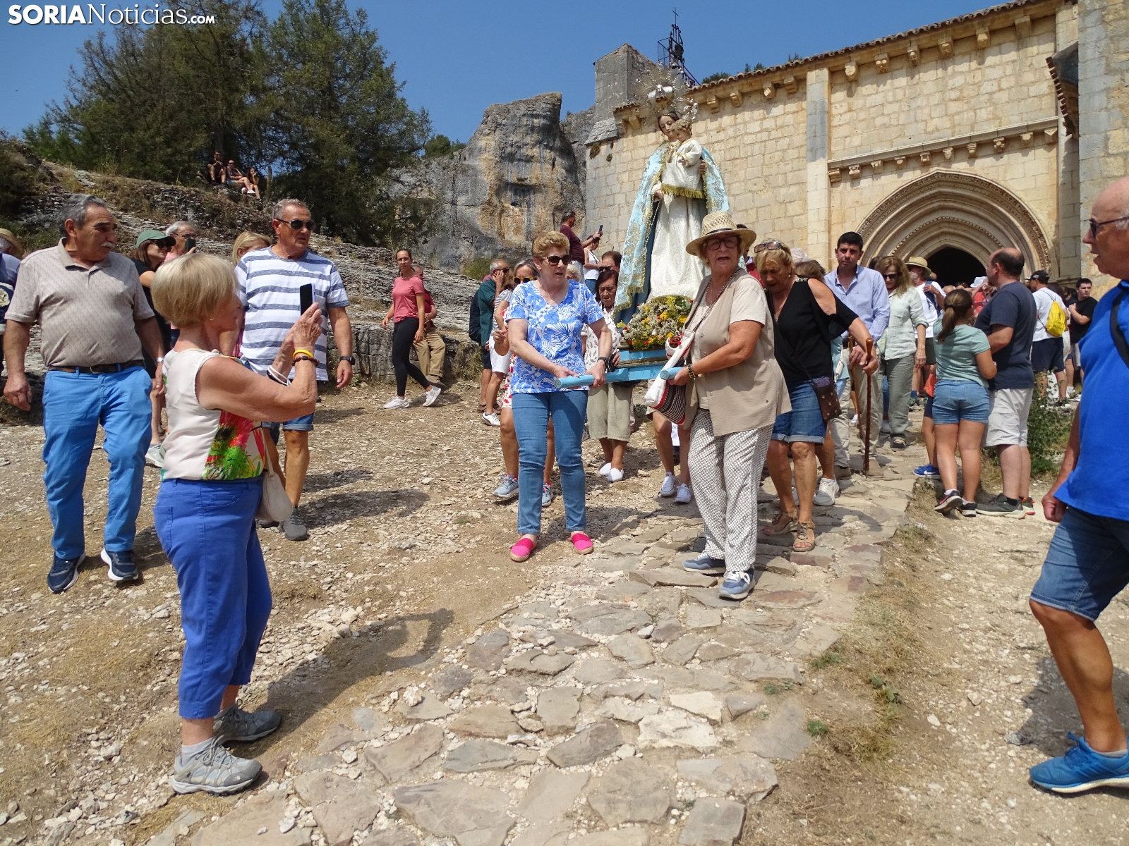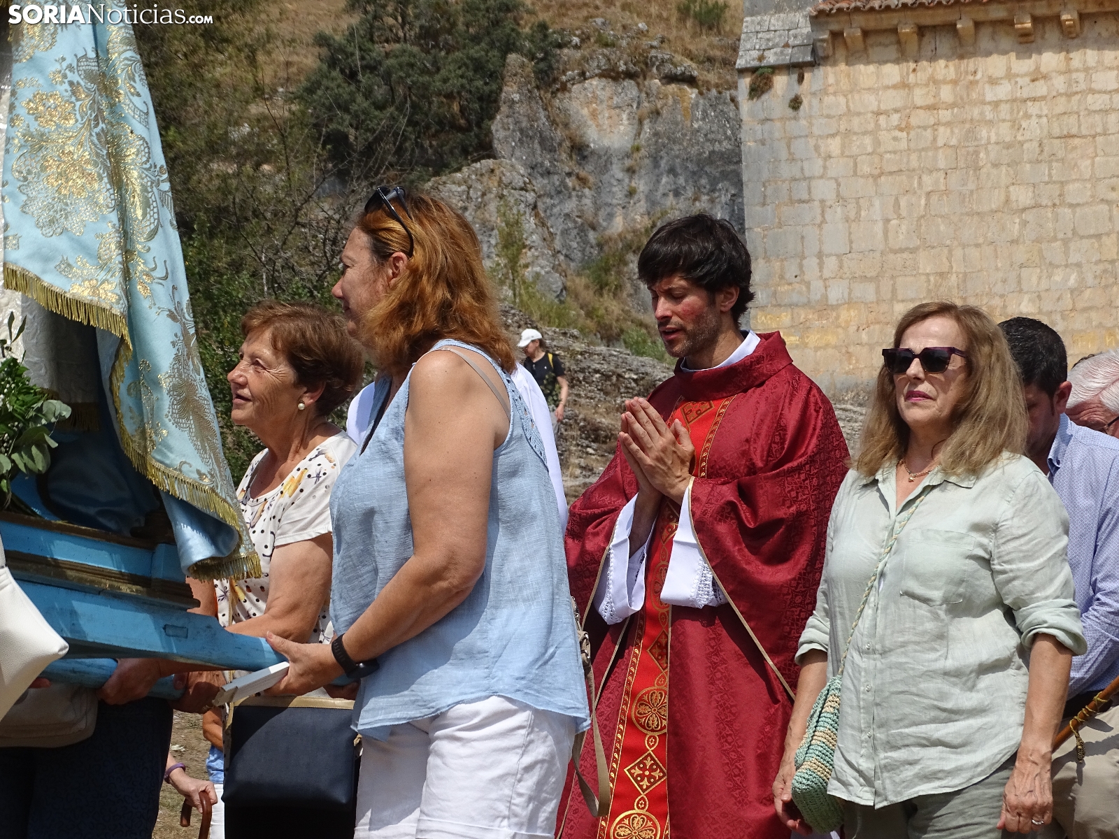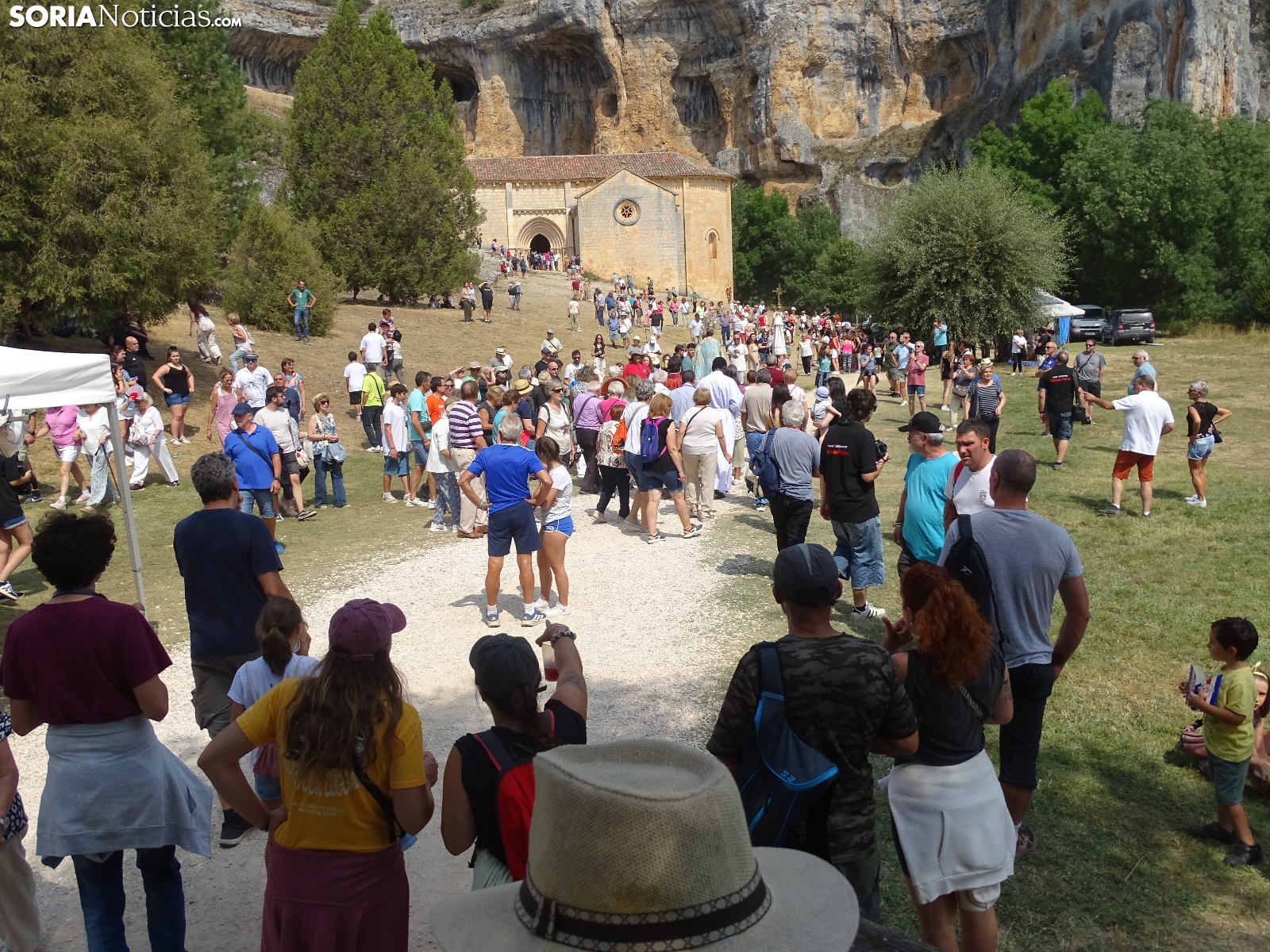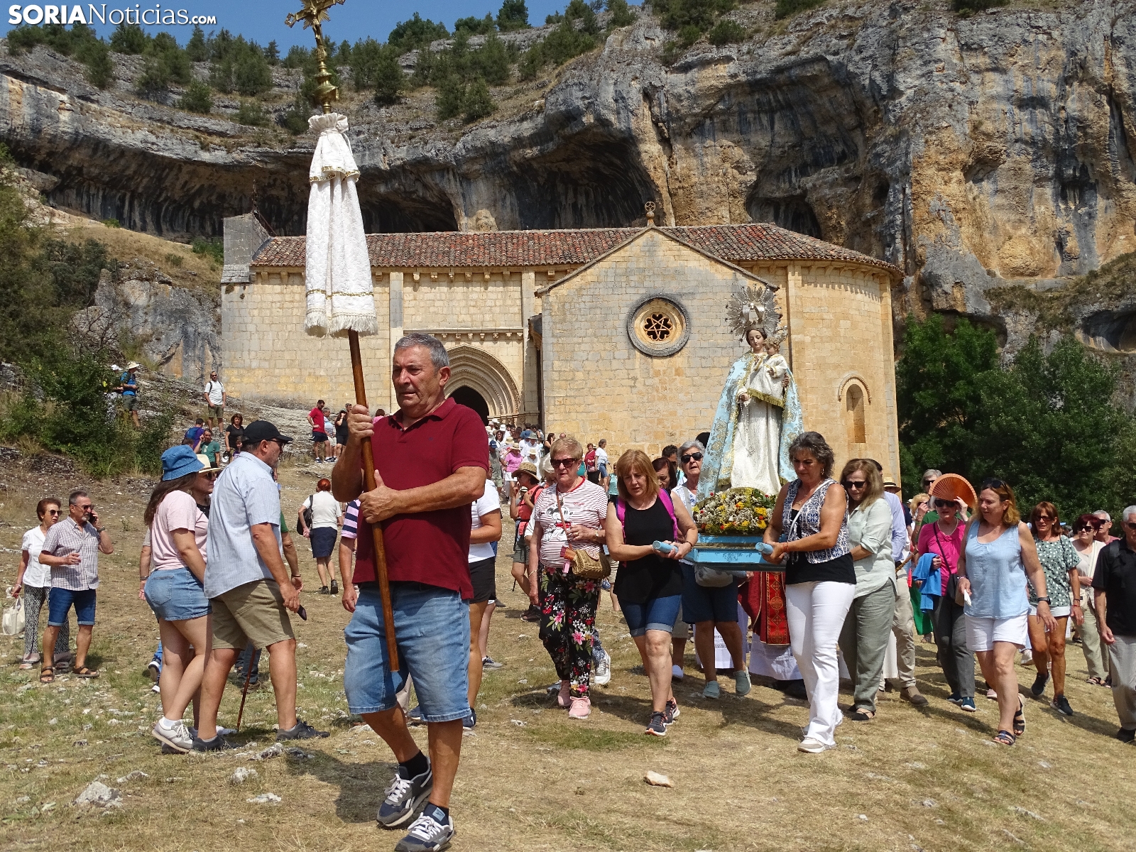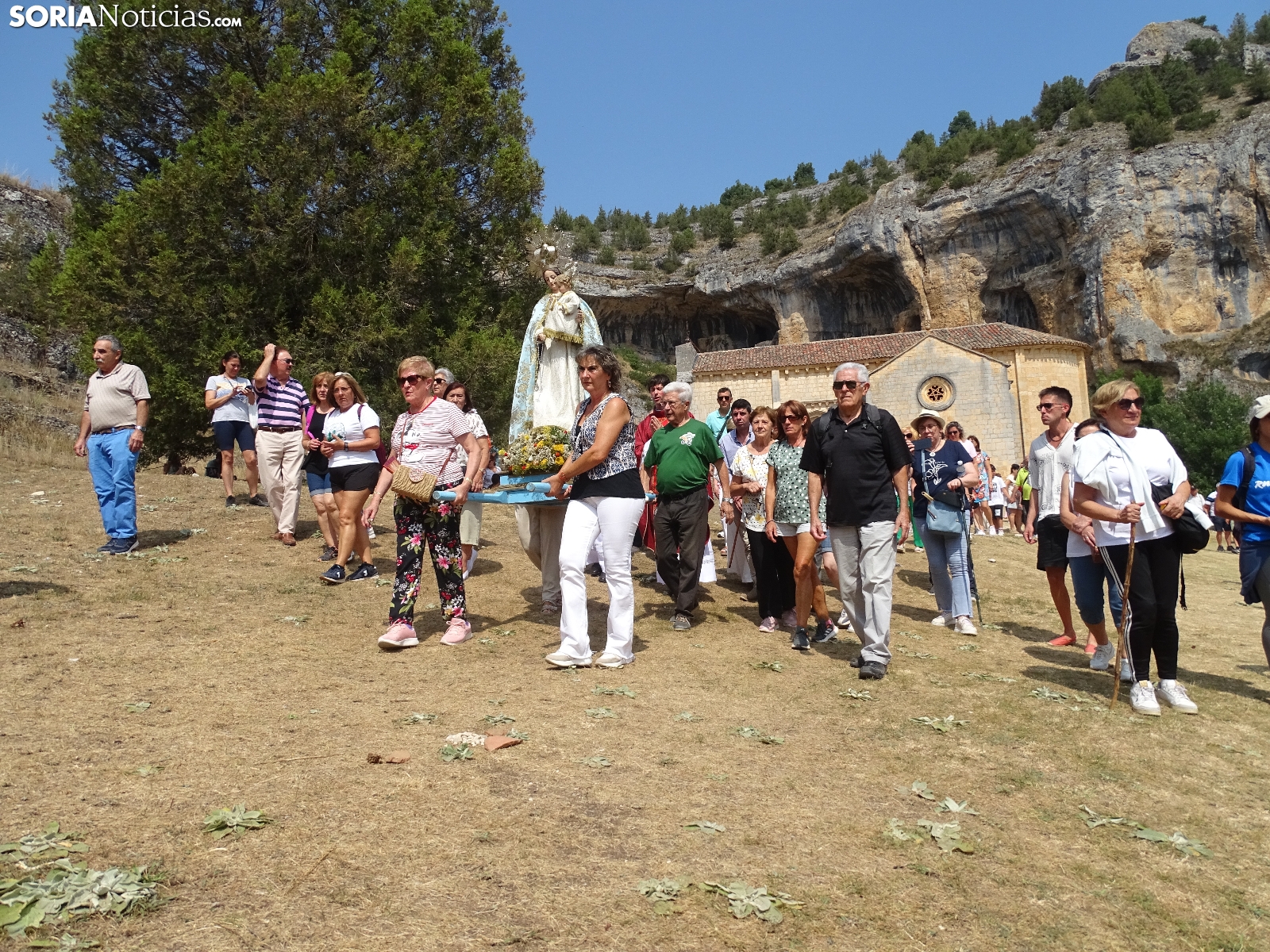 En el día del santo, la ermita de San Bartolomé, en el cañón del río Lobos ha vuelto a albergar la romería que tiene lugar en este bello paraje natural soriano. Este domingo, cientos de peregrinos se han dado cita para asistir a las dos eucaristías, la primera a las 10 de la mañana y la segunda a las 12 del mediodía, para dar continuidad a una tradición devocional, como se hace cada 24 de agosto. Como es costumbre, al término de la segunda ceremonia ha dado comienzo la procesión con la imagen de la Virgen de la Salud. Una jornada campestre radiante a la que han acudido devotos de localidades cercanas, sobre todo de Herrera de Soria, Nafría de Ucero y Ucero, municipios regentes del denominado Comunero de San Bartolomé.