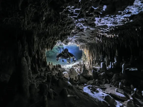 La carrera submarina de Alfonso lo ha llevado por ecosistemas extraordinarios: desde los coloridos arrecifes australianos donde inició su aventura, hasta las profundidades del Triángulo de Coral indonesio, epicentro de la biodiversidad marina mundial. Actualmente, los cenotes mexicanos de Yucatán son su oficina diaria, donde guía a buzos a través de impresionantes cavernas subacuáticas de agua dulce. Sus encuentros con tiburones tigre, mantas y ballenas jorobadas han marcado momentos inolvidables en su trayectoria como buzo profesional.