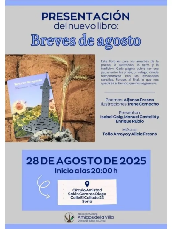 La agenda cultural de la capital soriana acoge esta tarde la presentación de una nueva obra poética. El salón Gerardo Diego del Círculo Amistad Numancia se convierte en el escenario para dar a conocer el poemario 'Breves de Agosto', del autor Alfonso Fresno.