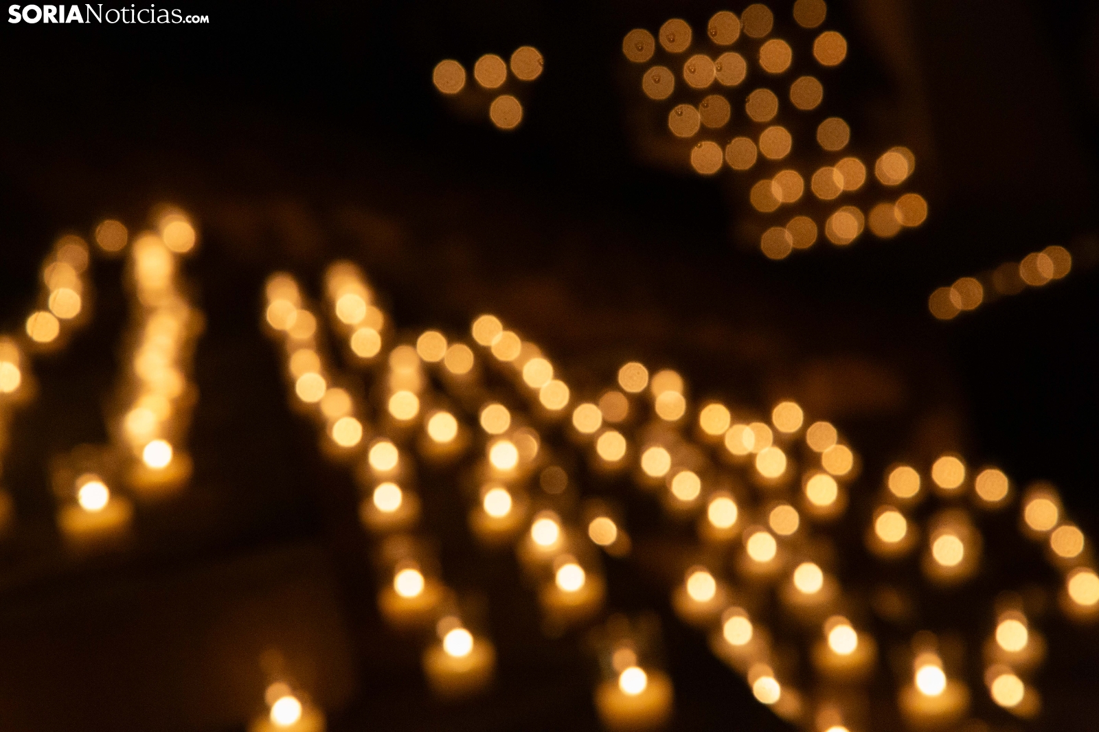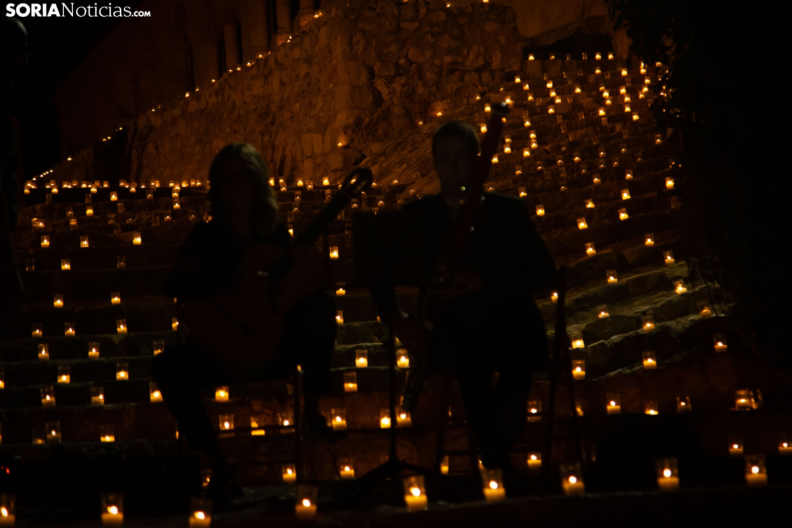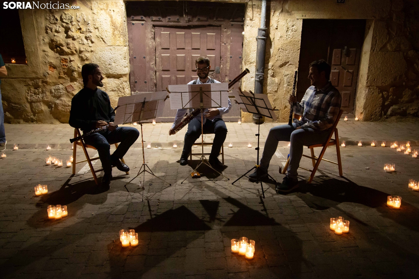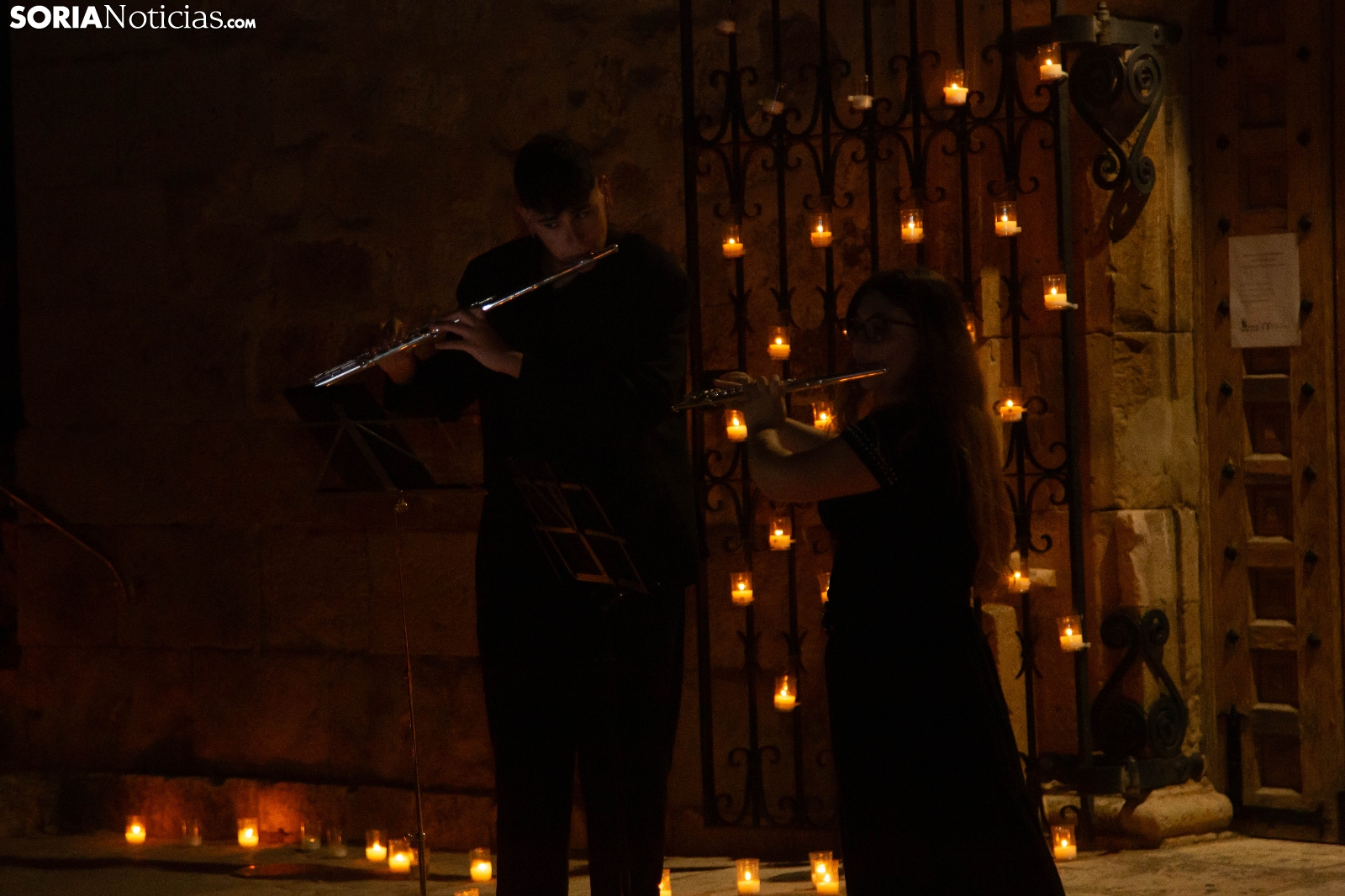 San Esteban de Gormaz ha vivido esta noche una de sus citas más especiales con la celebración de su tradicional Noche de Música y Velas, un evento que ha vuelto a demostrar su gran poder de convocatoria. Miles de candelas han creado una atmósfera única, iluminando con su luz tenue y cálida el imponente patrimonio monumental de la villa y generando un ambiente íntimo que ha cautivado a los asistentes. El recorrido, que ha guiado a un numeroso público por enclaves tan emblemáticos como la galería porticada de San Miguel o la escalinata de Santa María del Rivero, se ha convertido en un auditorio al aire libre donde el talento de los jóvenes músicos de la Joven Orquesta Sinfónica de Soria (JOSS) ha sido el gran protagonista. Las agrupaciones Dúo Undine, Triunvirato y Dúo Hamartía han demostrado una notable calidad interpretativa con repertorios cuidadosamente seleccionados que abarcaron desde la solemnidad del Barroco hasta la emoción de bandas sonoras contemporáneas, fusionándose a la perfección con la solemnidad de la piedra y el parpadeo de las llamas.
