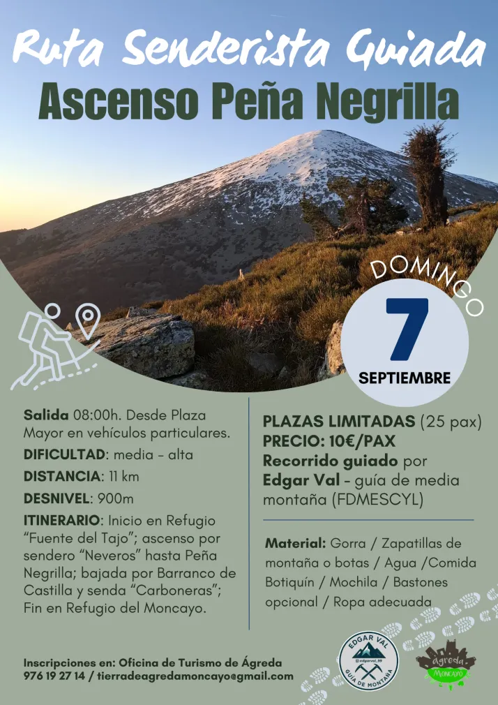 Para la jornada del domingo 7 de septiembre, la programación se traslada a la naturaleza con una actividad deportiva. Se ha organizado un ascenso guiado a Peña Negrilla, uno de los picos emblemáticos del entorno del Moncayo. La ruta partirá desde el refugio del Moncayo y permitirá a los senderistas disfrutar de unas vistas privilegiadas de la comarca. Al igual que con el 'escape room', para participar en esta actividad es necesario contactar con la Oficina de Turismo de Ágreda para formalizar la inscripción y recibir información detallada sobre el recorrido y el equipamiento necesario.
