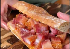 Para ello explica cómo se tiene que hacer la elaboración. "Ponemos aceite de oliva bien caliente y metemos los torreznos por la parte de la piel hasta que quede bien crunchy", explica. Luego los corta en trozos, abre el pan y llega el momento más polémico de dicho bocadillo.