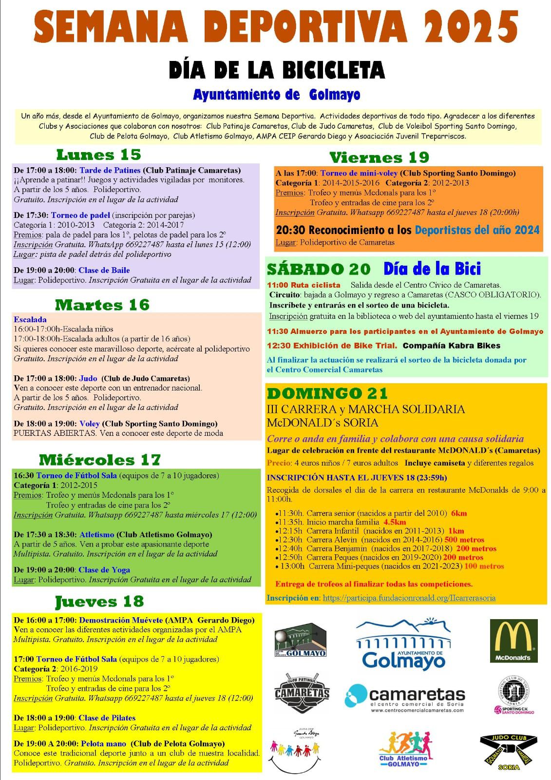 El Ayuntamiento de Golmayo organiza su Semana Deportiva del 14 al 21 de septiembre, con más de veinte actividades gratuitas para todos los públicos. El programa incluye la XV Carrera Popular, el Día de la Bici y la III Carrera y Marcha Solidaria McDonald’s Soria.