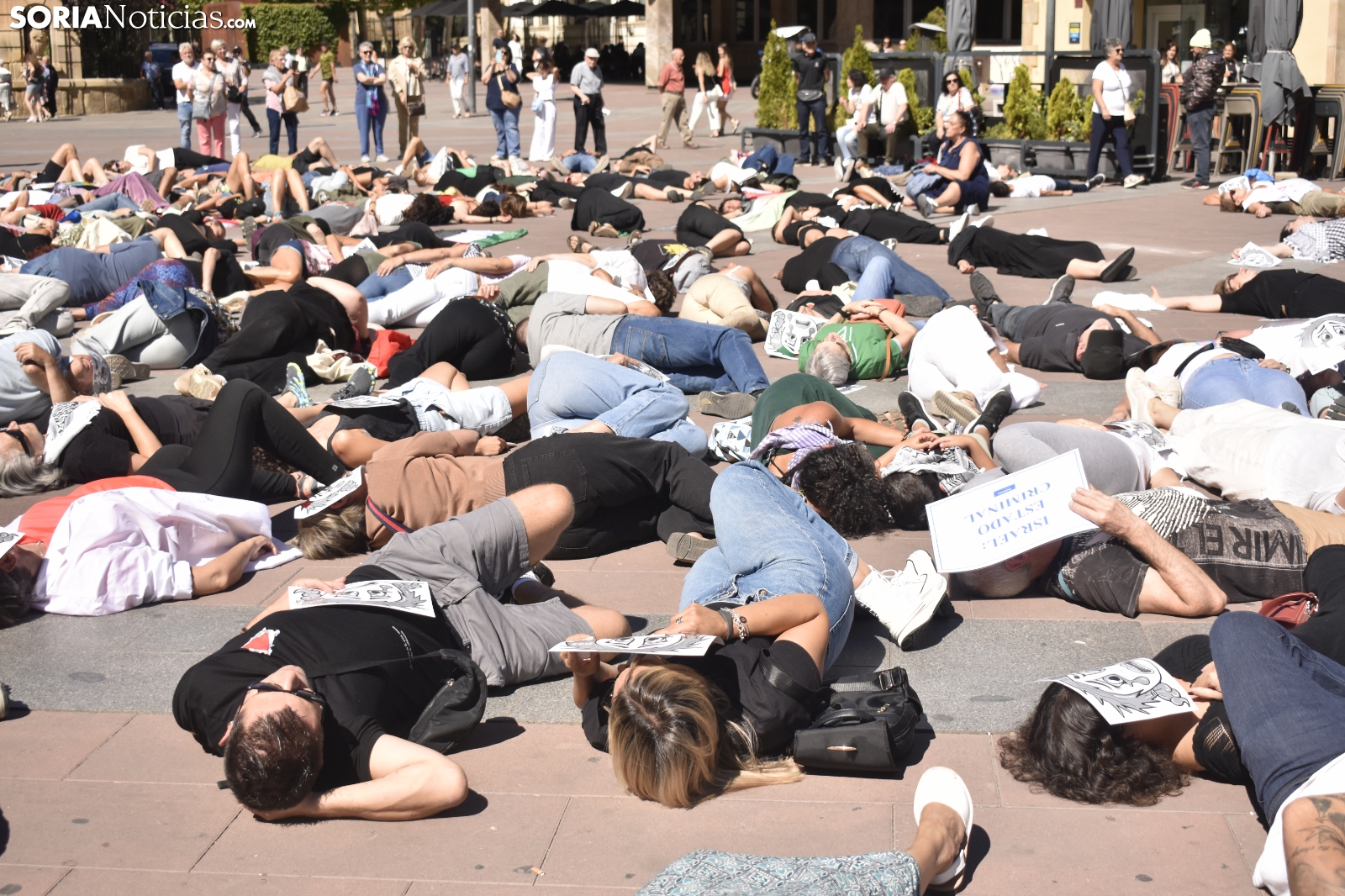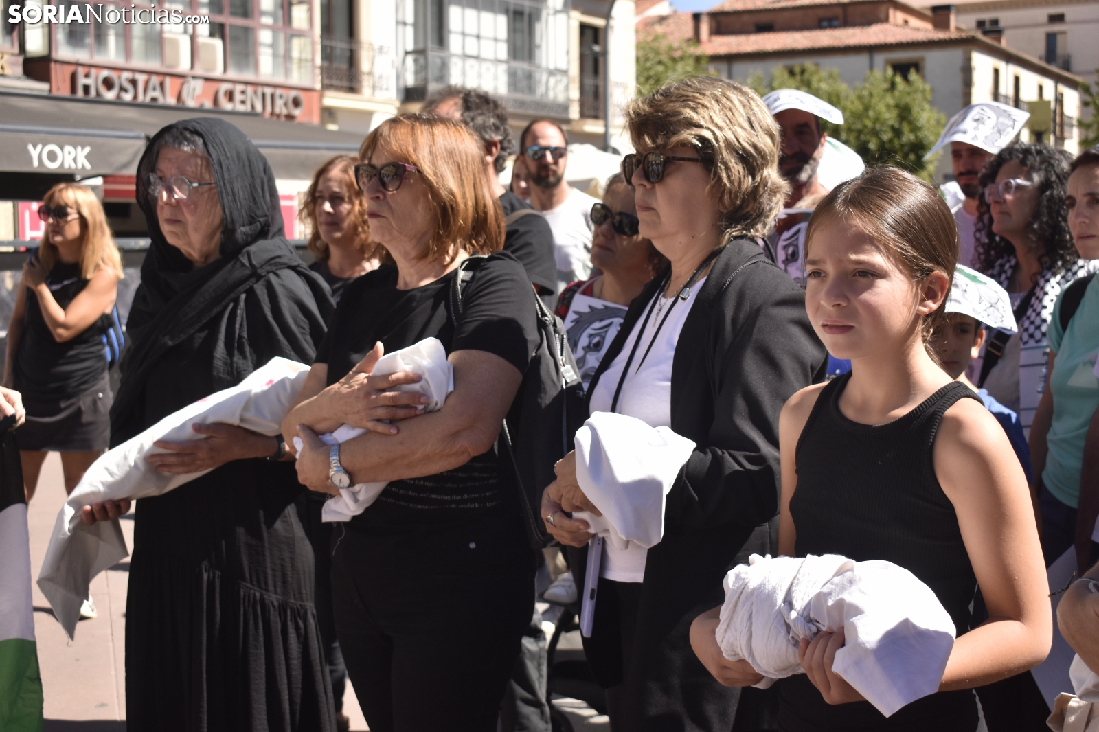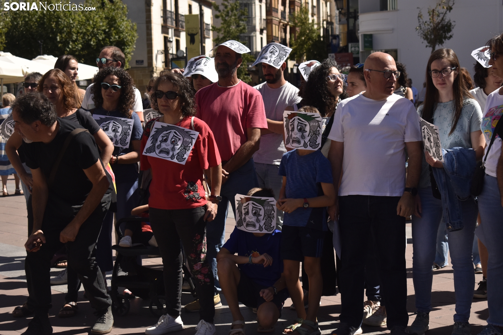 La plaza Mayor ha guardado un silencio sobrecogedor, roto únicamente por el sonido de una melodía. Decenas de sorianos han respondido a la llamada del Movimiento Ciudadano por la Paz, una plataforma con más de dos décadas de activismo en la provincia, para visibilizar la masacre que se está viviendo en la Franja de Gaza y reclamar una respuesta contundente por parte de la comunidad internacional.