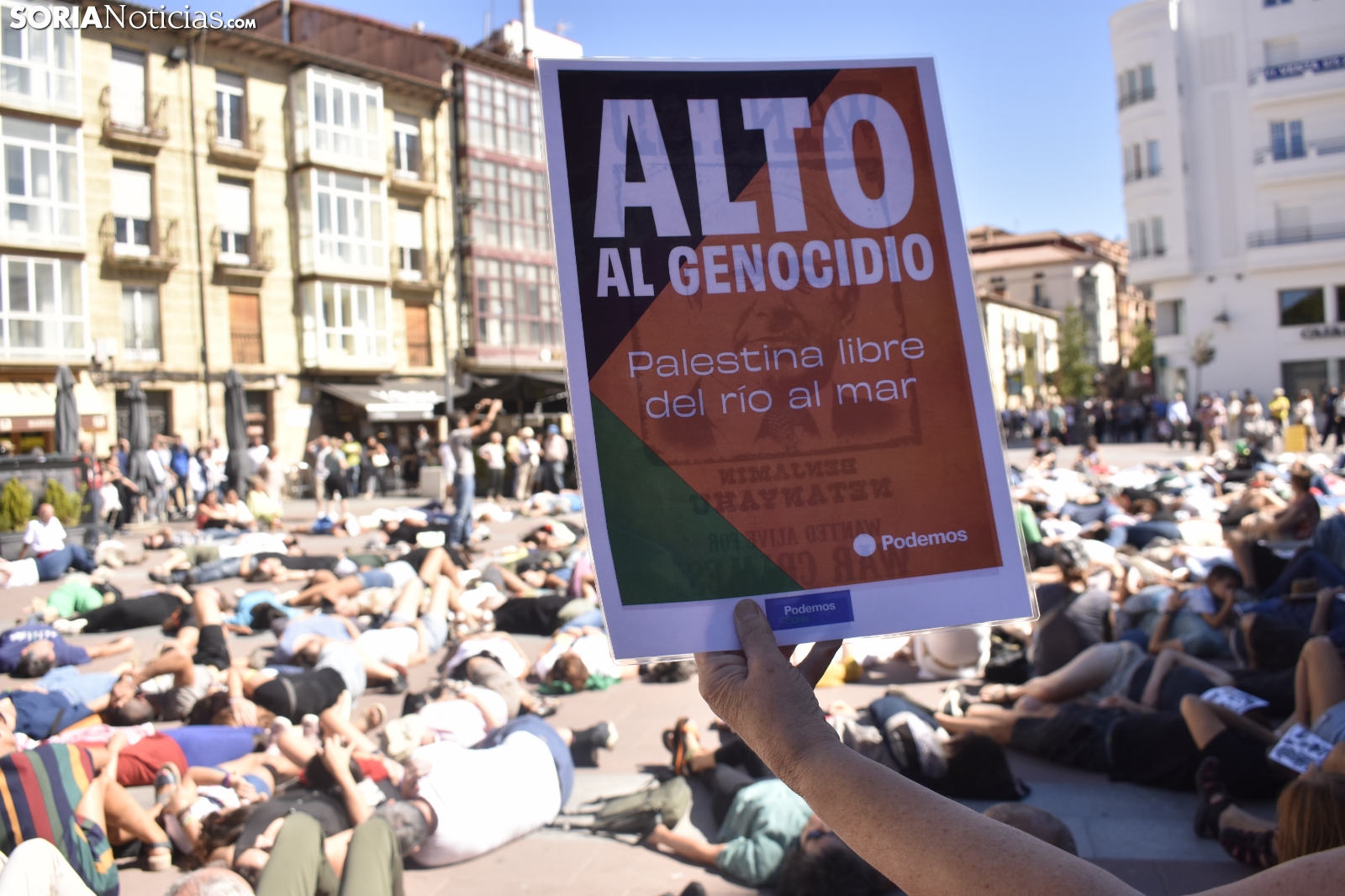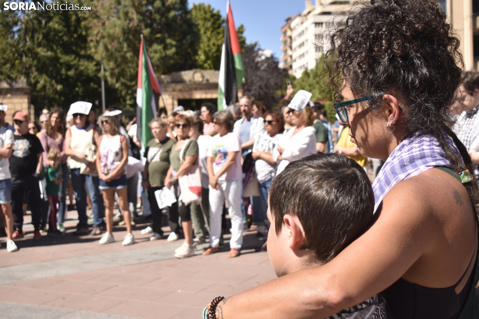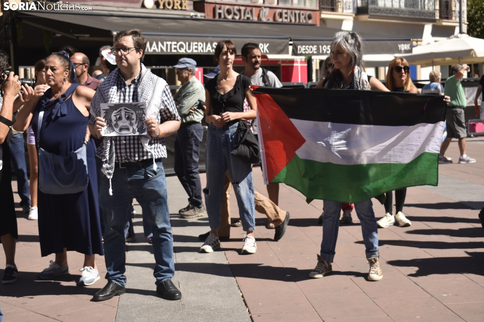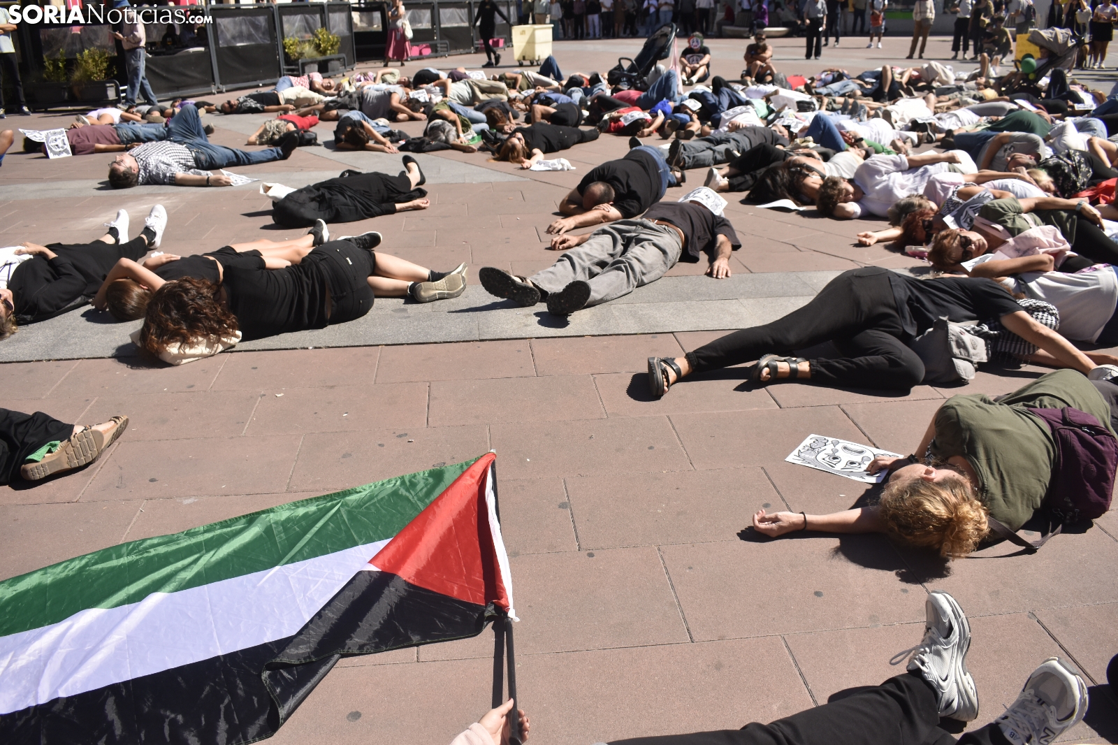 La plaza Mayor ha guardado un silencio sobrecogedor, roto únicamente por el sonido de una melodía. Decenas de sorianos han respondido a la llamada del Movimiento Ciudadano por la Paz, una plataforma con más de dos décadas de activismo en la provincia, para visibilizar la masacre que se está viviendo en la Franja de Gaza y reclamar una respuesta contundente por parte de la comunidad internacional.