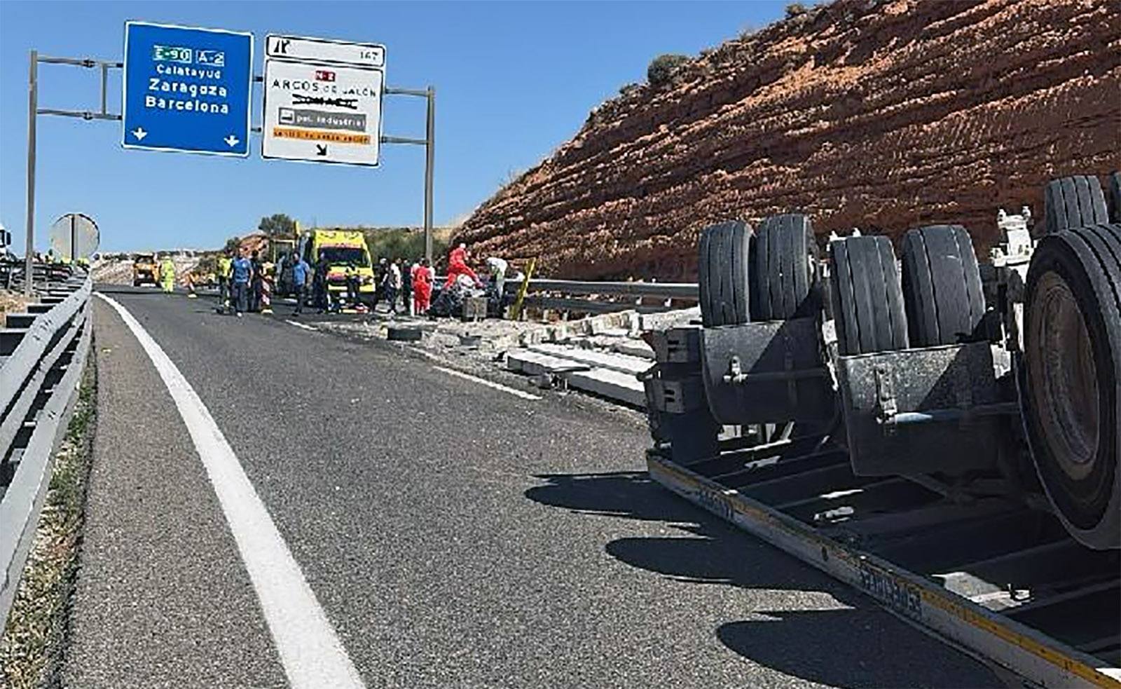 A las 12:02 horas se ha producido el vuelco de un camión que transportaba vigas de hormigón. La carga ha afectado a un turismo y ha quedado esparcida en la calzada. Como consecuencia de este accidente la vía que quedado cortada en el p.k. 167,000 de la A-2.