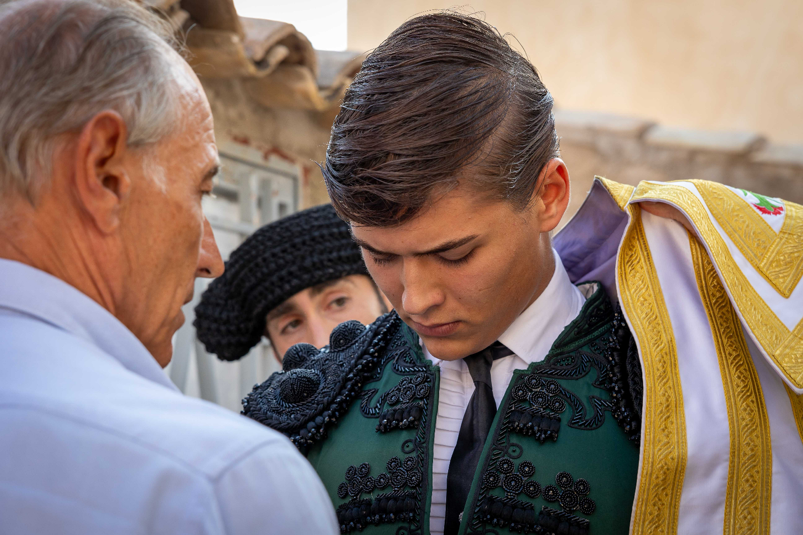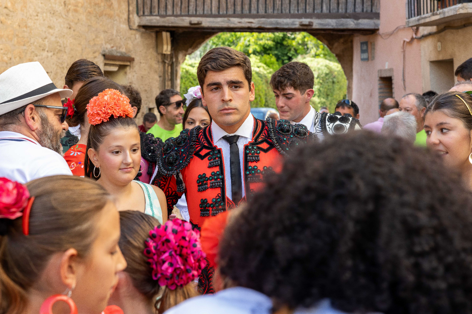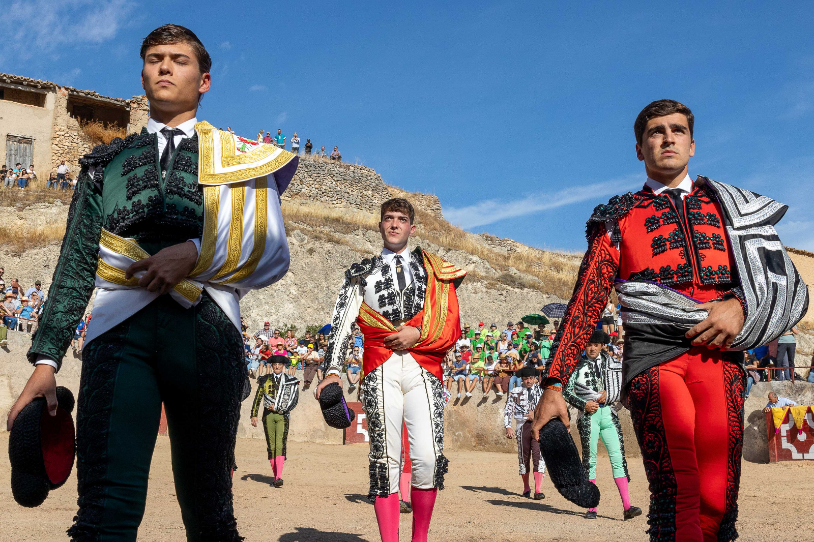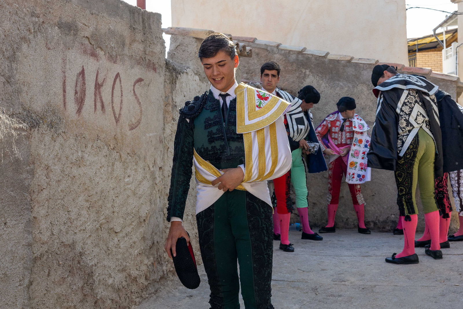 El 'III Trofeo Villa de Deza, homenaje a Salvador Portero' tiene como protagonistas a Juanmi Vidal, Miguel Remiro y el soriano David Espejón, que en este caso actúa como sobresaliente y debe esperar para saber si saltará al ruedo. Los artistas bajan hacia el peculiar ruedo acompañados de su cuadrilla, que arrastra los bártulos propios del toreo por el empedrado, amigos y vecinos, también de otros artistas que inmortalizan el momento. Ellos son Sara y Víctor, Viksar Fotografía, y este es su trabajo que hace justicia a Deza, a su novillada y a su plaza.