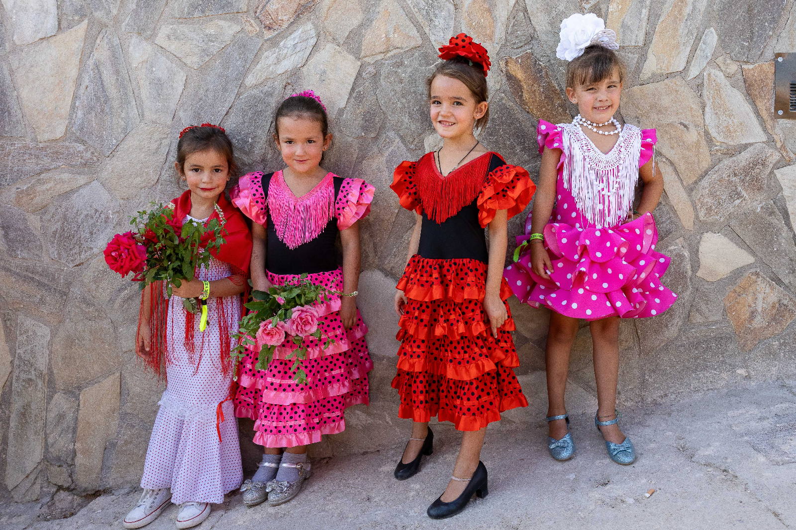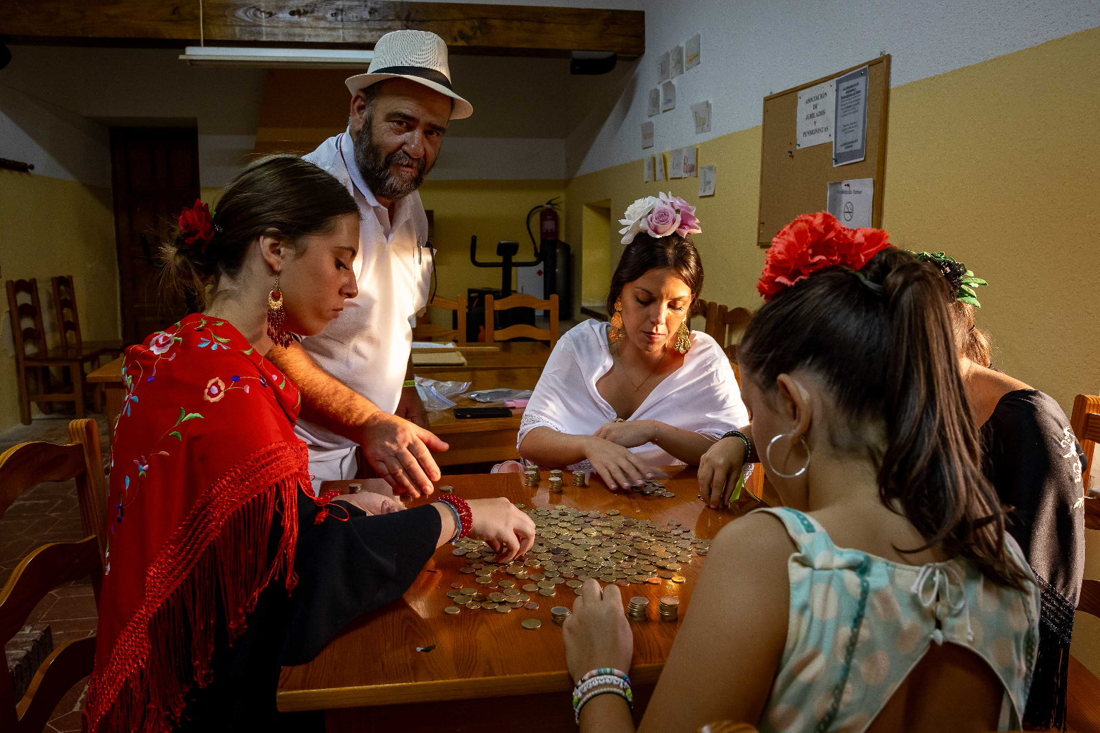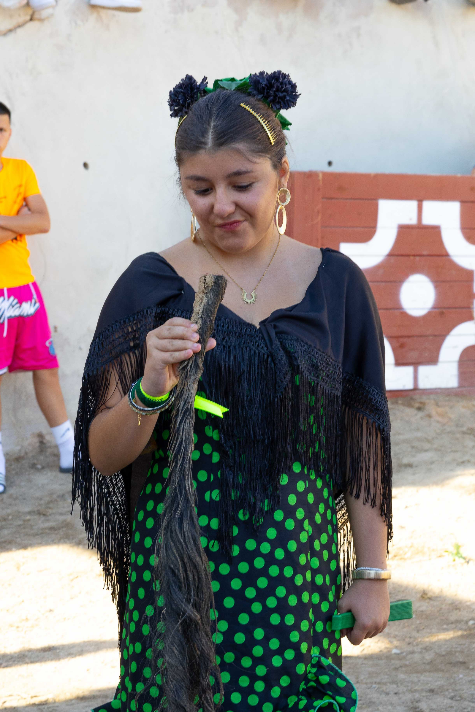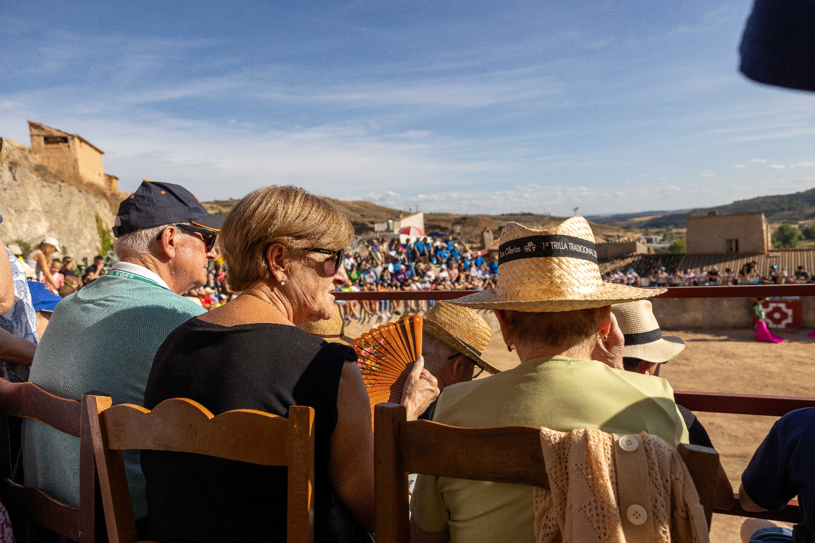 Cabezas que se protegen de un 'Manolo' que cae a plomo cada cuál como marca su personaje en este pequeño teatro de la vida. Flores y peinetas para unas, montera para los diestros. Abanicos para ellas, sombreros de paja para ellos y boina castiza para los paisanos más enterados. Las canas, las calvas y los tintes que dominan las cabezas de los papós reflejan bien la edad media del pueblo, pese a que esta haya bajado considerablemente por las fiestas.