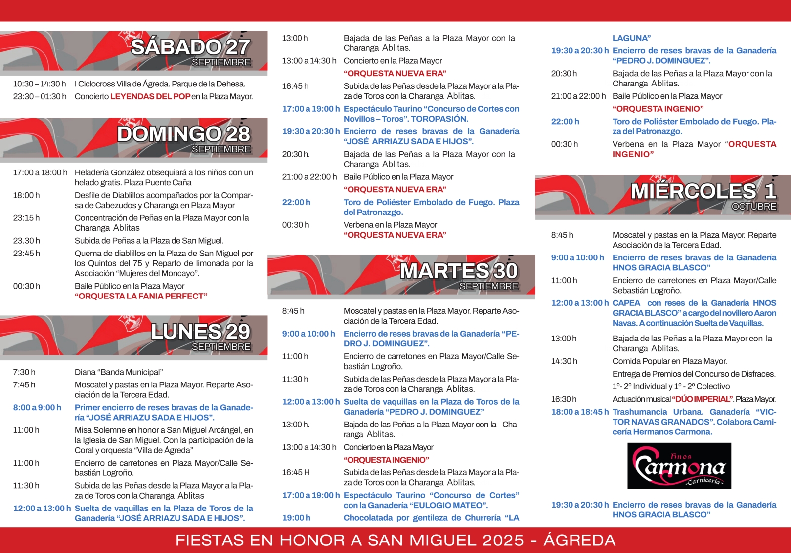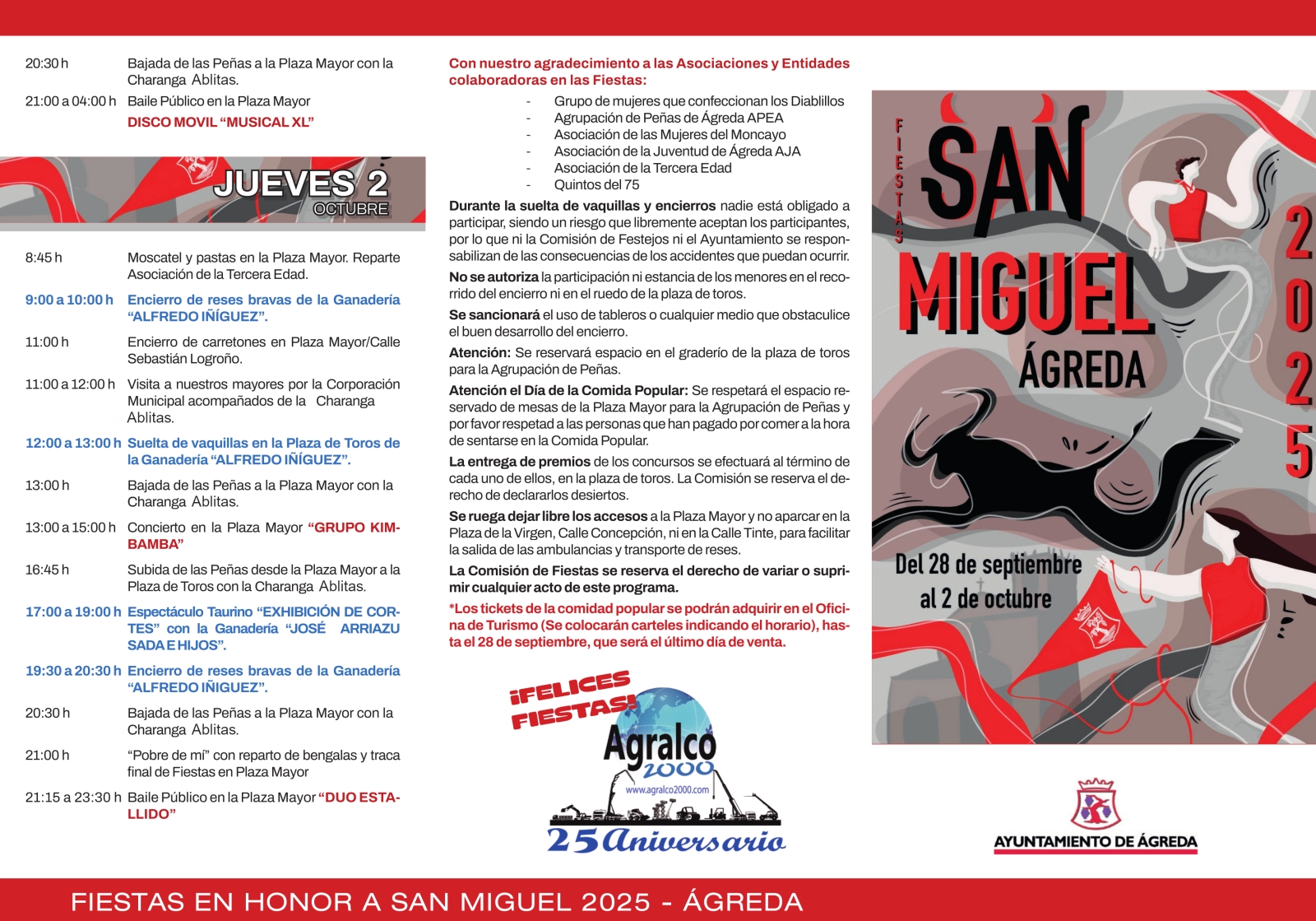 El Ayuntamiento de Ágreda presenta el programa oficial en honor del arcángel en un ciclo que se celebrará del 28 de septiembre al 2 de octubre de 2025. El calendario de actos incluye tradiciones arraigadas como la 'Quema de los Diablillos', los encierros de reses bravas declarados Espectáculo Taurino Tradicional y una comida popular en la plaza Mayor, entre otros.