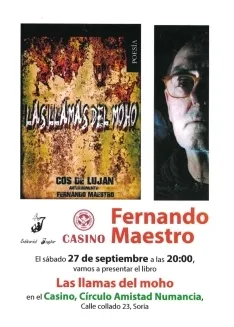 La agenda cultural de Soria tiene este fin de semana una nueva cita literaria. El poeta Fernando Maestro, conocido también por su seudónimo 'Cos de Luján', presenta su última obra, el poemario titulado 'Las llamas del moho', en un acto abierto al público que tendrá lugar en el Círculo Amistad Numancia.