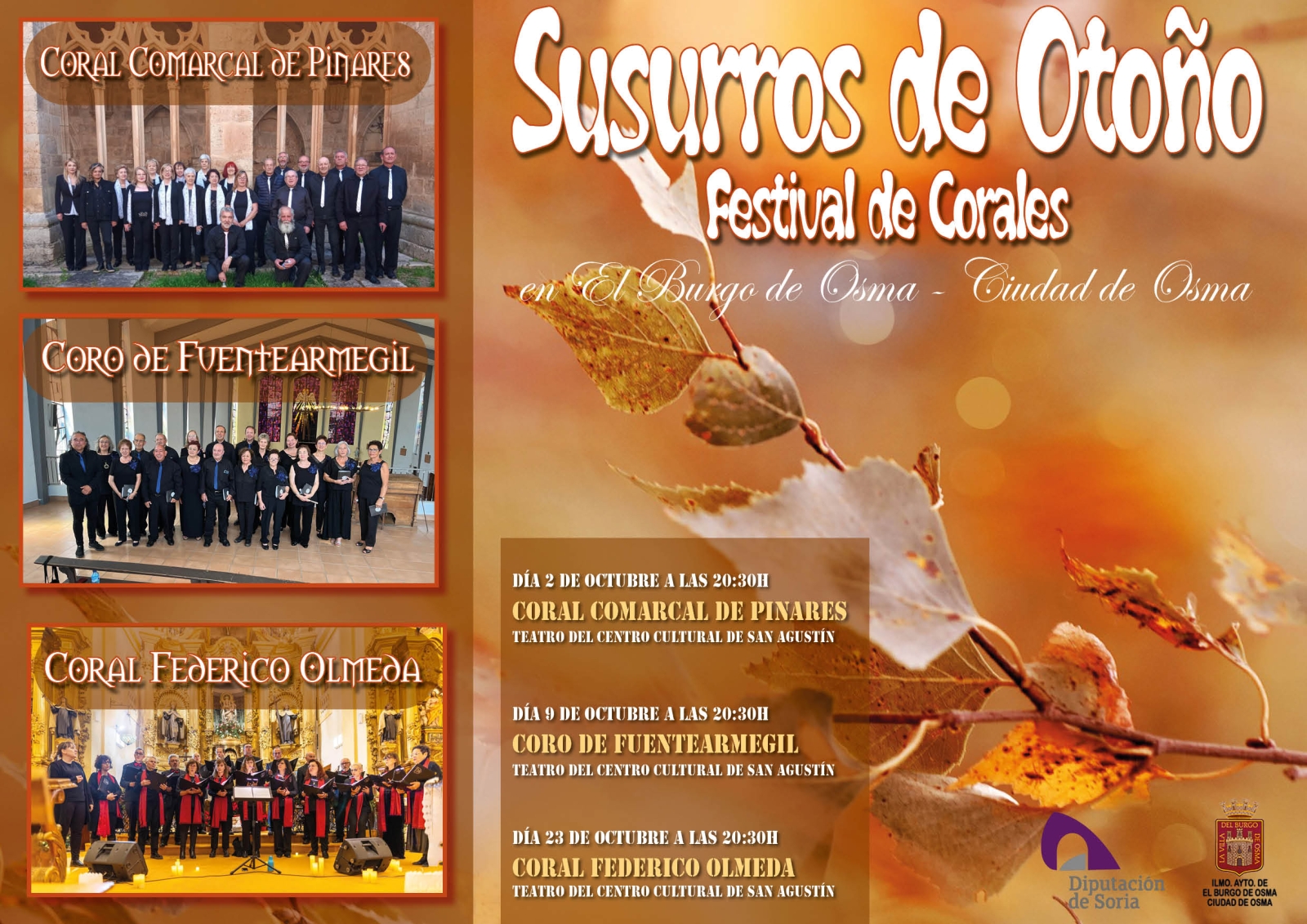 El Ayuntamiento de El Burgo de Osma presenta la segunda edición del ciclo coral 'Susurros de Otoño', que se celebrará los jueves 2, 9 y 23 de octubre. El evento, con entrada libre, tendrá lugar en el Teatro del Centro Cultural de San Agustín y contará con las actuaciones de la Coral Comarcal de Pinares, el Coro de Fuentearmegil y la Coral Federico Olmeda.