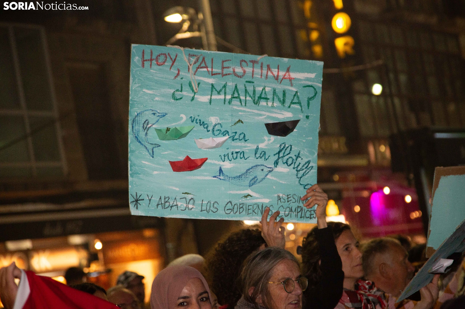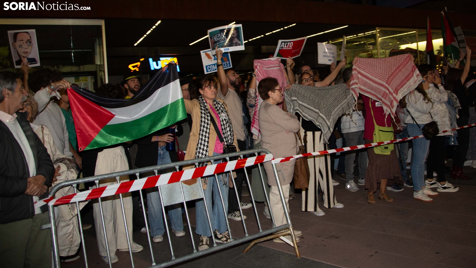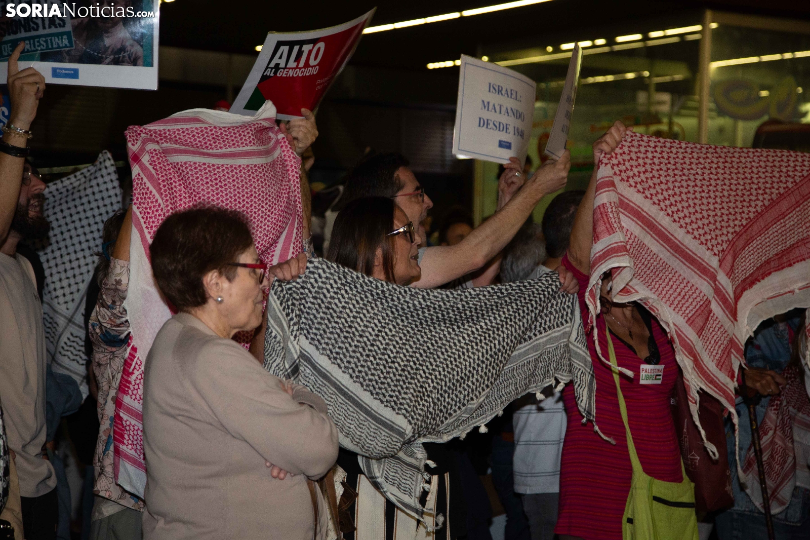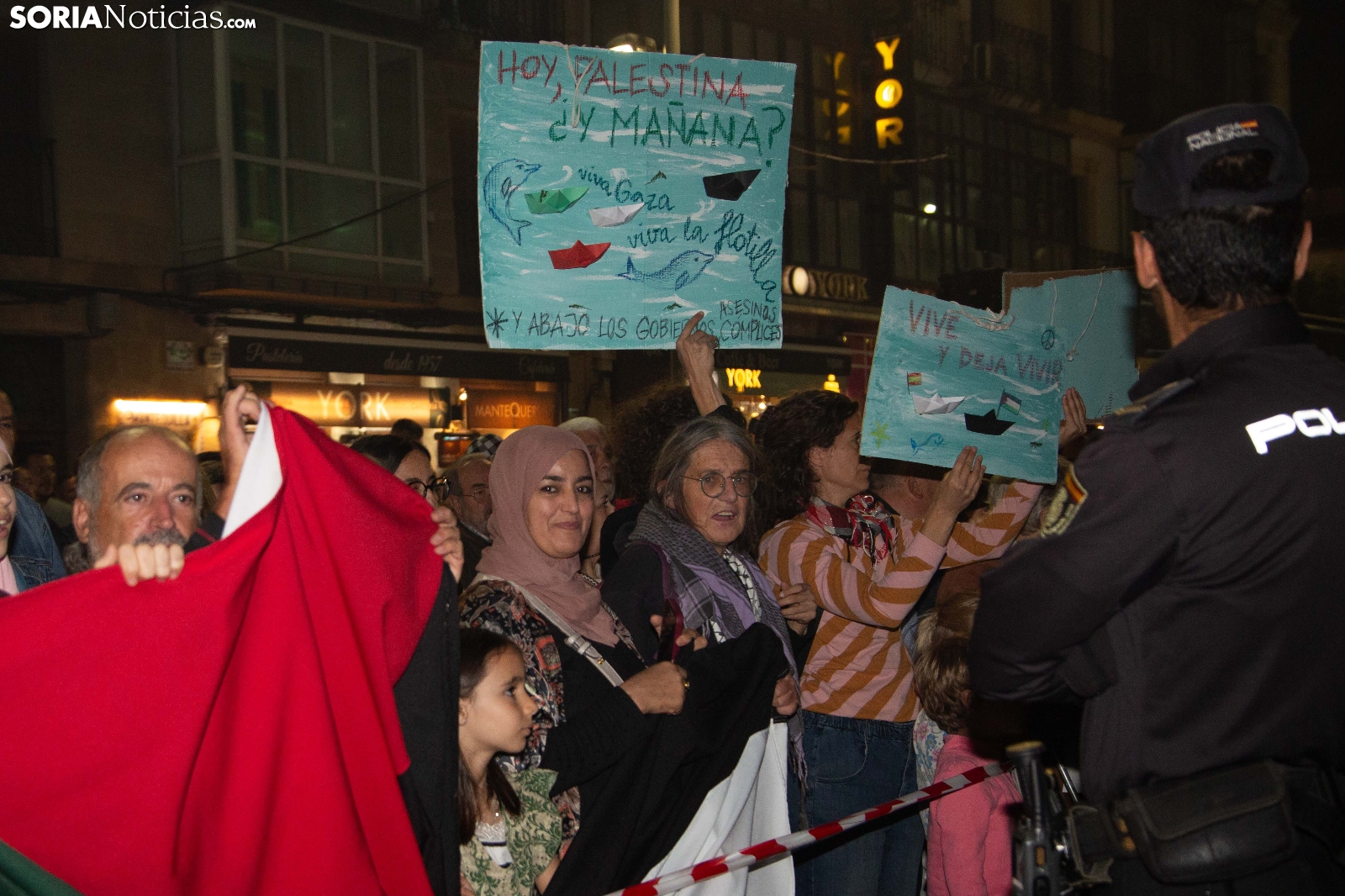 Decenas de personas se han manifestado hoy a favor de la Flotilla y Palestina en la plaza Mariano Granados de la capital a la llegada de la procesión de San Saturio en el día del patrón de la ciudad.