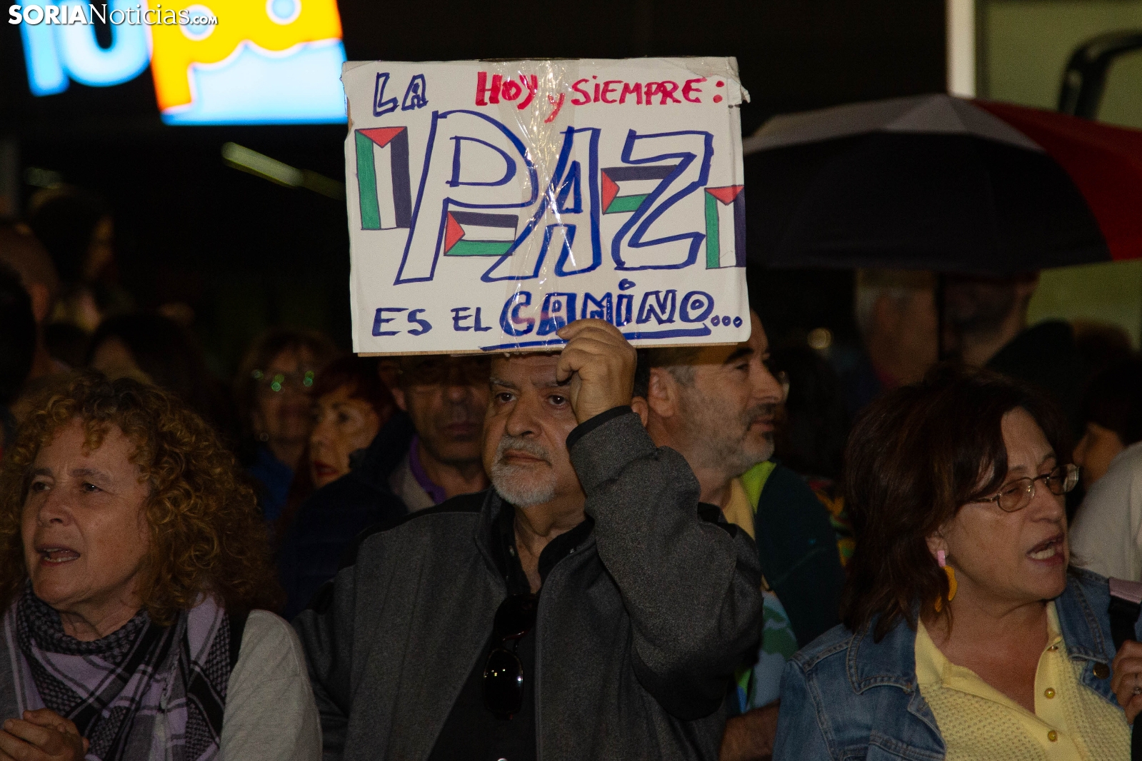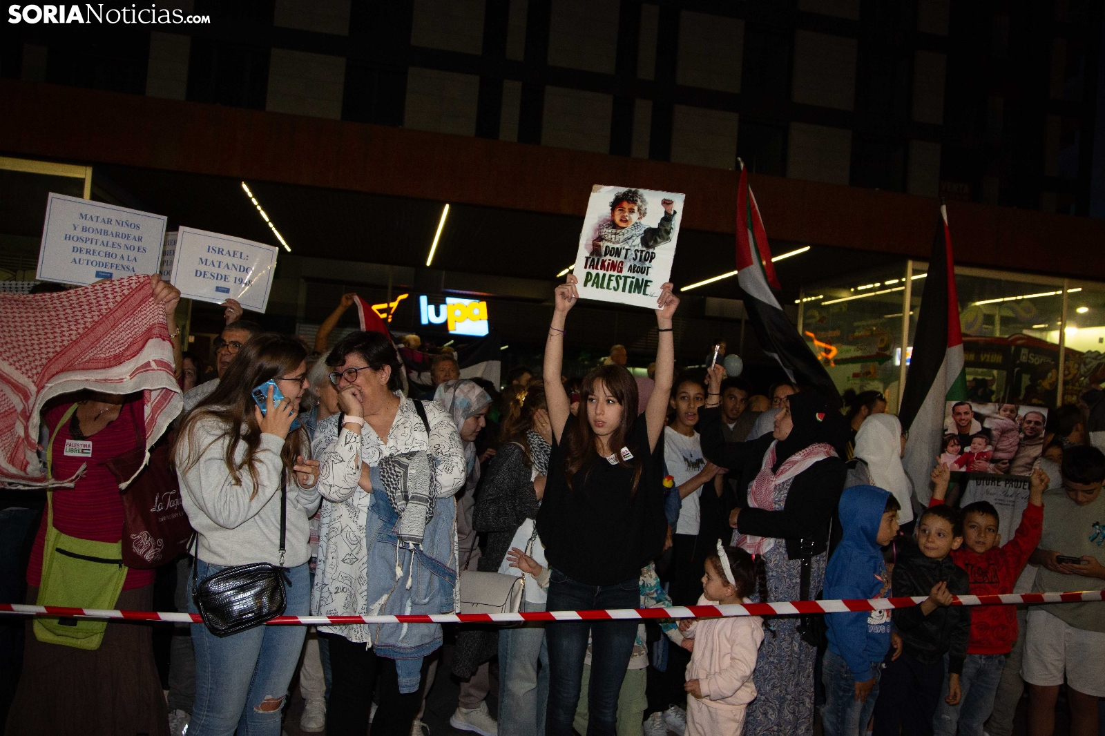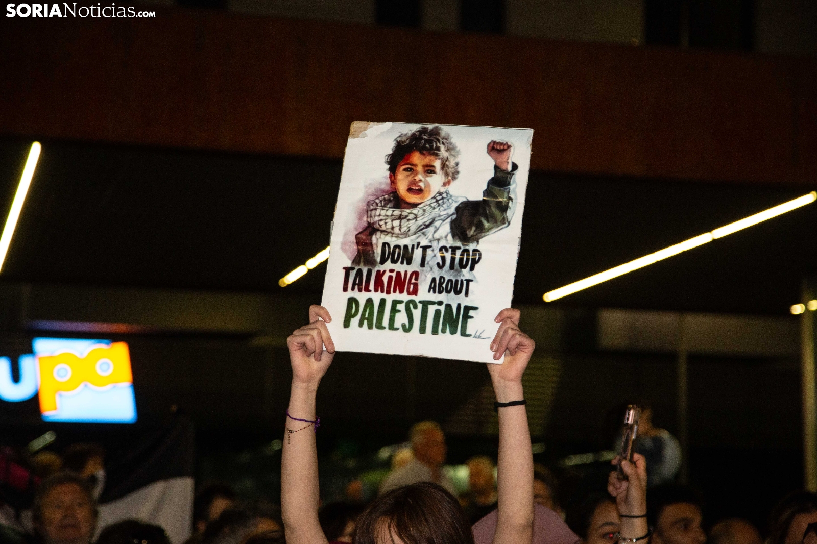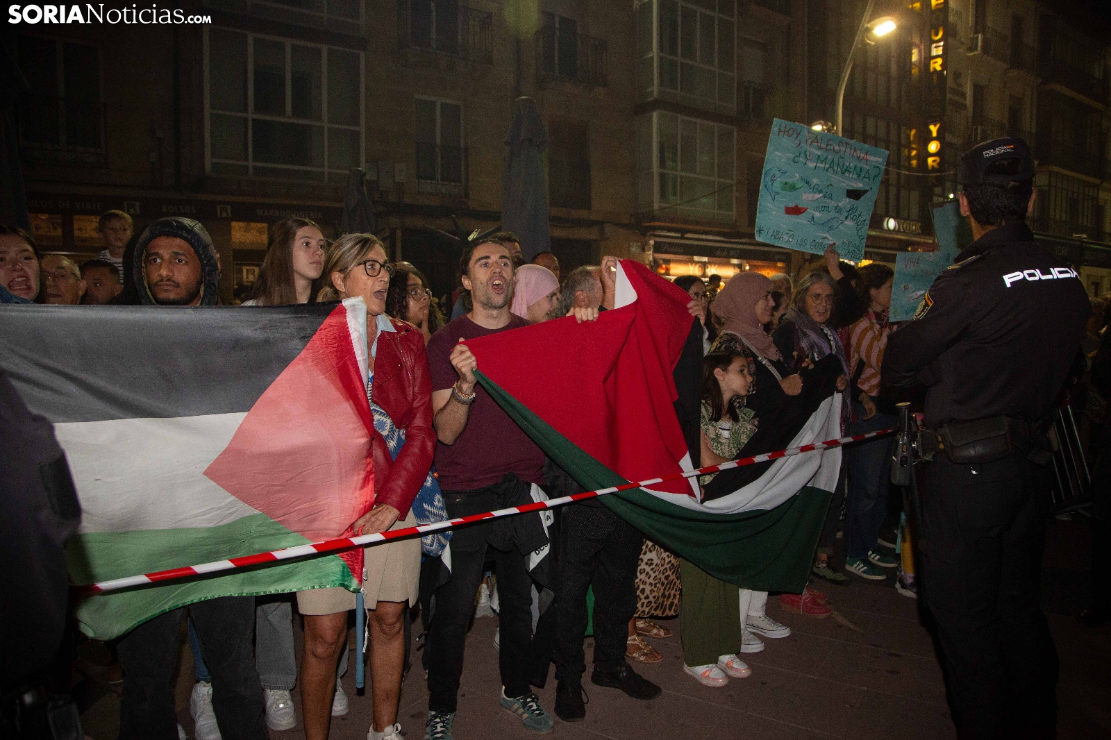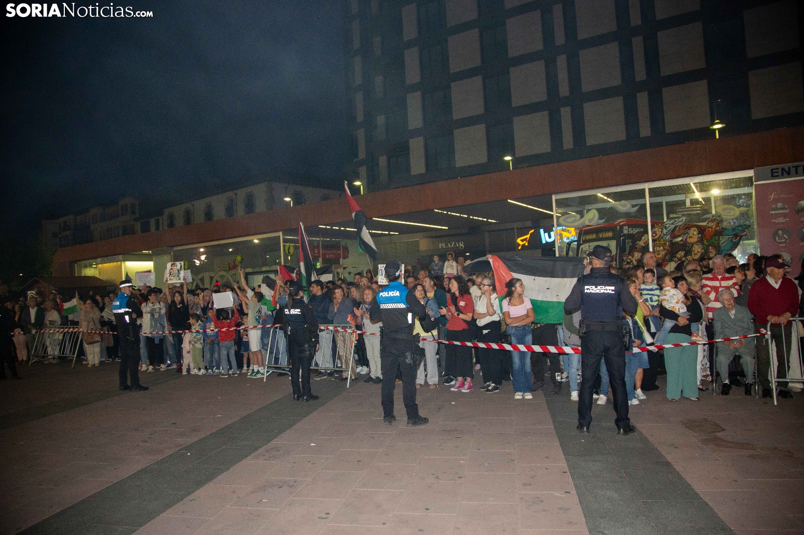 Decenas de personas se han manifestado hoy a favor de la Flotilla y Palestina en la plaza Mariano Granados de la capital a la llegada de la procesión de San Saturio en el día del patrón de la ciudad.