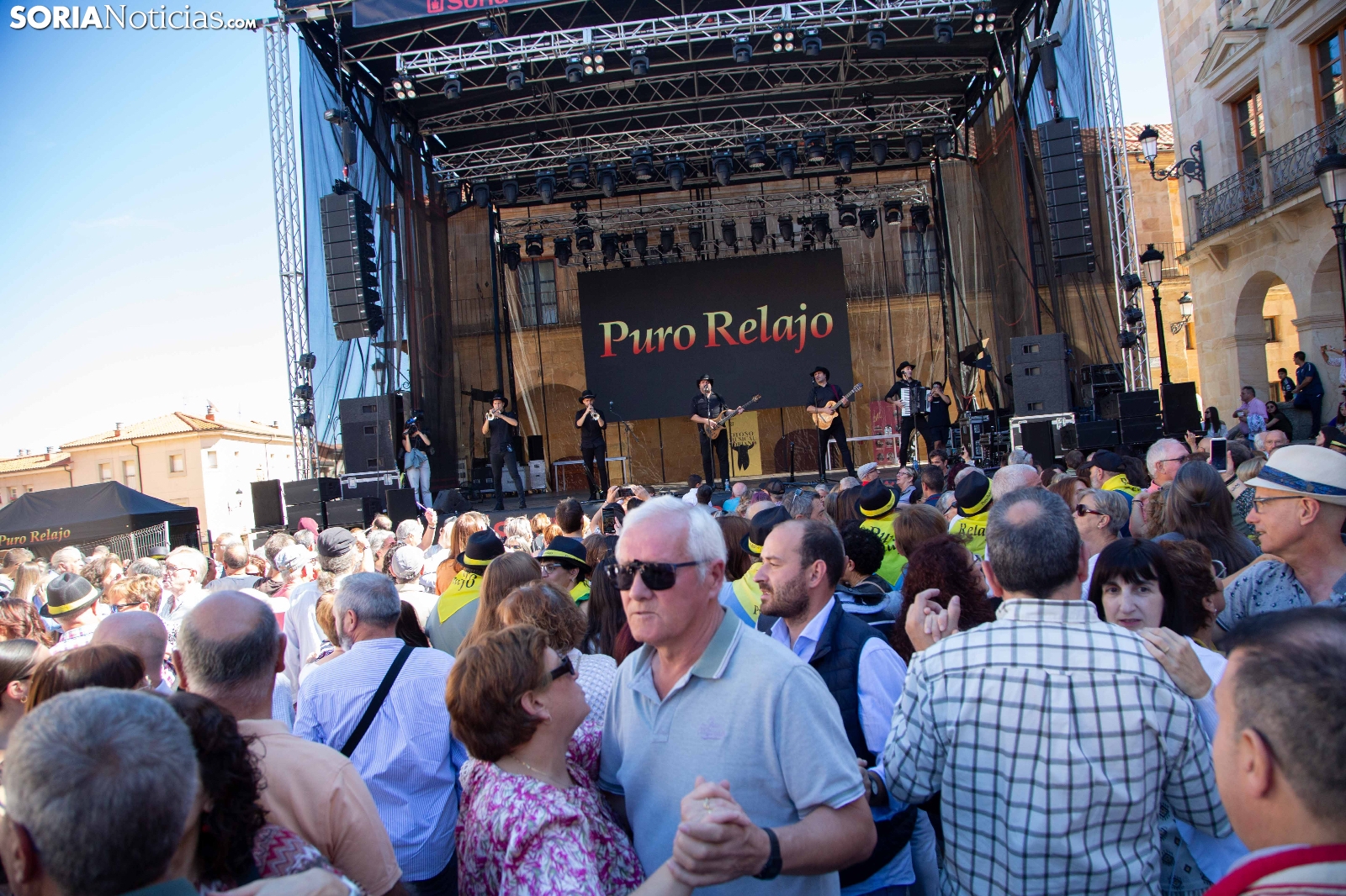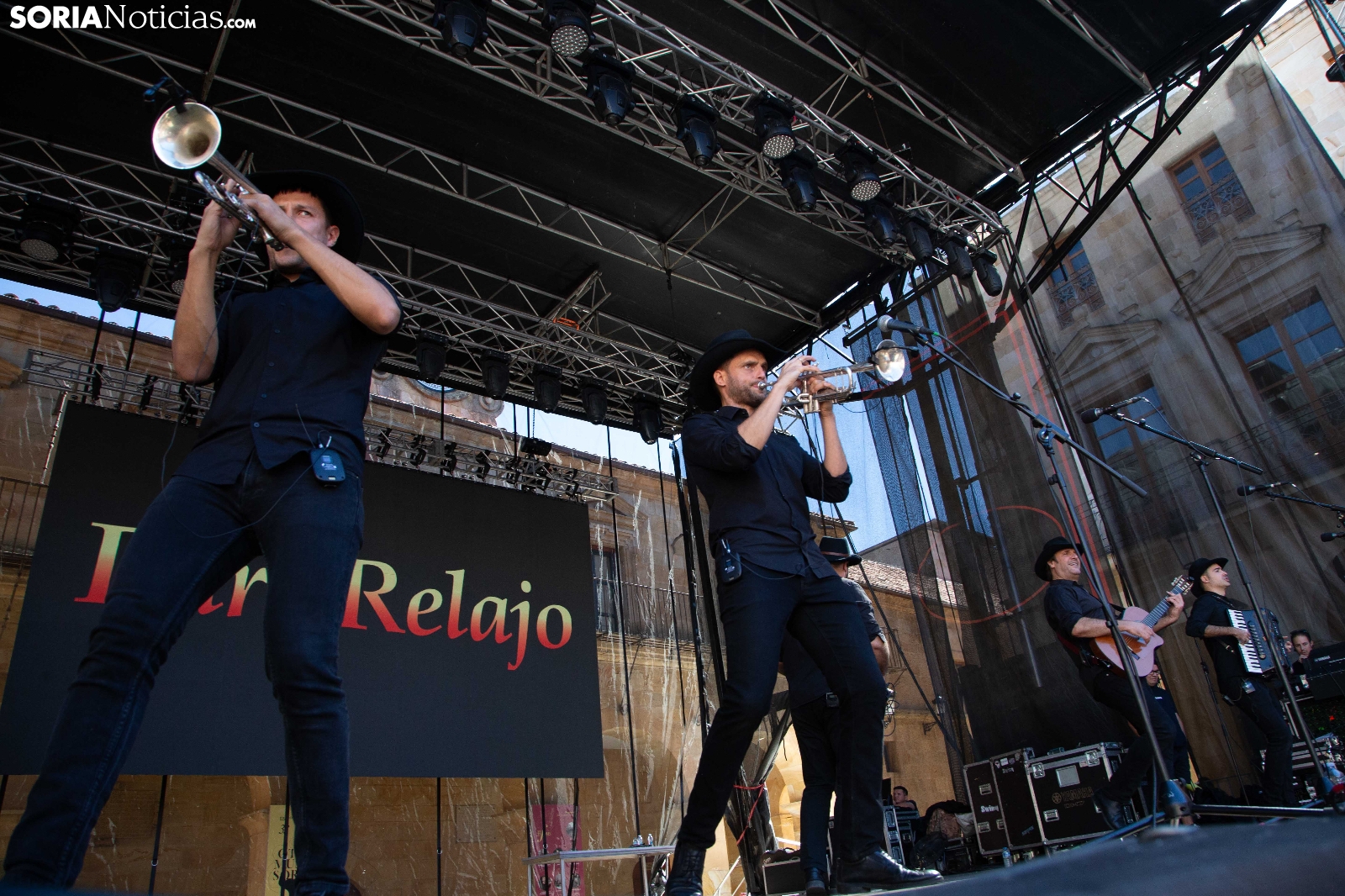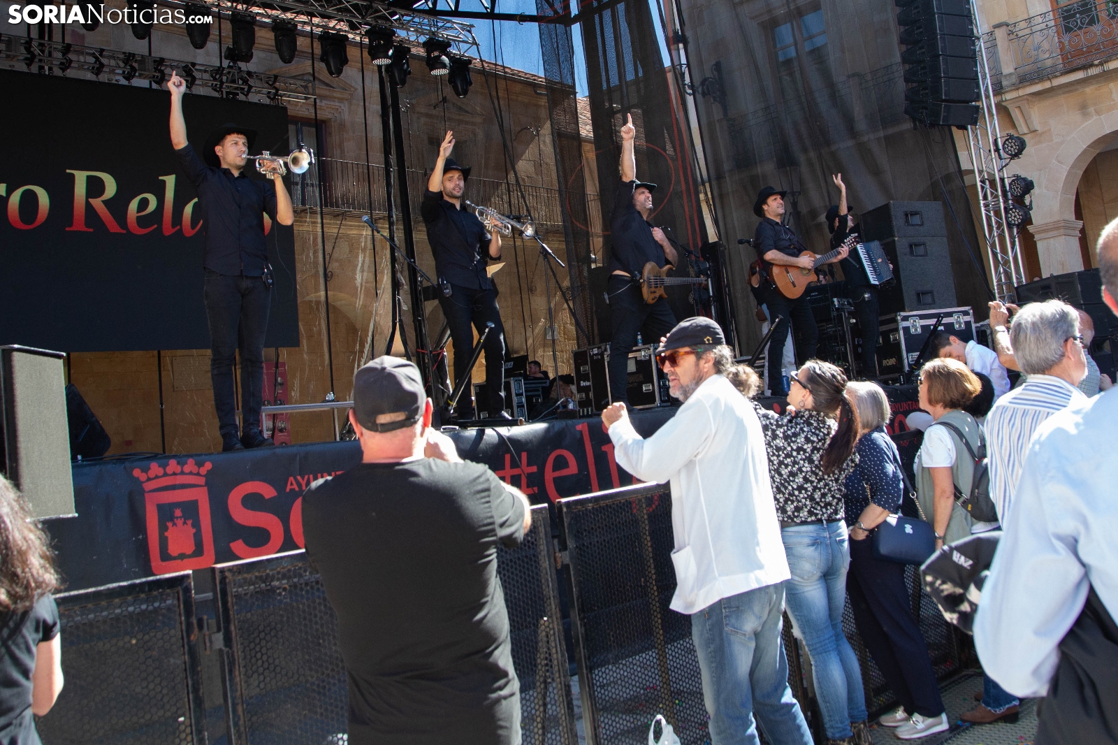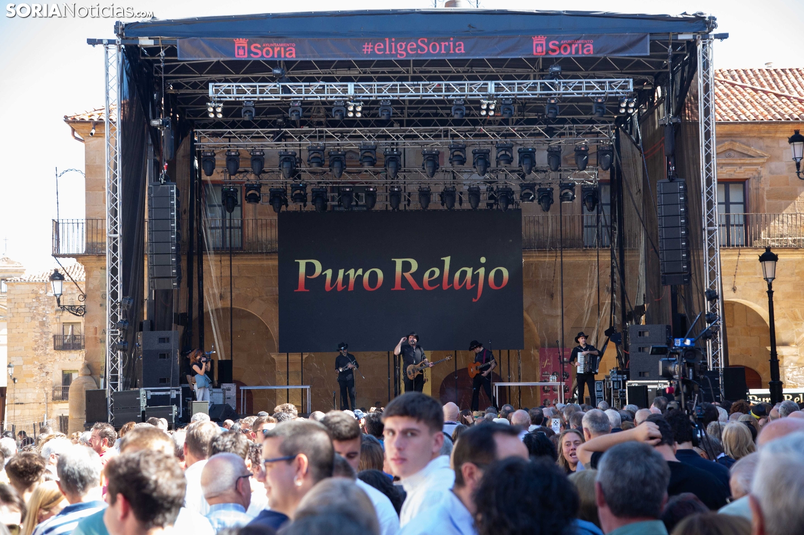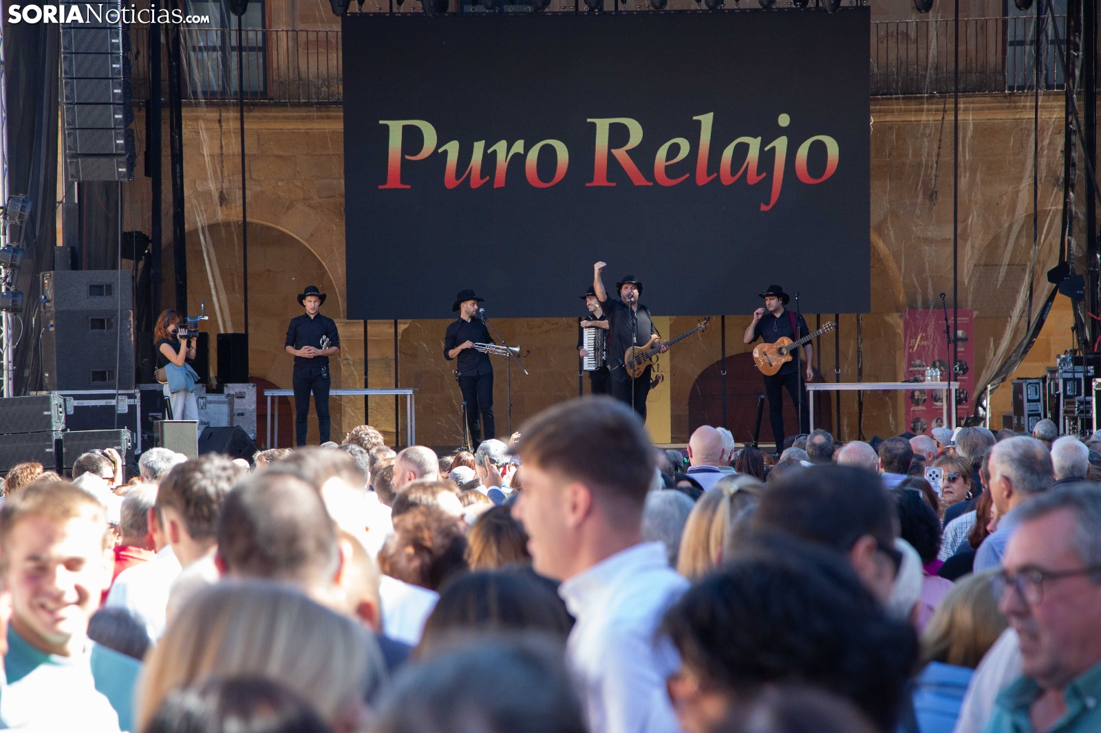 La Plaza Mayor de Soria ha sido el corazón de la celebración de San Saturio durante el mediodía de hoy. El esperado concierto del grupo Puro Relajo ha llenado por completo el céntrico espacio de sorianos y visitantes que no han querido perderse una de las citas musicales más destacadas del programa festivo. Al ritmo de sus conocidas y enérgicas rancheras, la formación ha hecho vibrar al público, que se ha entregado desde el primer momento animándose a cantar los estribillos y a bailar en un ambiente de gran alegría. Este vermú-concierto se consolida como un acto de gran éxito popular que pone la banda sonora al día grande de la capital, demostrando la excelente acogida que la música del grupo tiene entre los asistentes de todas las edades.
