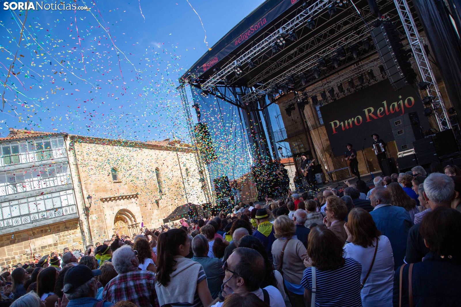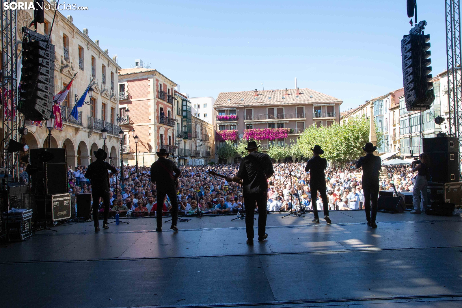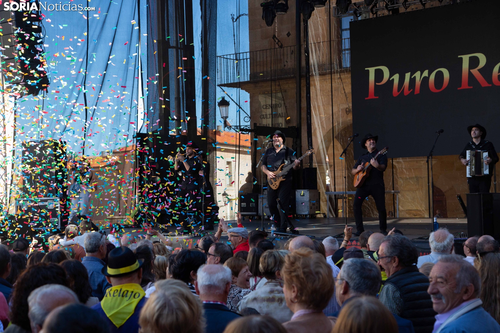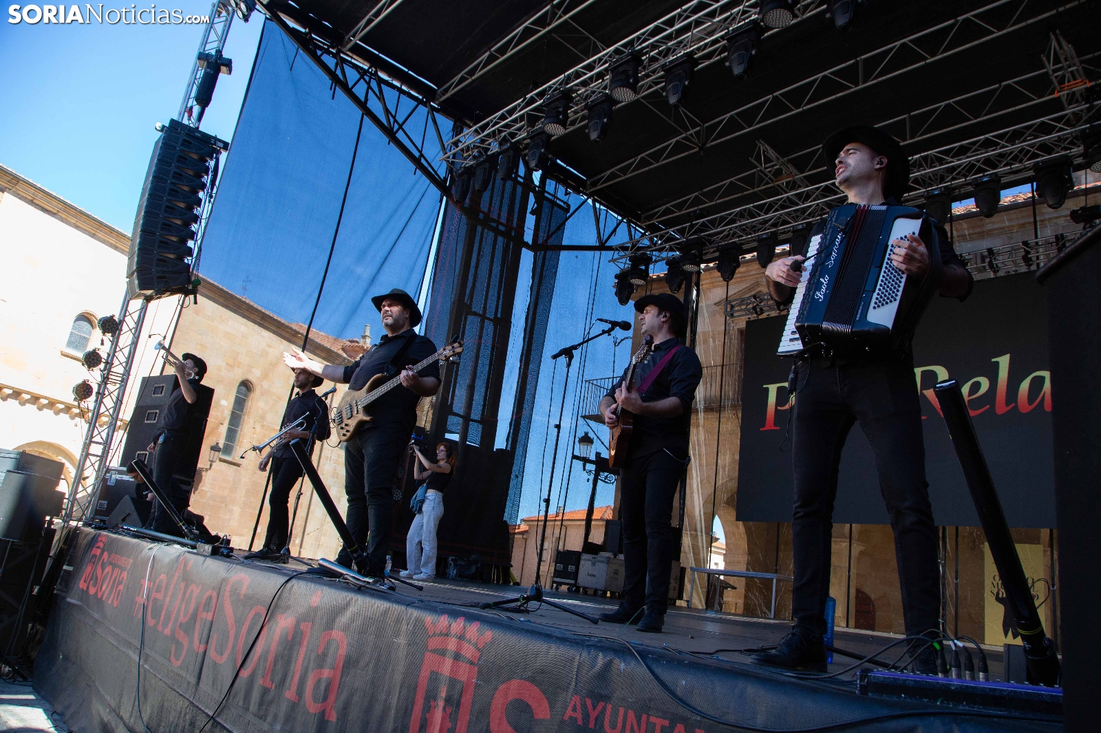 La Plaza Mayor de Soria ha sido el corazón de la celebración de San Saturio durante el mediodía de hoy. El esperado concierto del grupo Puro Relajo ha llenado por completo el céntrico espacio de sorianos y visitantes que no han querido perderse una de las citas musicales más destacadas del programa festivo. Al ritmo de sus conocidas y enérgicas rancheras, la formación ha hecho vibrar al público, que se ha entregado desde el primer momento animándose a cantar los estribillos y a bailar en un ambiente de gran alegría. Este vermú-concierto se consolida como un acto de gran éxito popular que pone la banda sonora al día grande de la capital, demostrando la excelente acogida que la música del grupo tiene entre los asistentes de todas las edades.