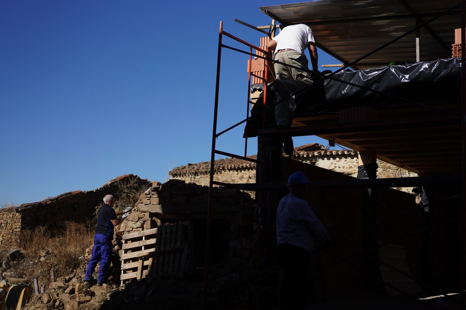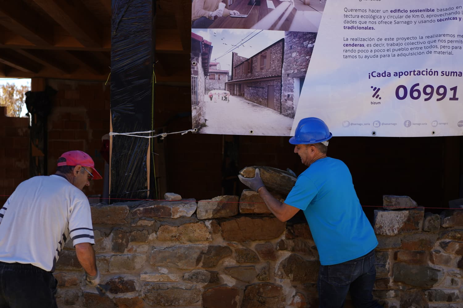 Centrados en el reto que tienen por delante, los integrantes de la Agrupación son los que llevan a cabo las labores de construcción. Convocando varias hacenderas, se reúnen siempre que pueden para ir avanzando en el proyecto. Hasta la fecha ya han llevado a cabo diez encuentros de este tiempo. La última en el día de hoy. En ella, se han dado cita 31 personas, procedentes de Sarnago, de San Pedro Manrique o de Acrijos, entre otros lugares: “No sabemos las que nos faltarán. No es por tiempo ni por ganas. Depende del dinero que vayamos obteniendo”.