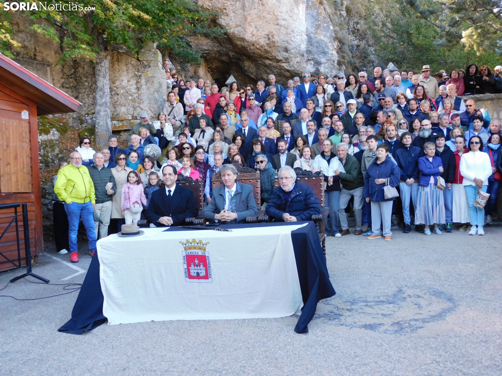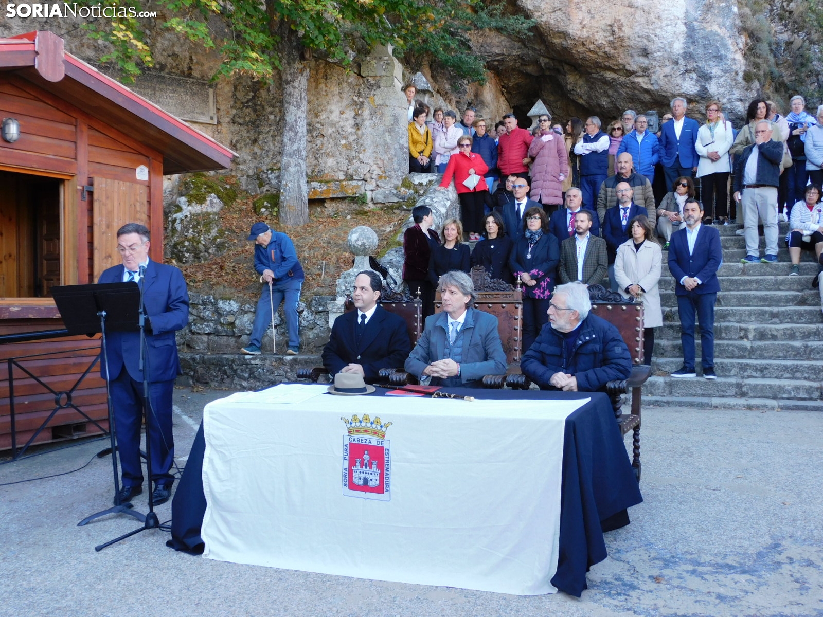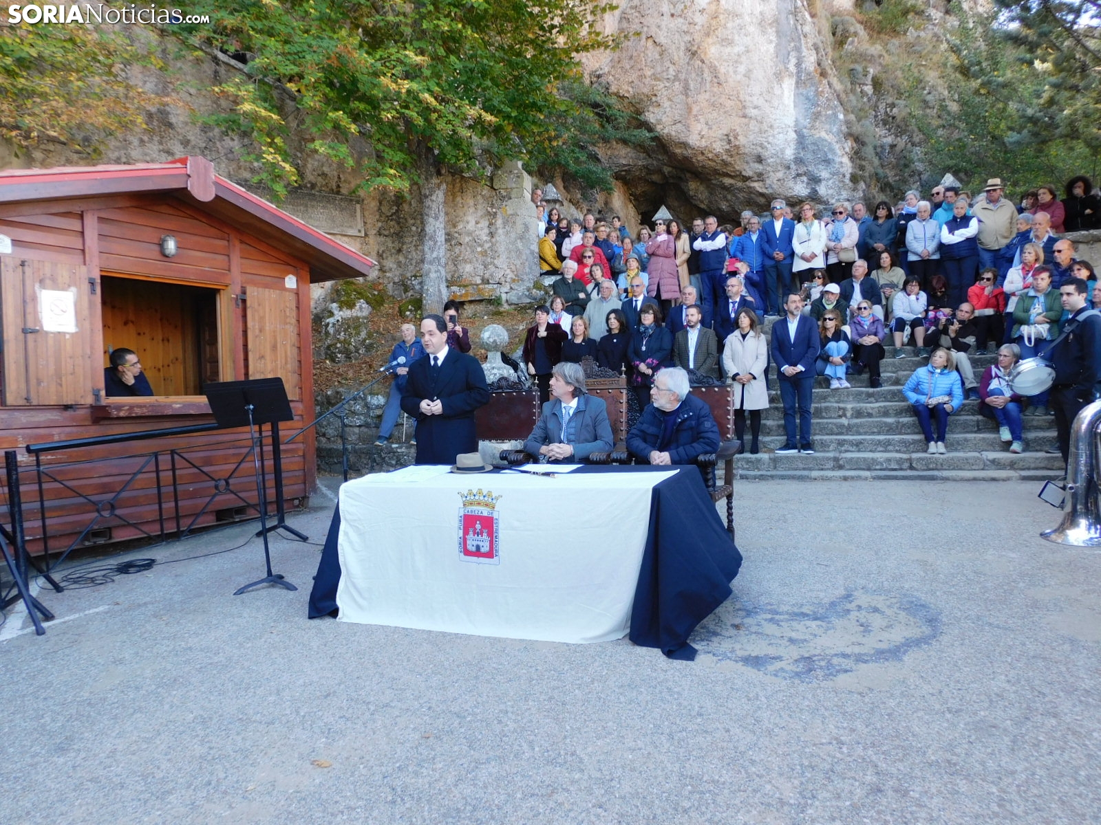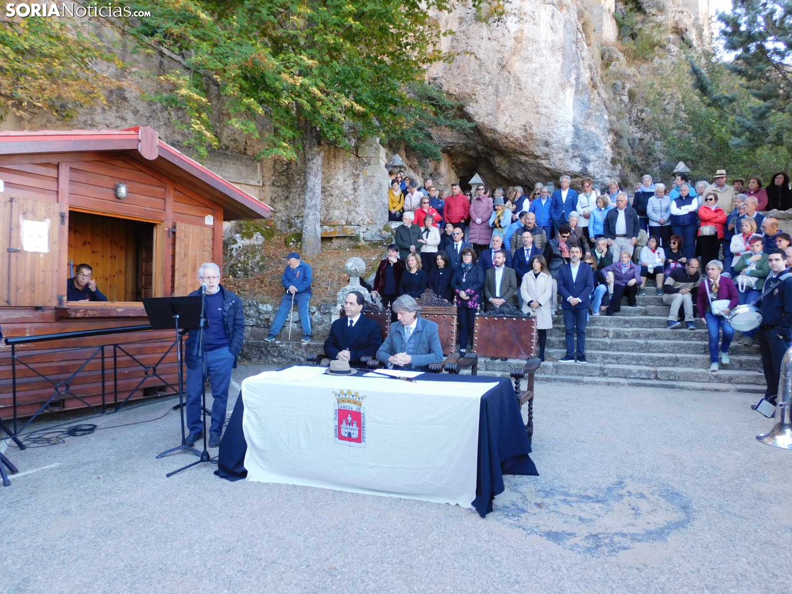 El Ayuntamiento de Soria ha querido homenajear esta mañana a la figura de Antonio Machado en el 150 aniversario del nacimiento del poeta. El Consistorio decidió recrear el día (5 de octubre de 1.932) en el que el escritor fue nombrado hijo predilecto de la ciudad, llevando a cabo un acto muy similar en la misma ubicación, la Plazoleta de San Saturio. Junto al alcalde de la ciudad, Carlos Martínez, y el historiador, Juan Antonio Gómez Barrera, ha estado presente un actor que ha encarnado a Antonio Machado. Este ha leído un discurso muy emotivo que ha provocado los aplausos de todos los presentes. Seguidamente, el primer edil de la ciudad ha leído un discurso en el que ha hecho hincapié en que el pensamiento machadiano es más necesario que nunca, refiriéndose a la necesidad de humanizar el mundo, recordando lo que está pasando en Palestina. Por último, se ha recreado la foto que se hizo en 1.932, con decenas de personas en las escaleras que conducen a la ermita. La Banda de Música tampoco ha faltado a la cita, poniendo el broche de oro al evento.