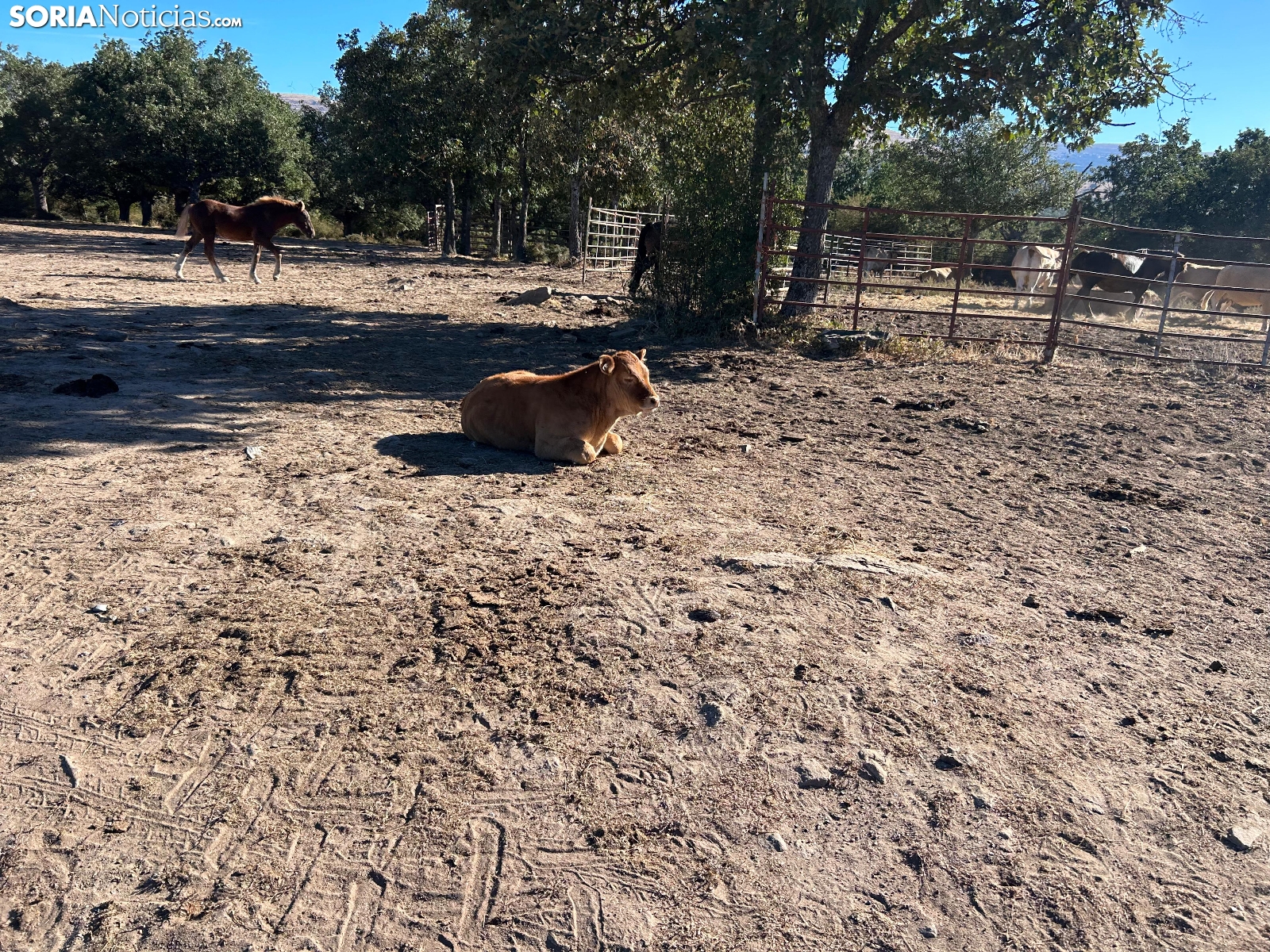 Después de un kilómetro y medio, cruzamos la vía con mucho cuidado para entrar en la pista que conduce a la ermita. El camino está muy bien señalado con un cartel de madera que se ve perfectamente. Tras unos metros, entramos en la dehesa de San Andrés y de Almarza. Aprovechando la sombra que dan los robles, continuamos por una superficie llana, apta para hacer con familia o amigos, justo antes de toparnos con un cercado en el que pastan numerosas vacas, terneros, caballos y potros. Atravesando un paso canadiense, sistema para que no se puedan escapar los animales, pasamos a escasos metros del ganado.
